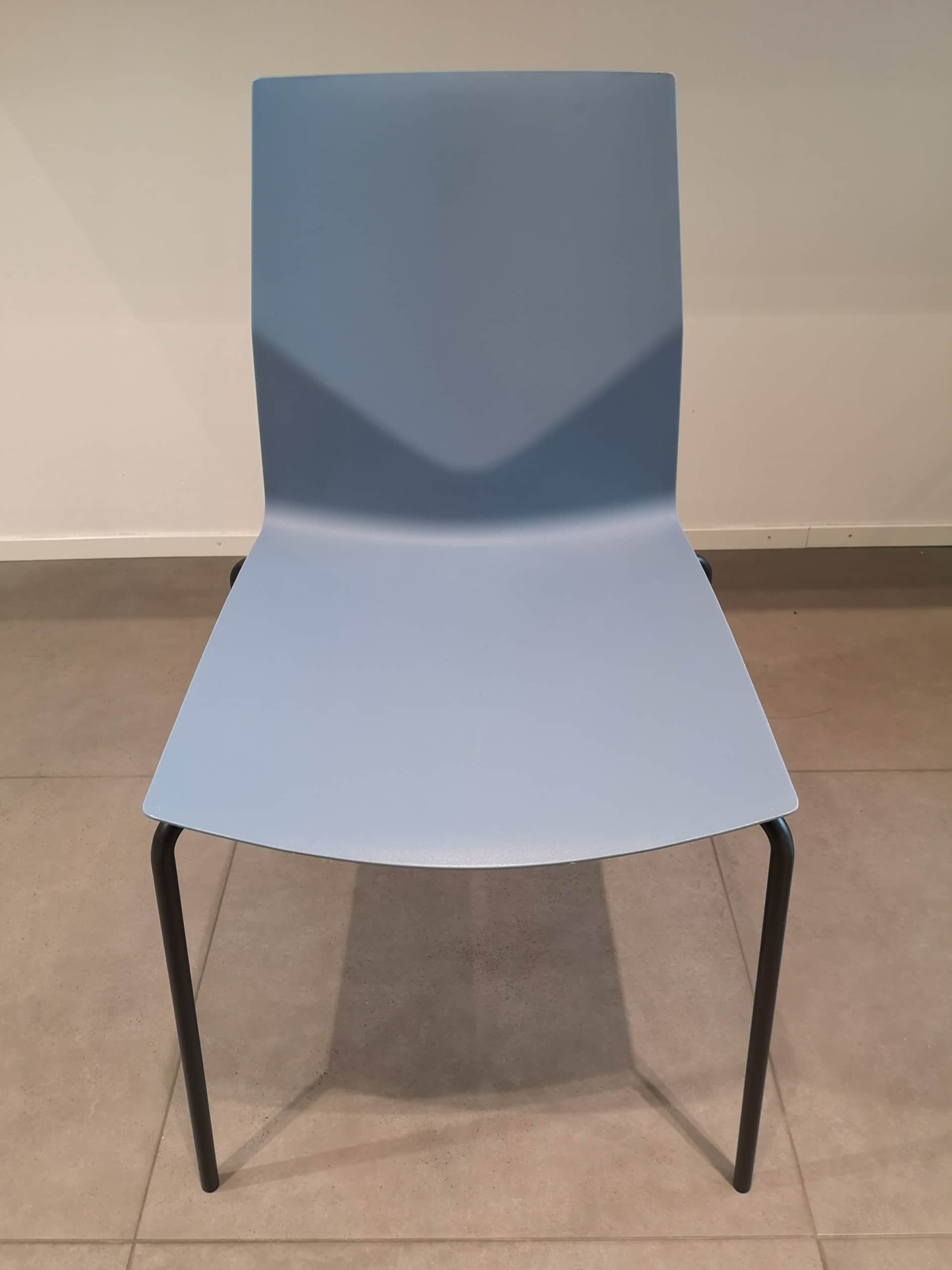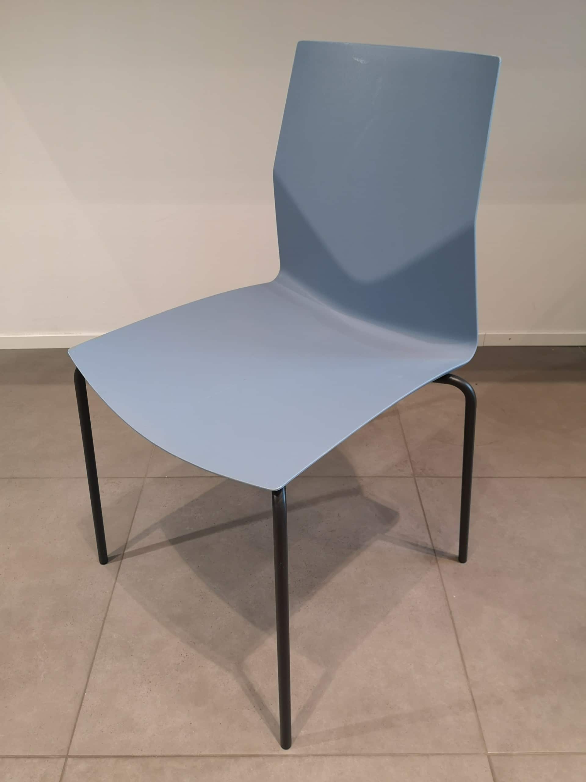 Sits och rygg i plast (blå). Ben i metall (svart).