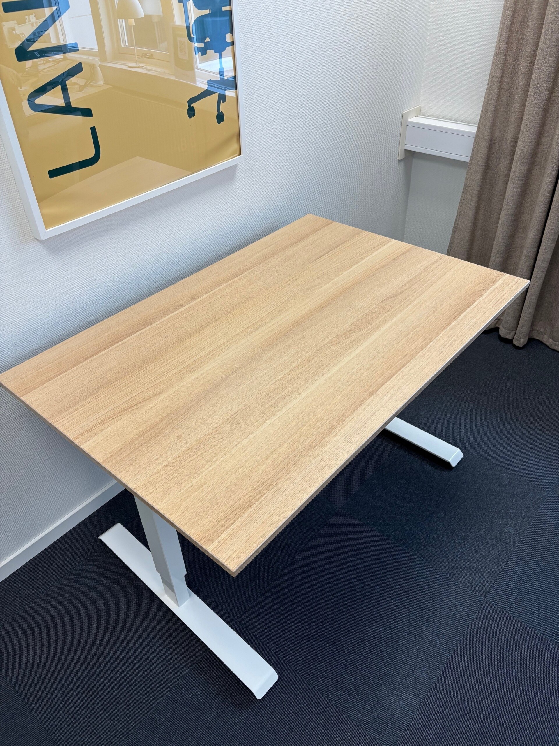 Bordsskiva i laminat (ek). Underrede i metall (vit). Höj- och sänkbart.