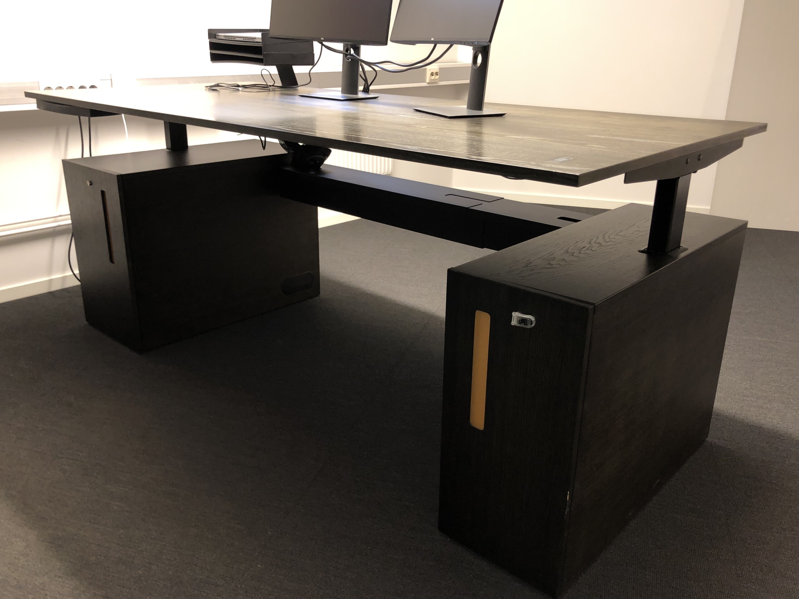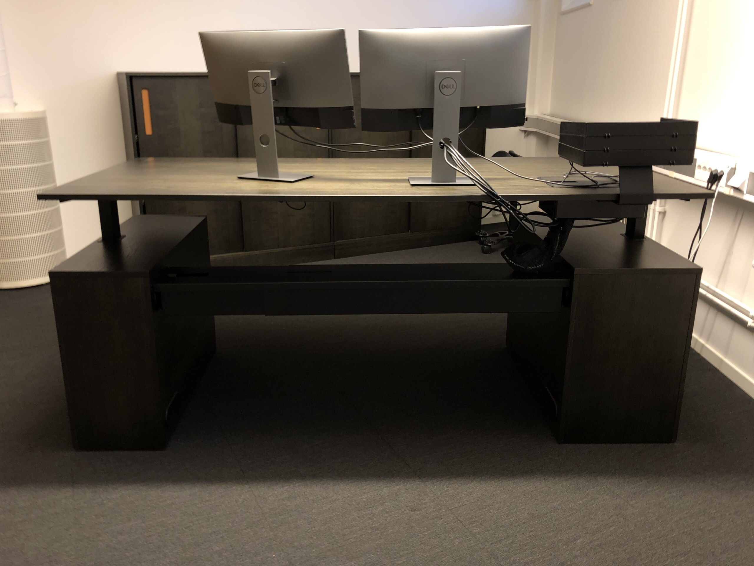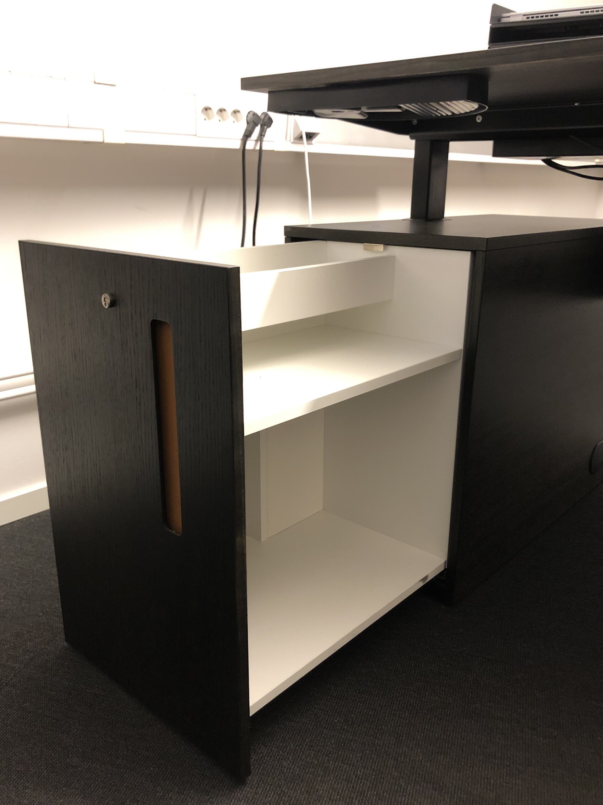 Bordsskiva och underrede i trä (svart). Höj- och sänkbart.