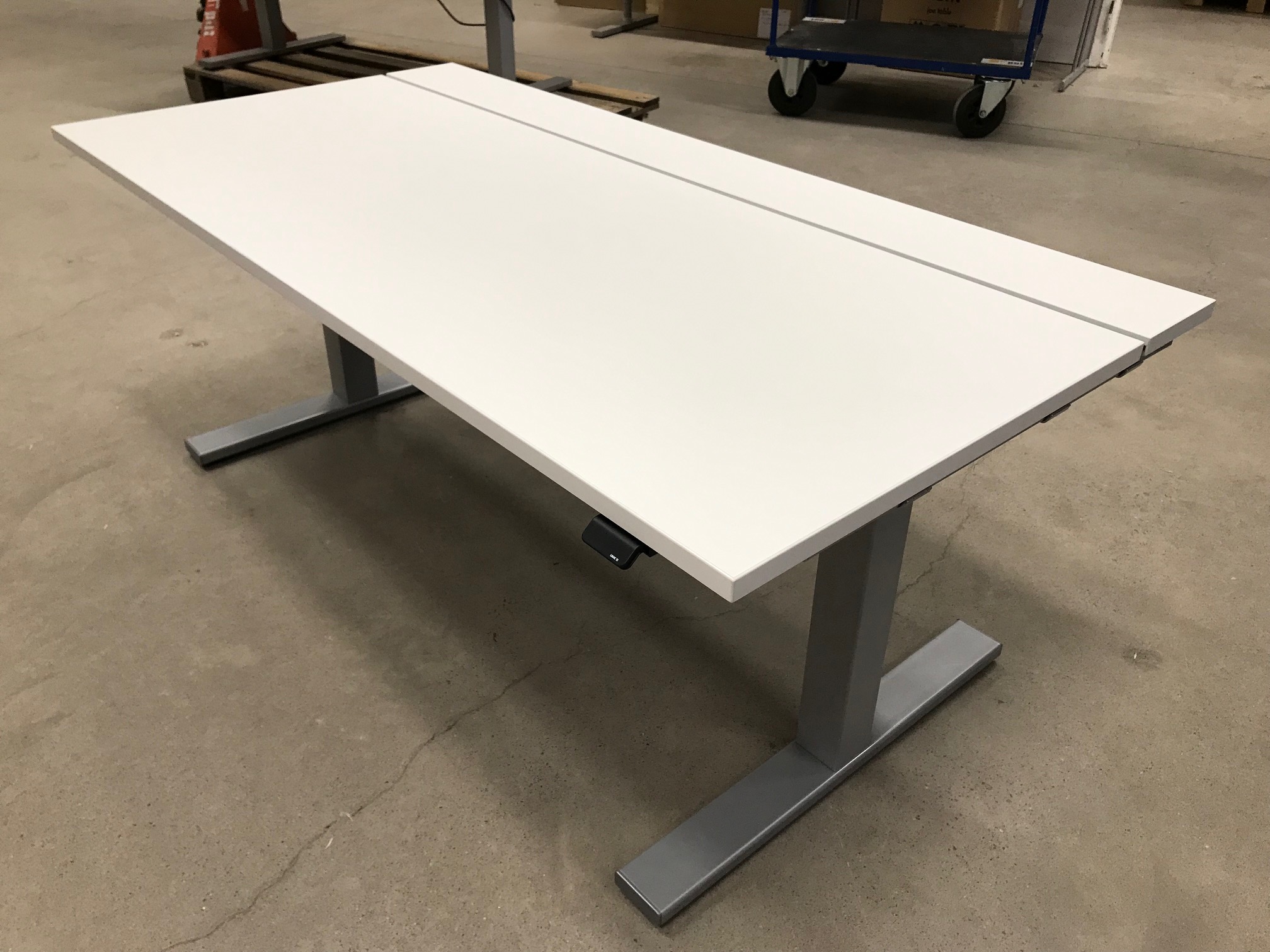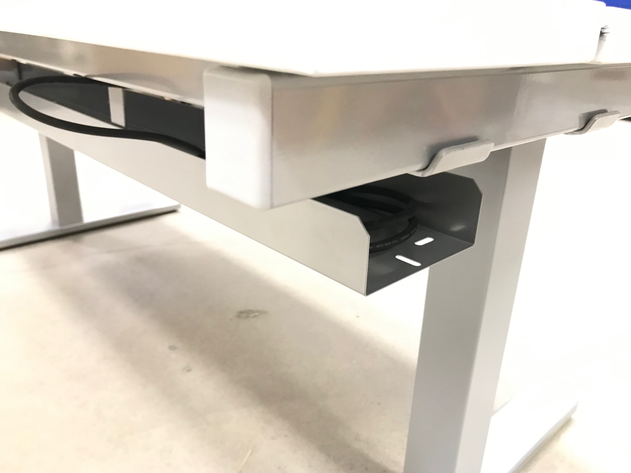 Bordsskiva i laminat (vit). Underrede i metall (grå). Höj- och sänkbart.