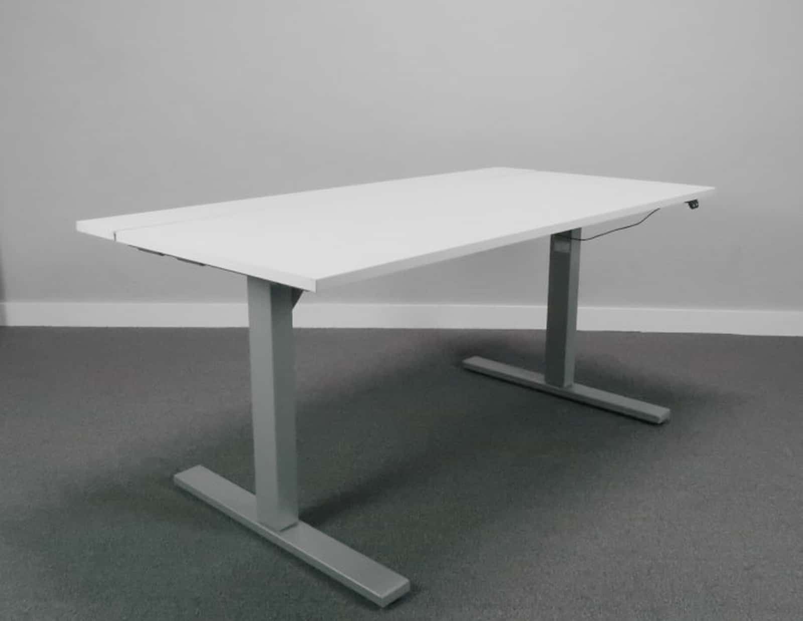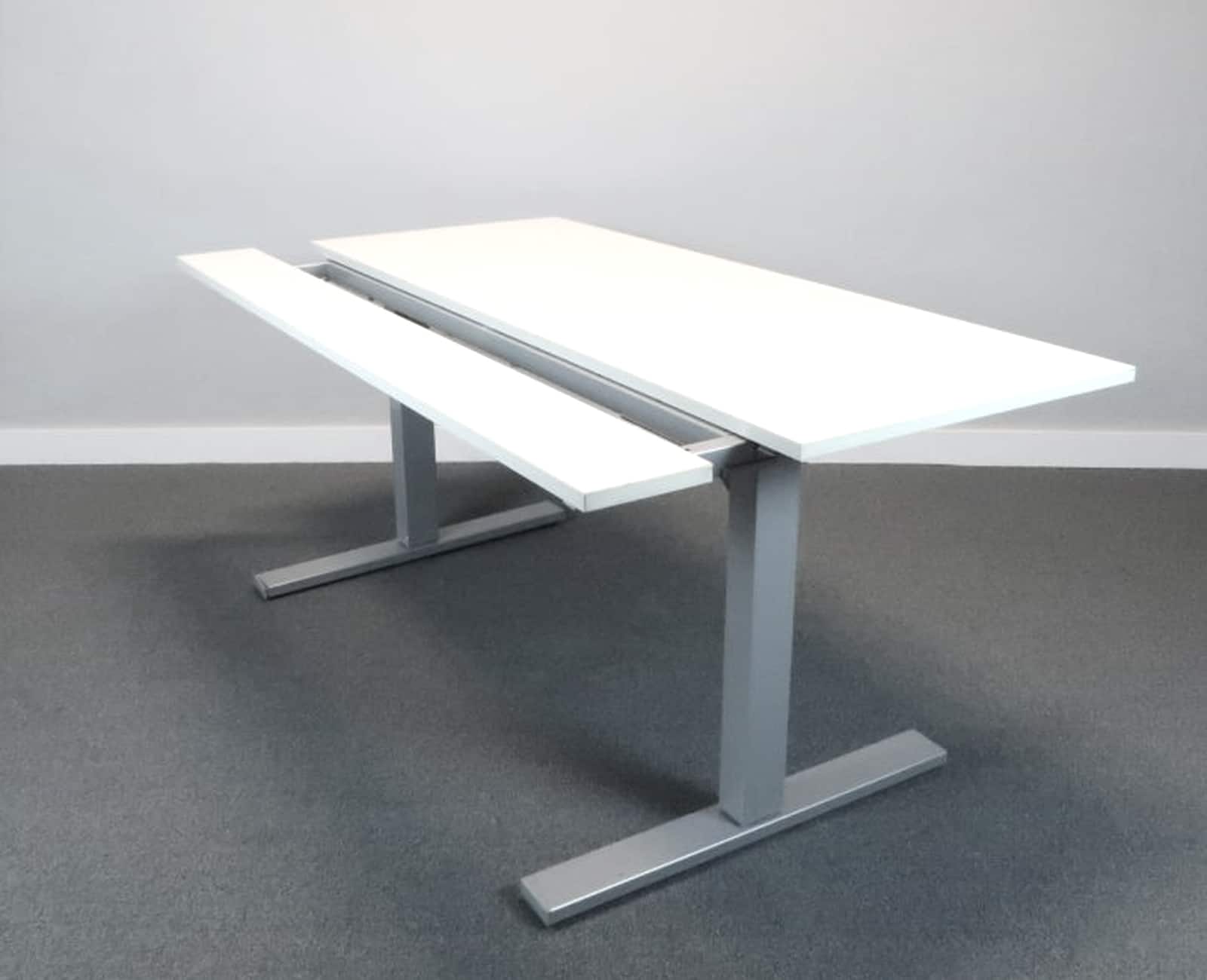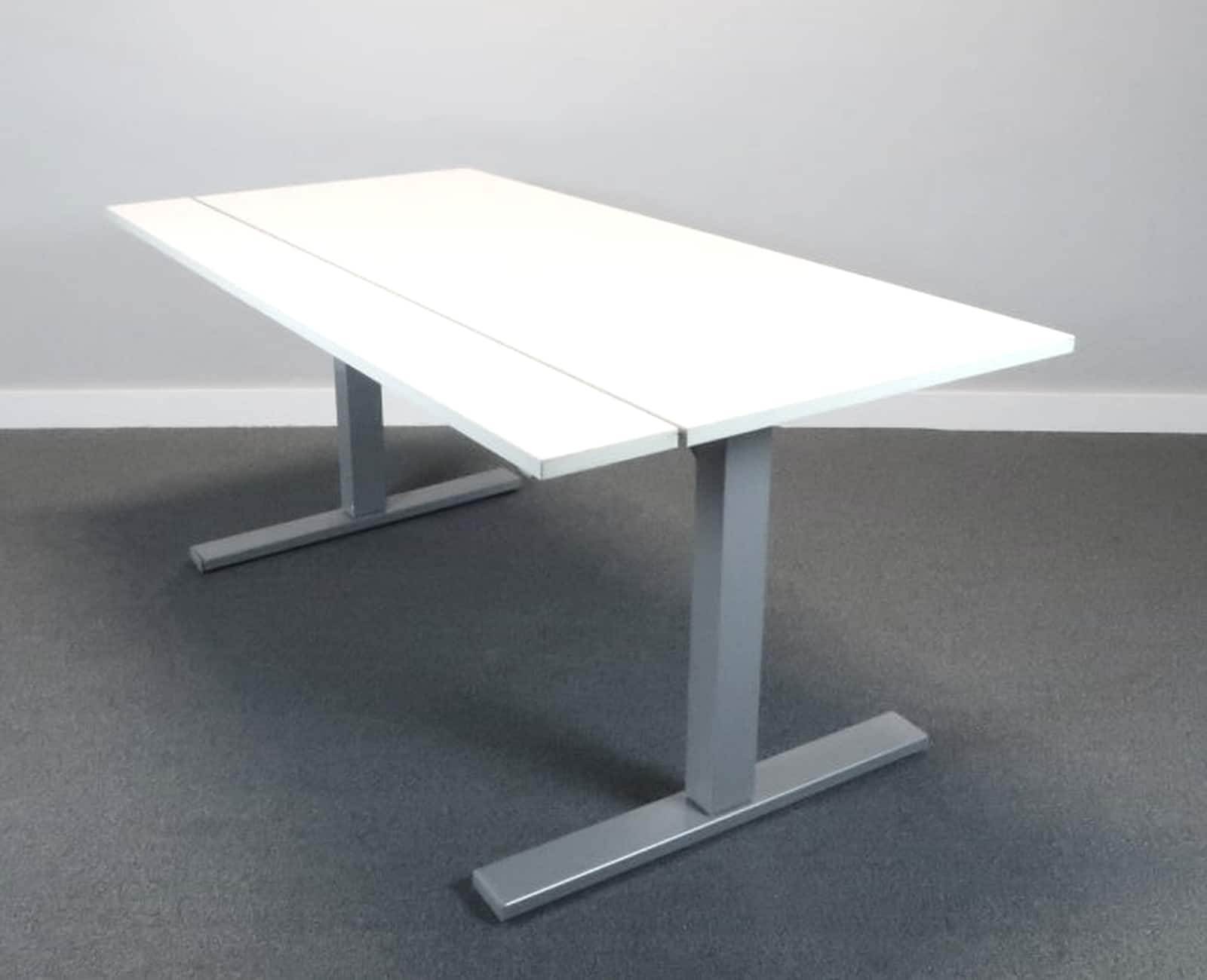 Bordsskiva i laminat (vit). Underrede i metall (silver). Höj- och sänkbart.