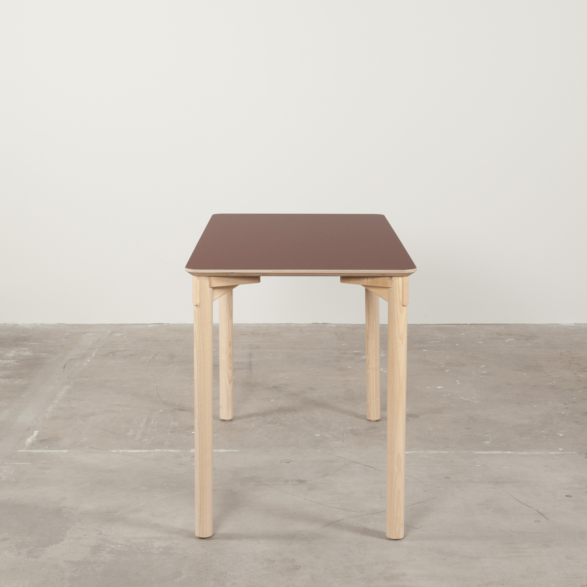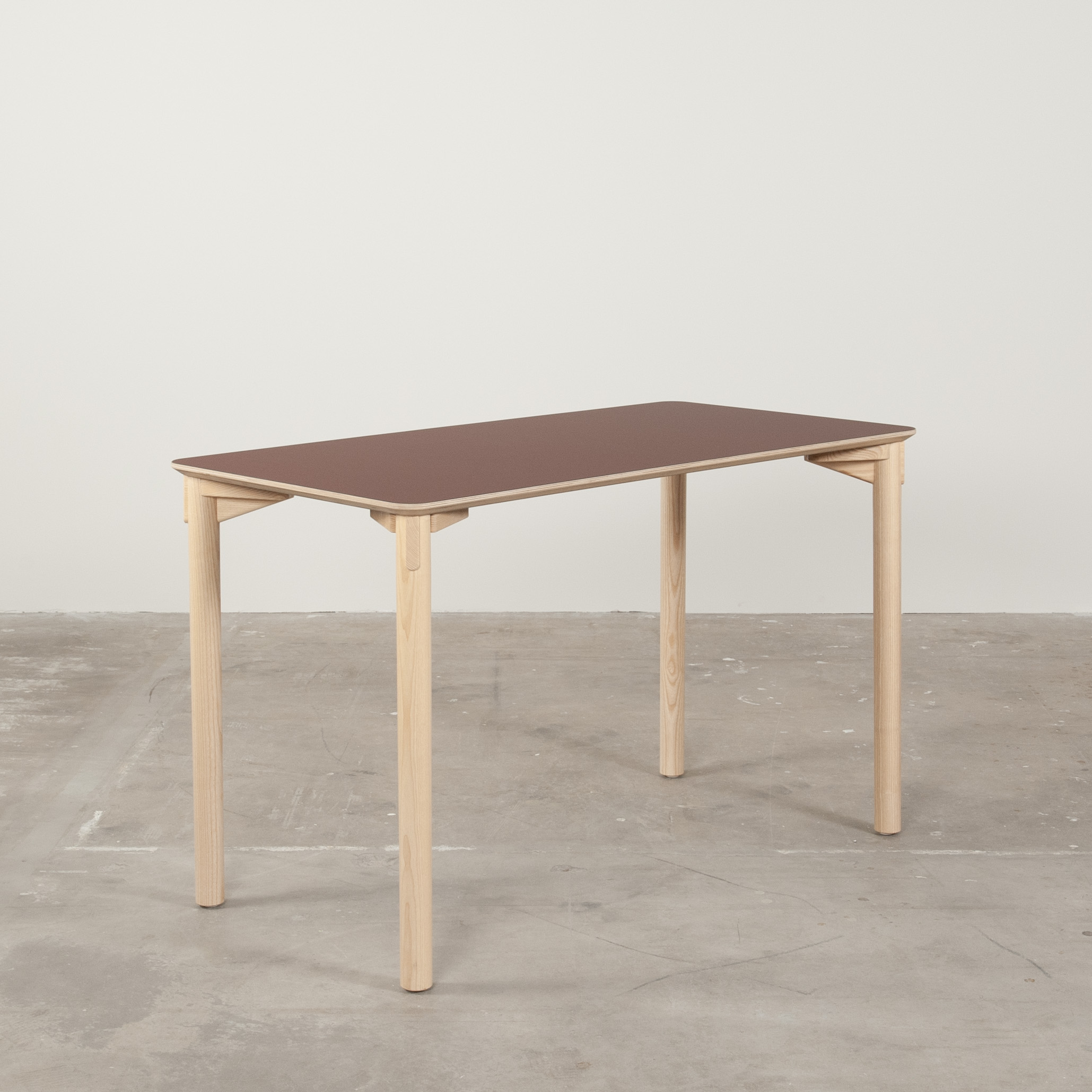 Bordsskiva i laminat (röd). Underrede i trä (ask).