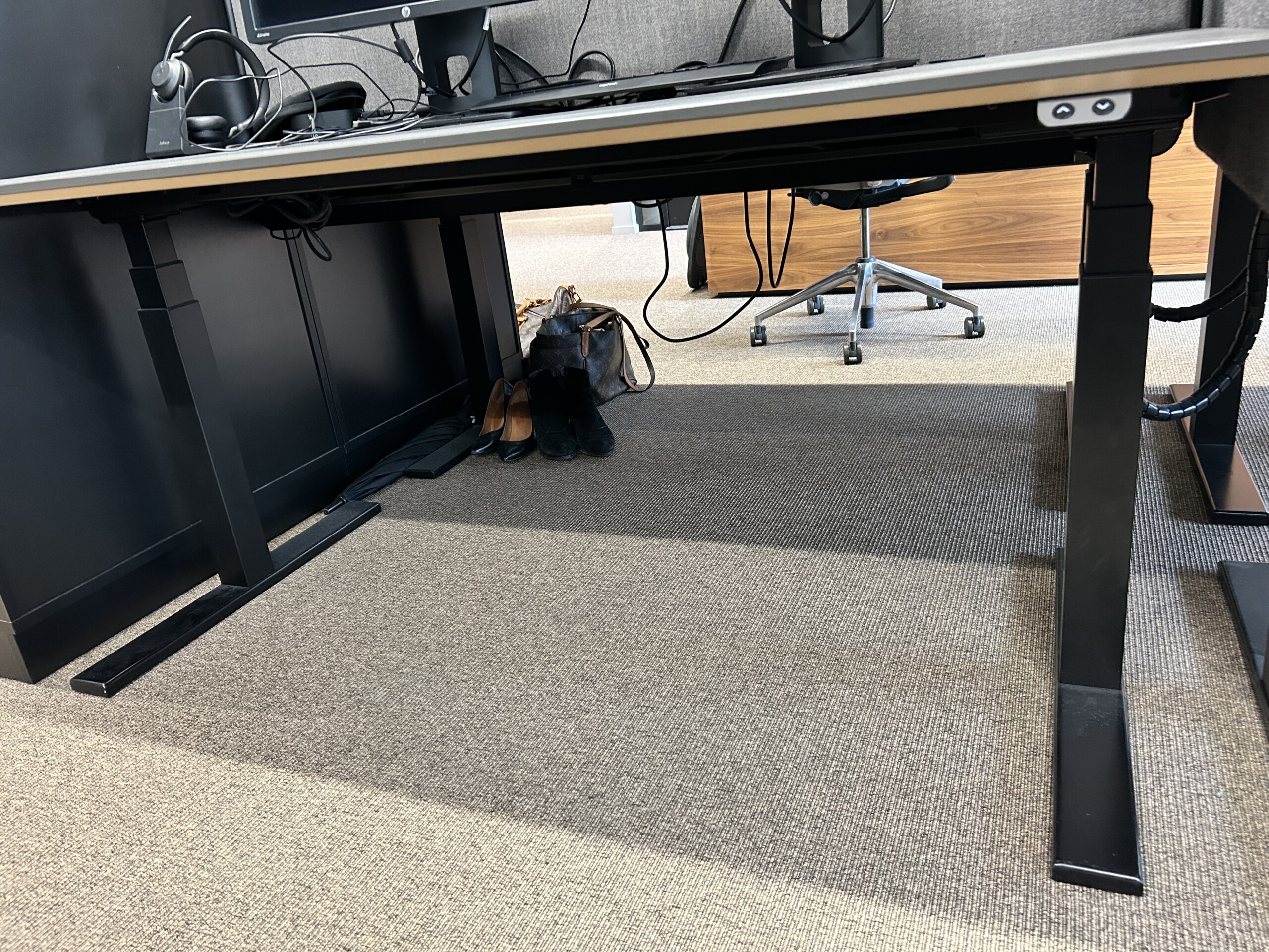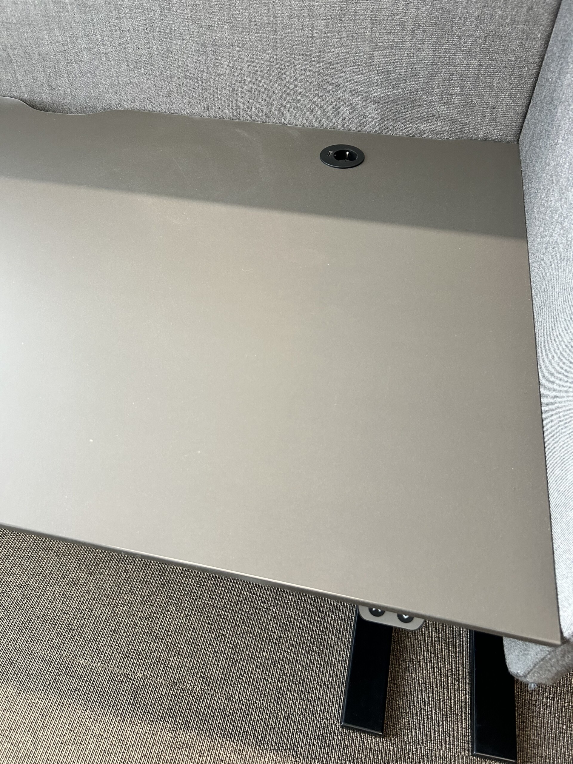 Bordsskiva i linoleum (grå). Underrede i metall (svart). Höj- och sänkbart.