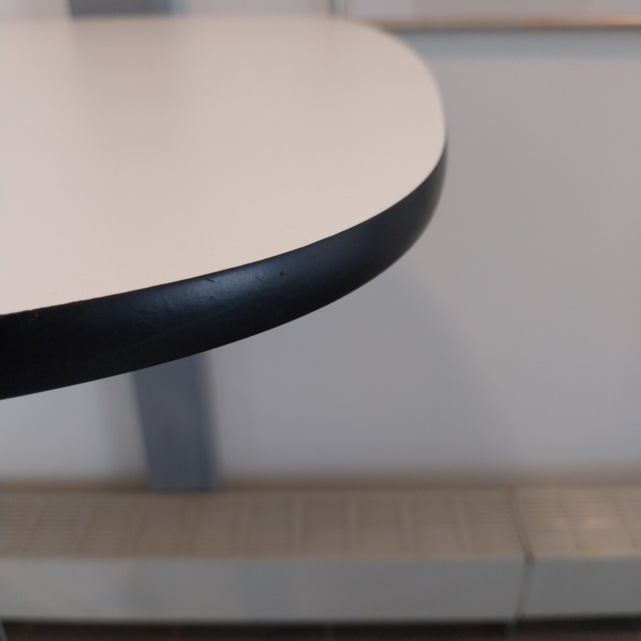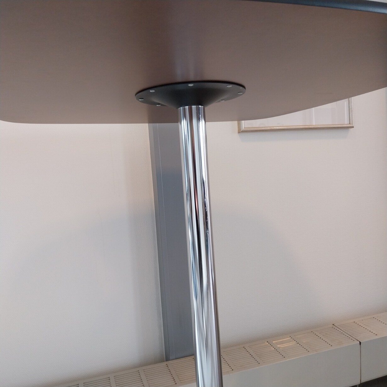 Bordsskiva i linoleum (vit). Underrede i metall (krom).