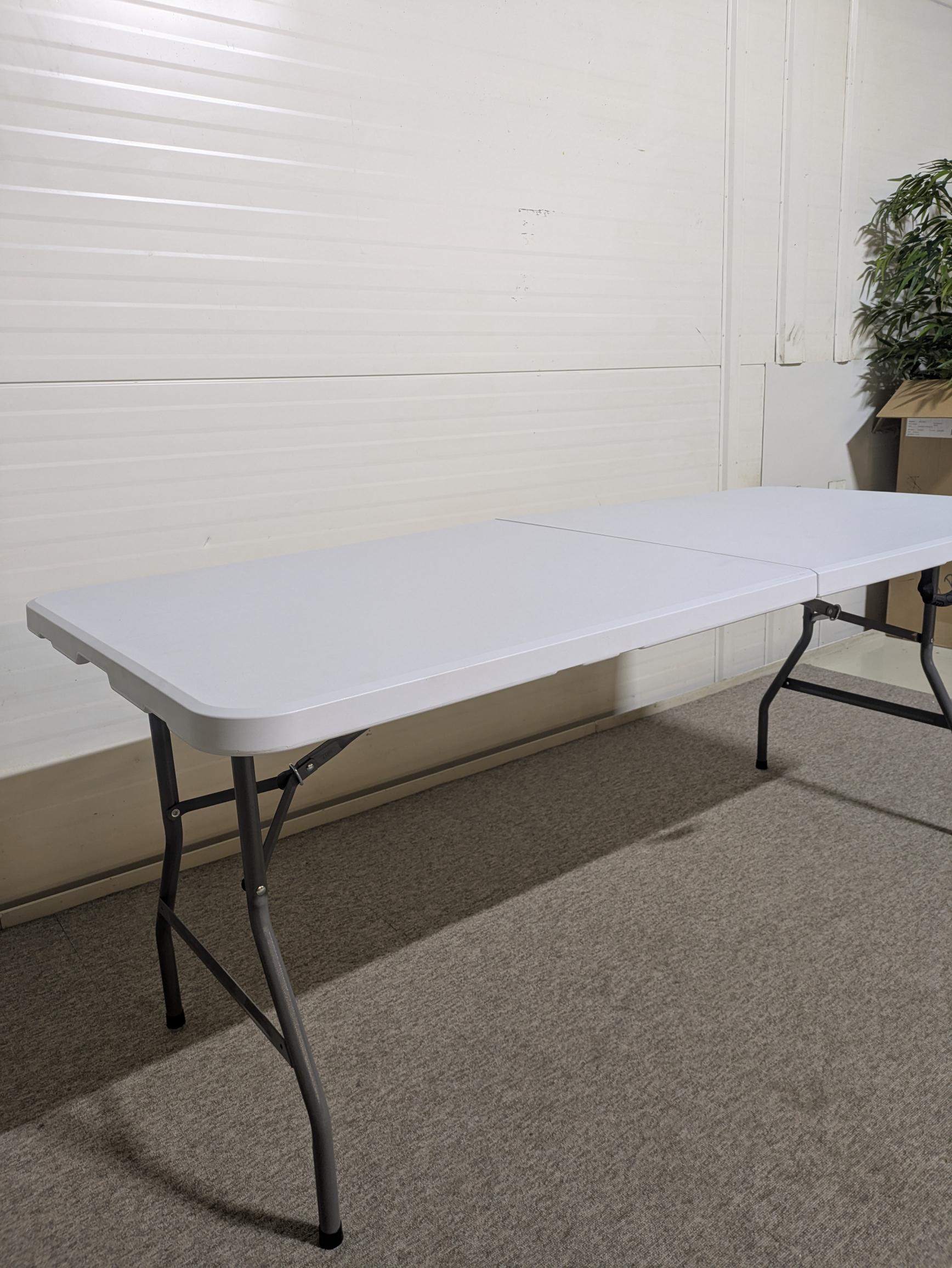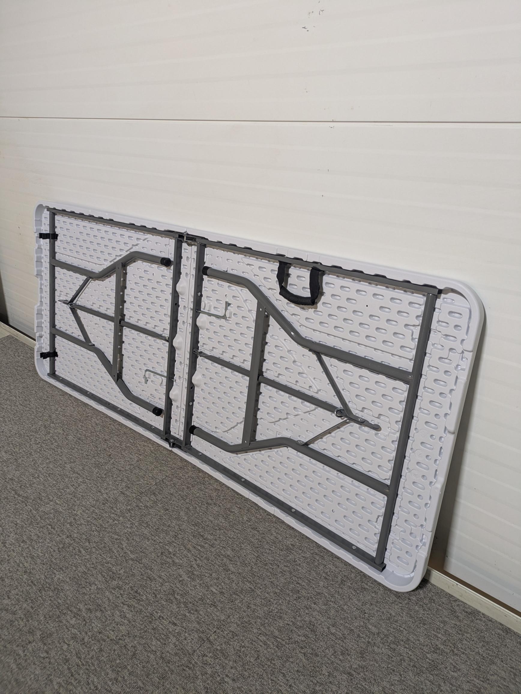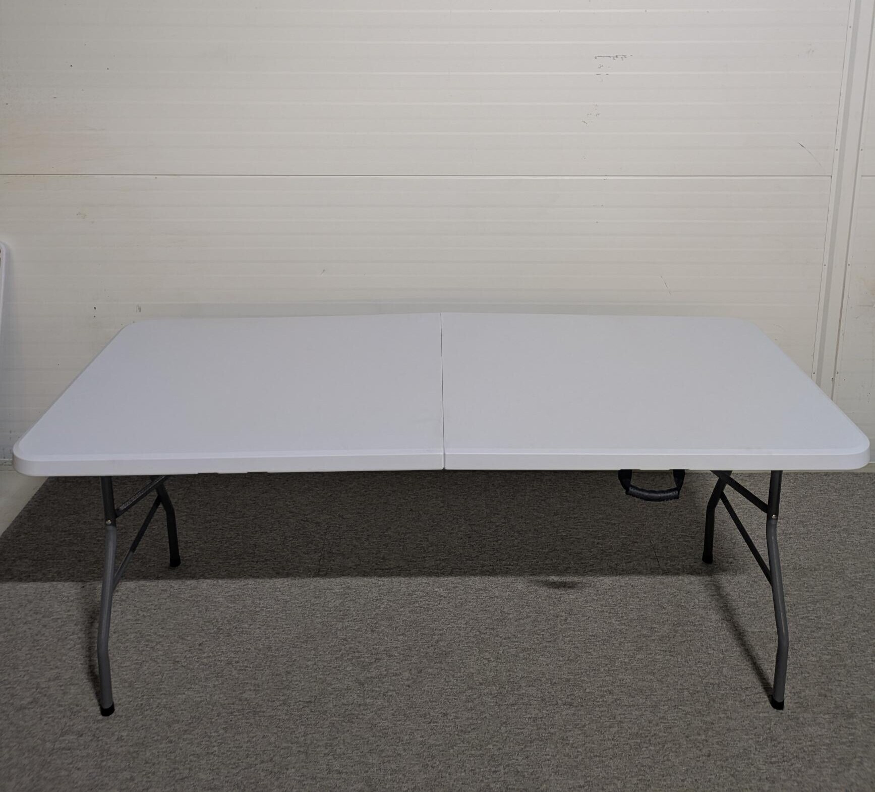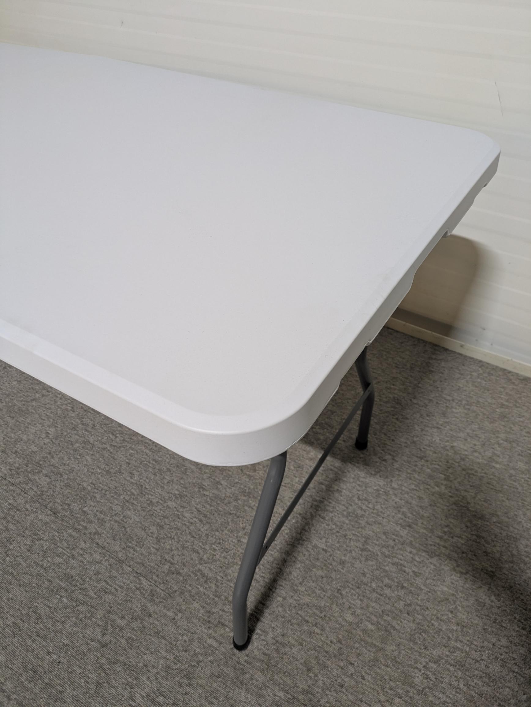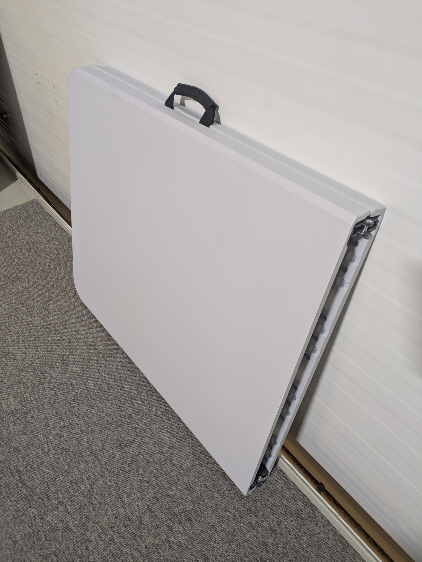 Bordsskiva i plast (vit). Underrede i metall (grå).