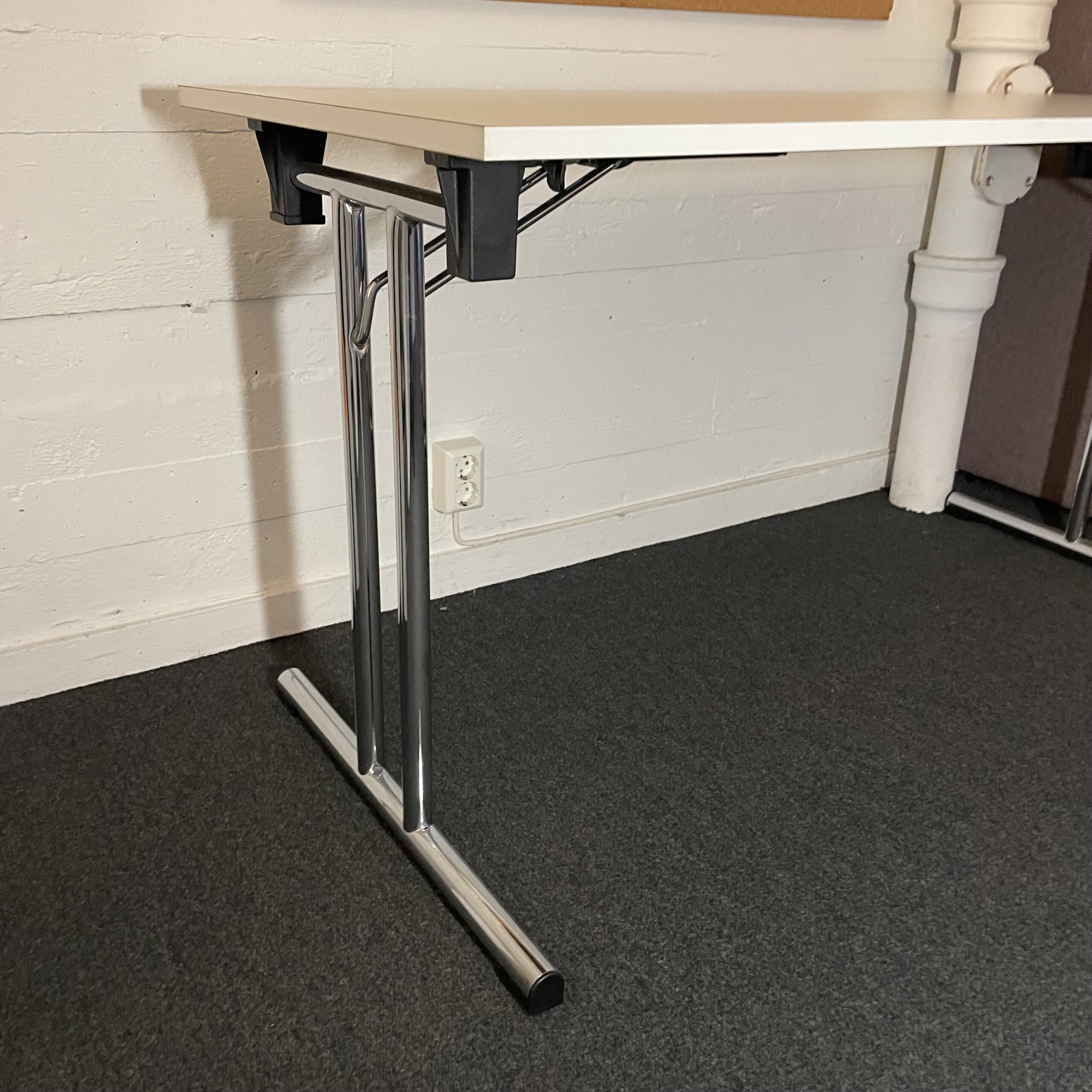 Bordsskiva i laminat (vit). Underrede i metall (krom).