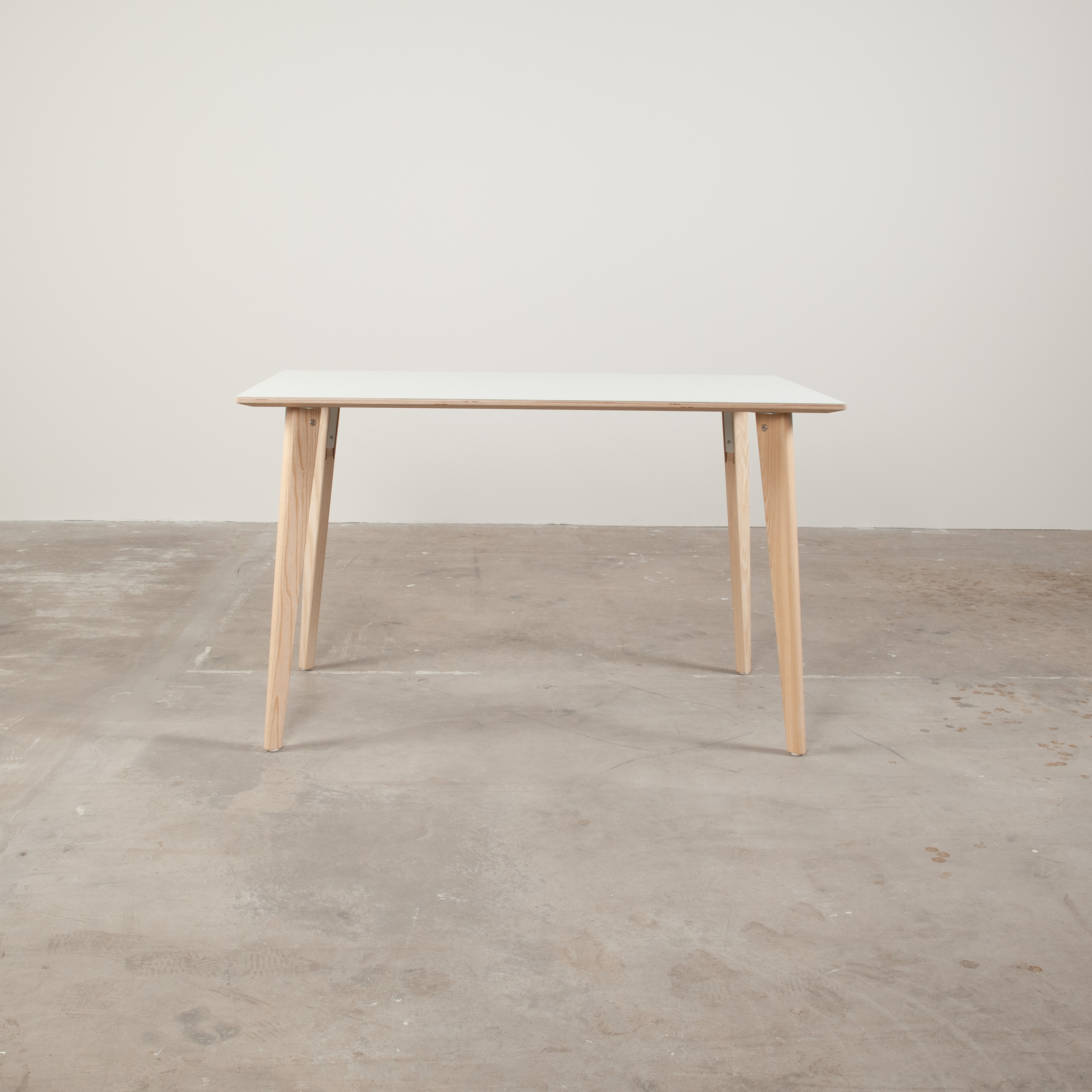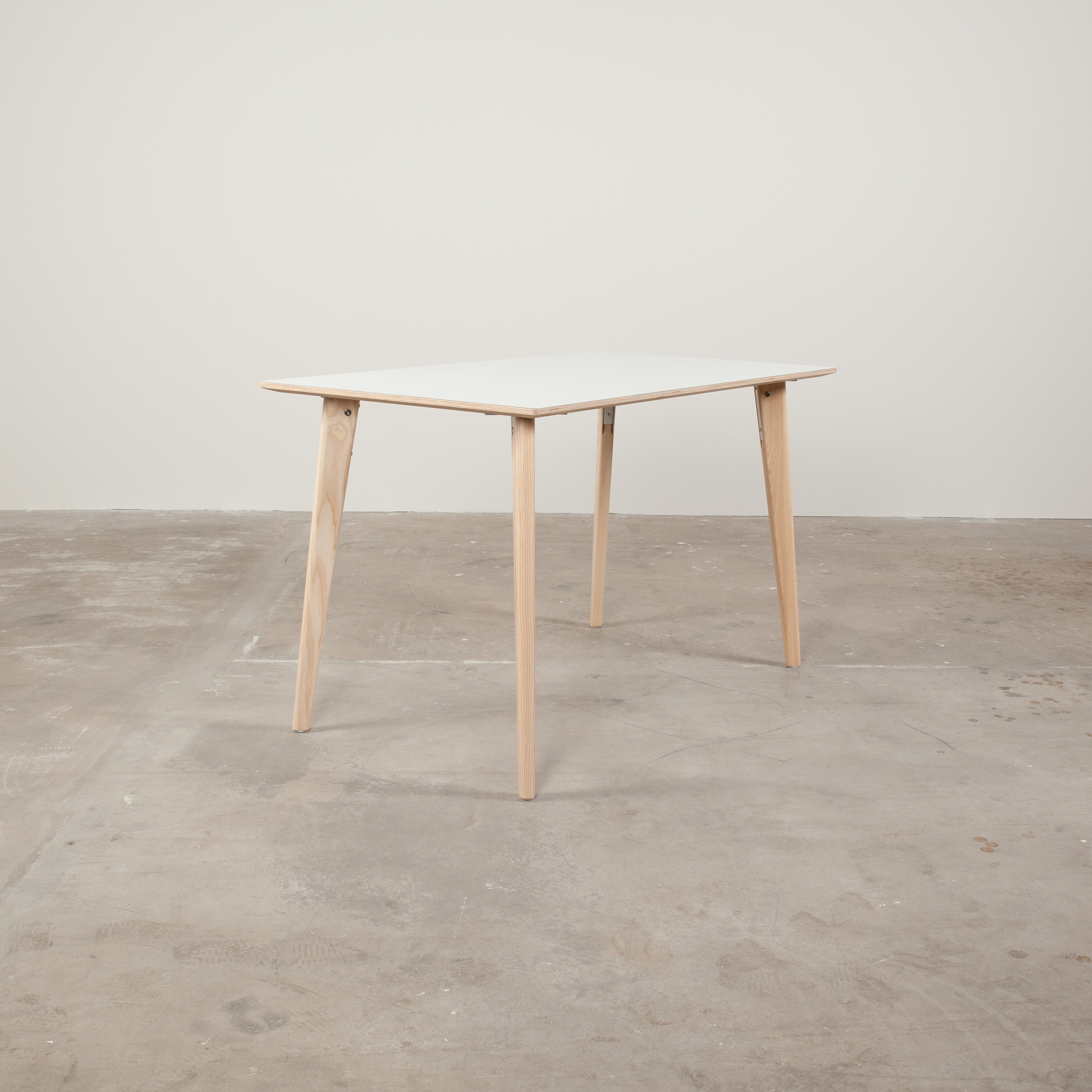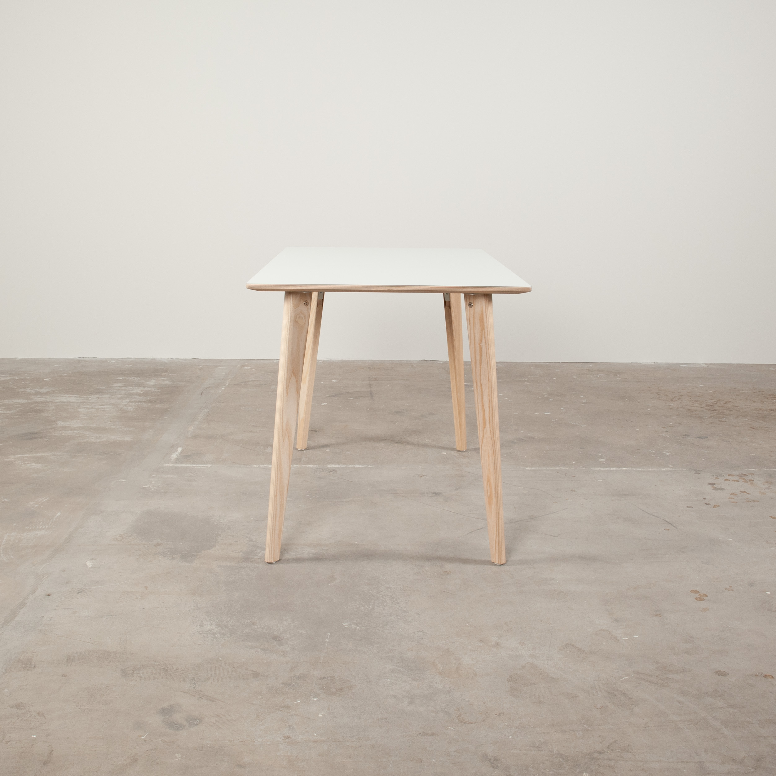 Bordsskiva i laminat (vit). Underrede i trä (ask).