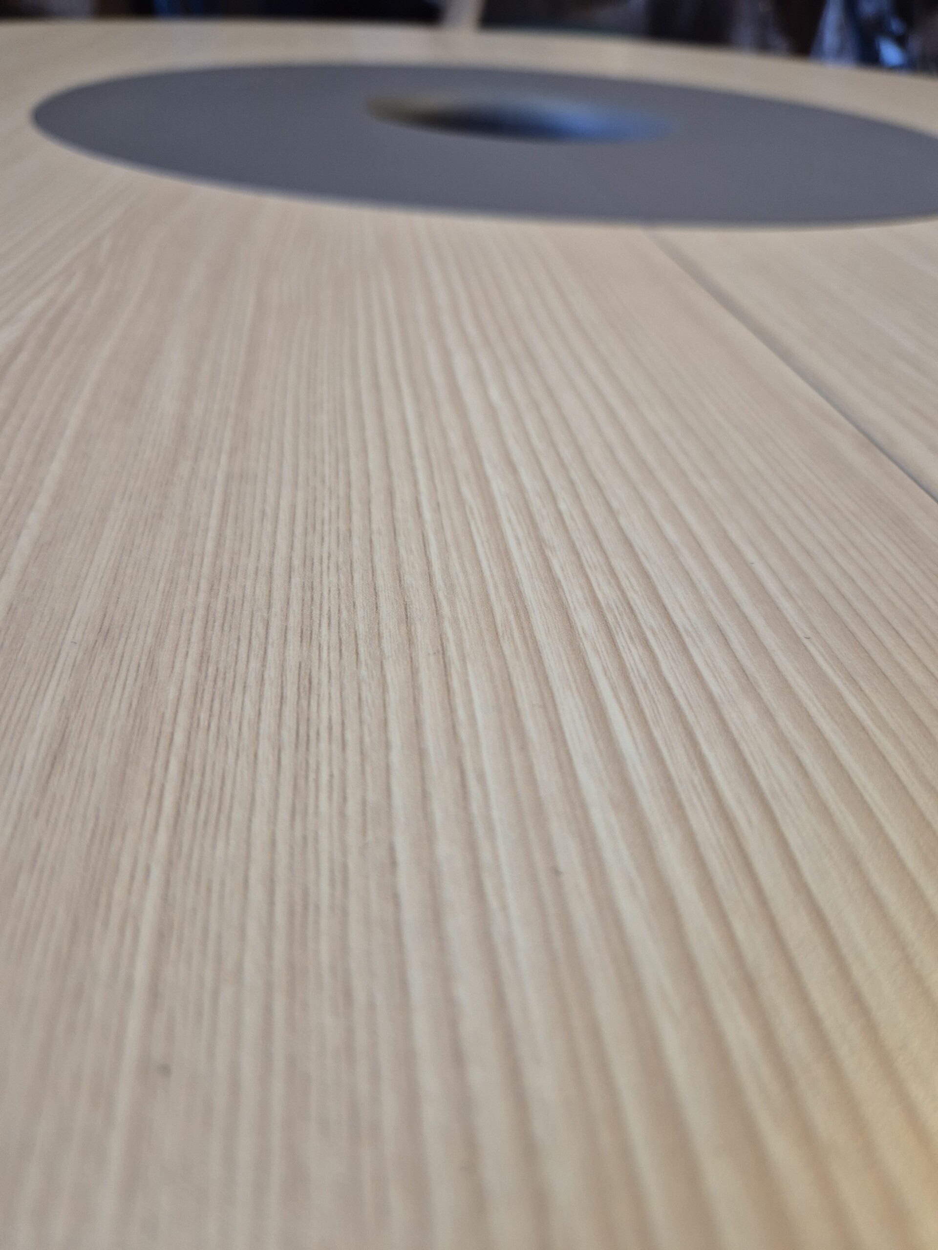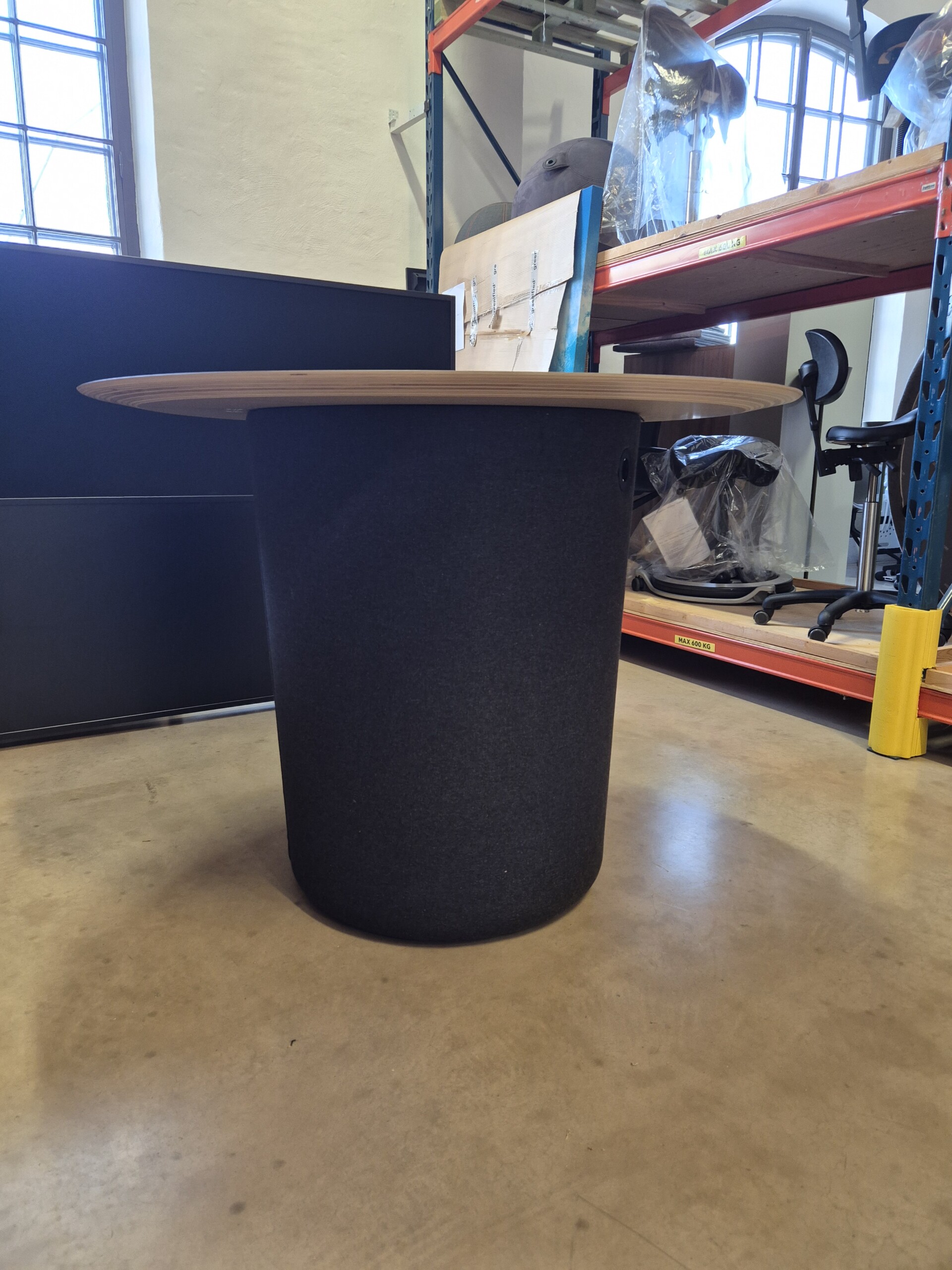 Bordsskiva i trä (ask). Underrede i tyg (grå).