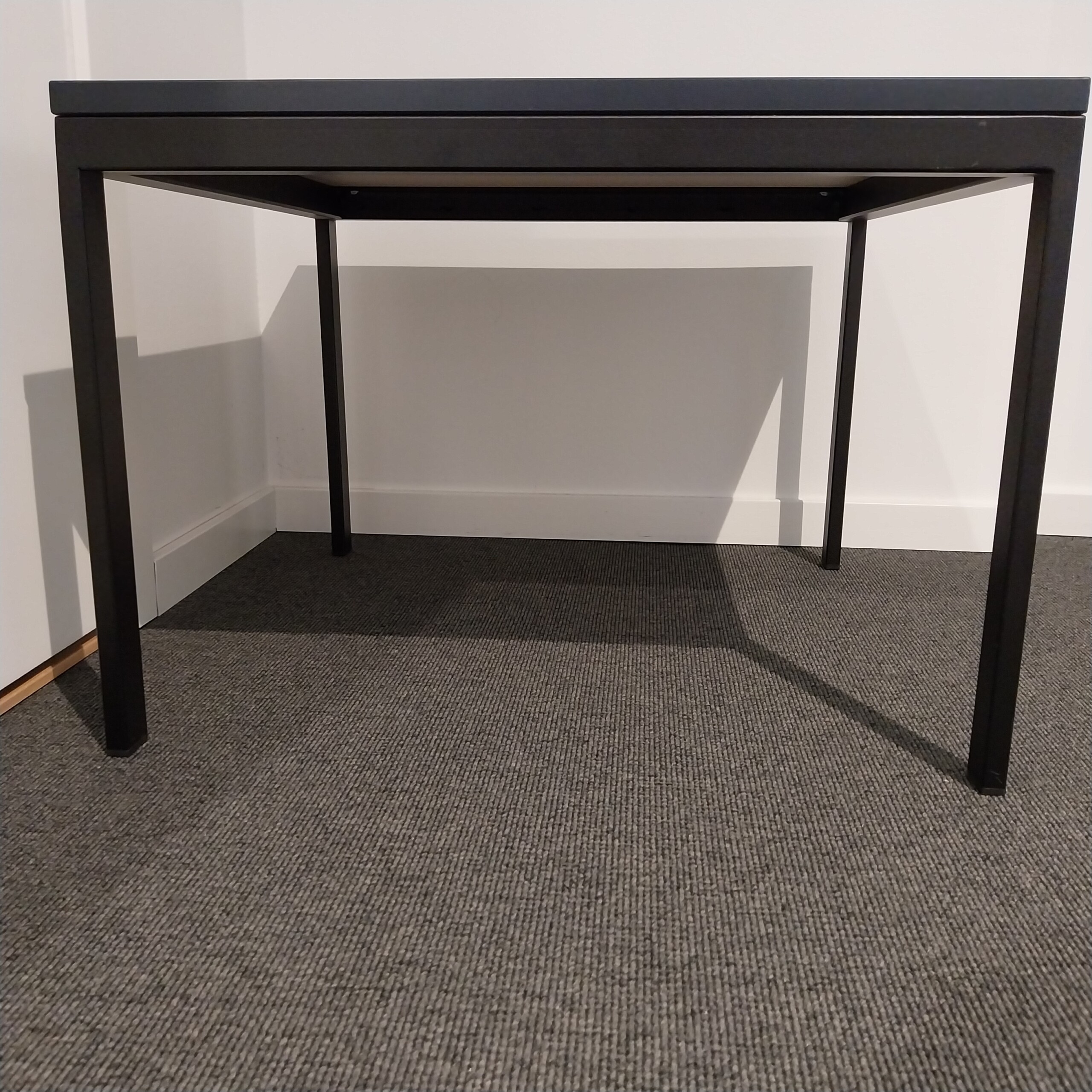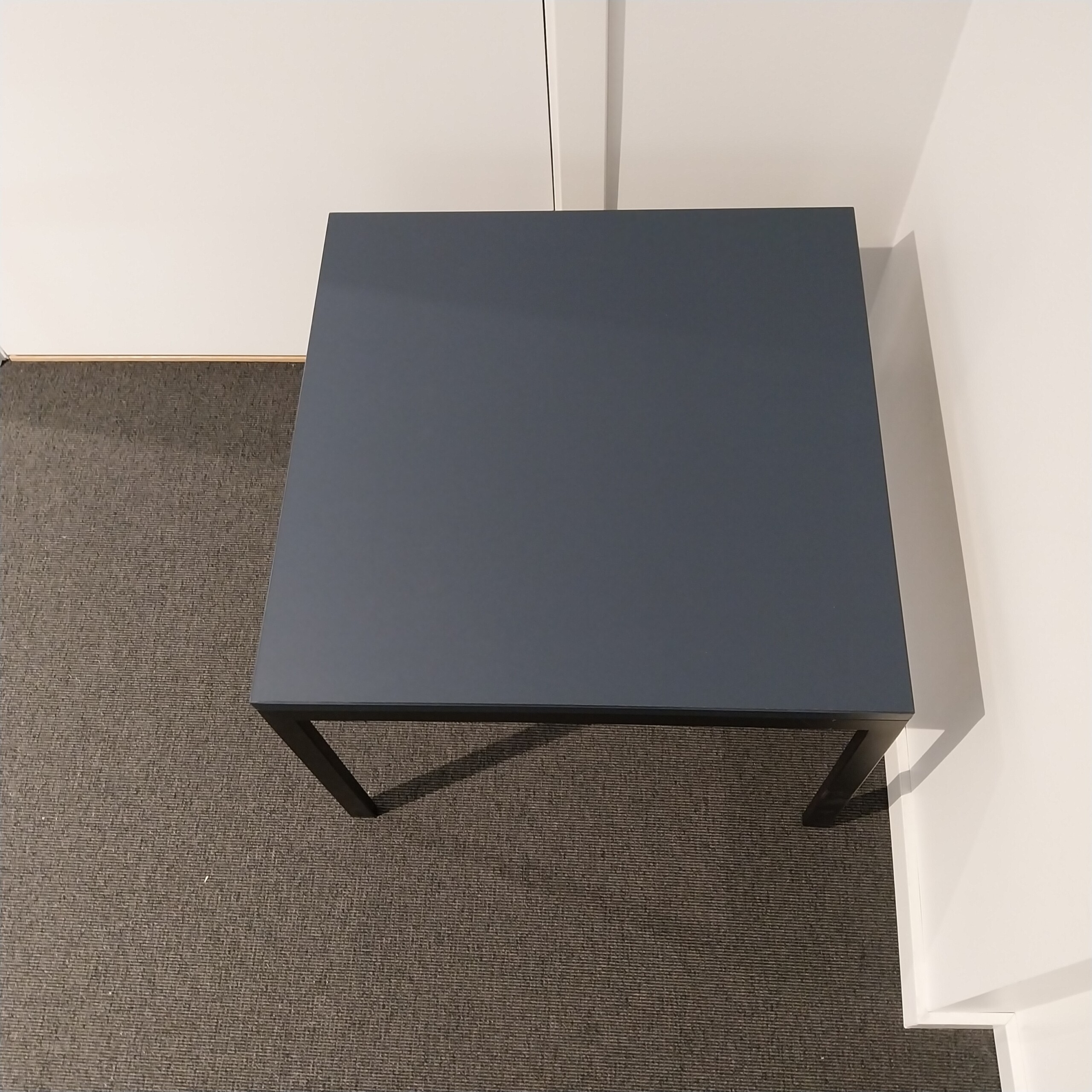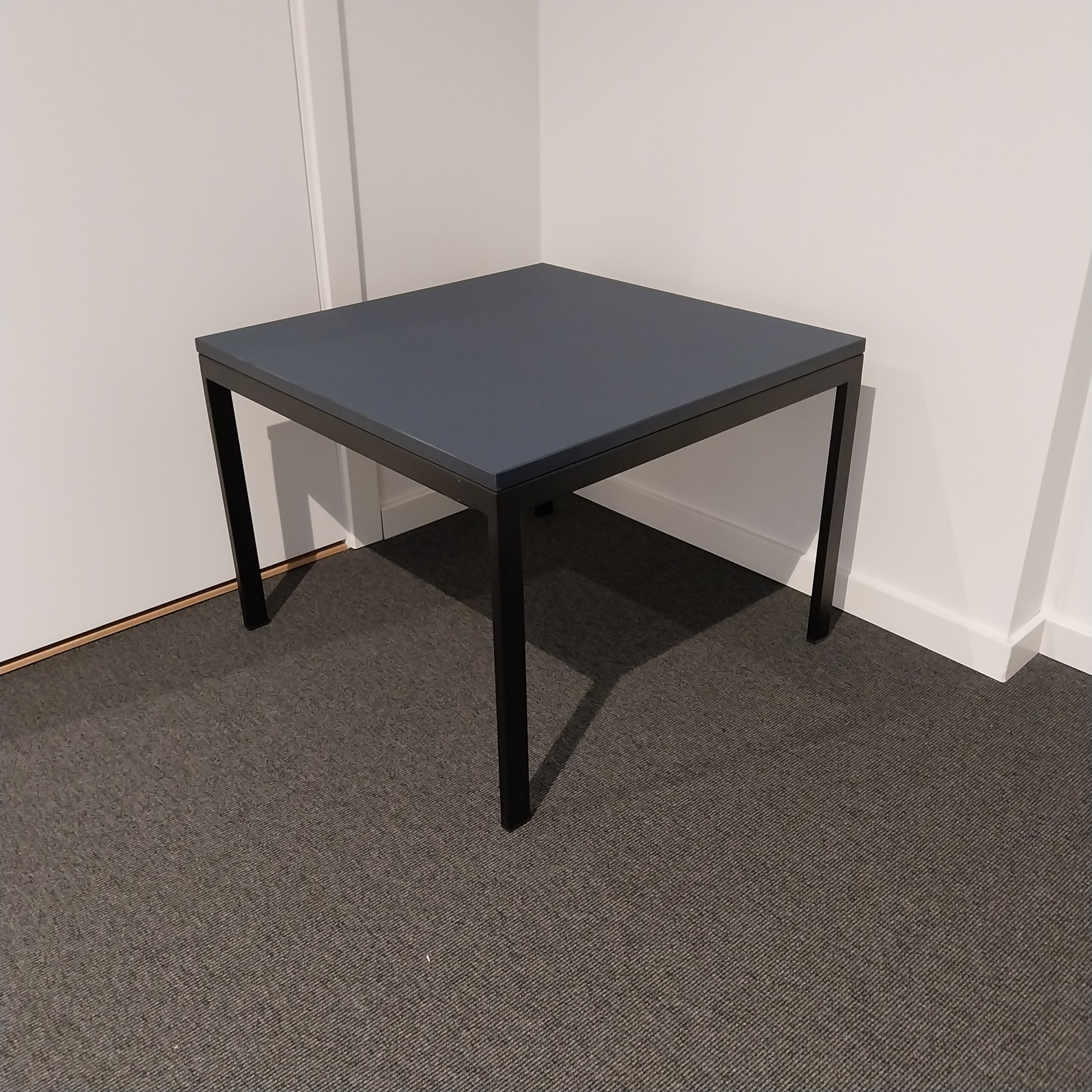 Bordsskiva i linoleum (blå). Underrede i metall (svart).