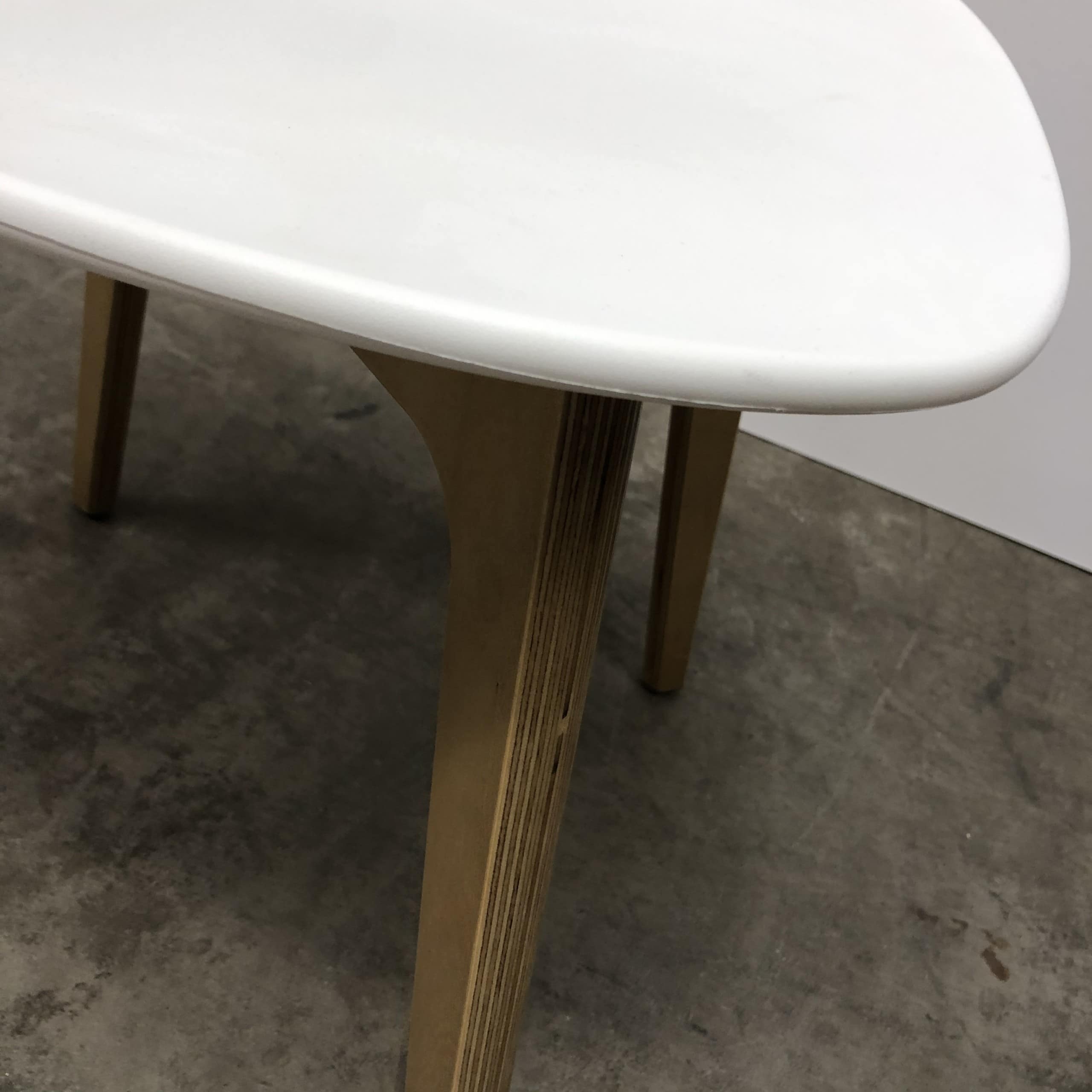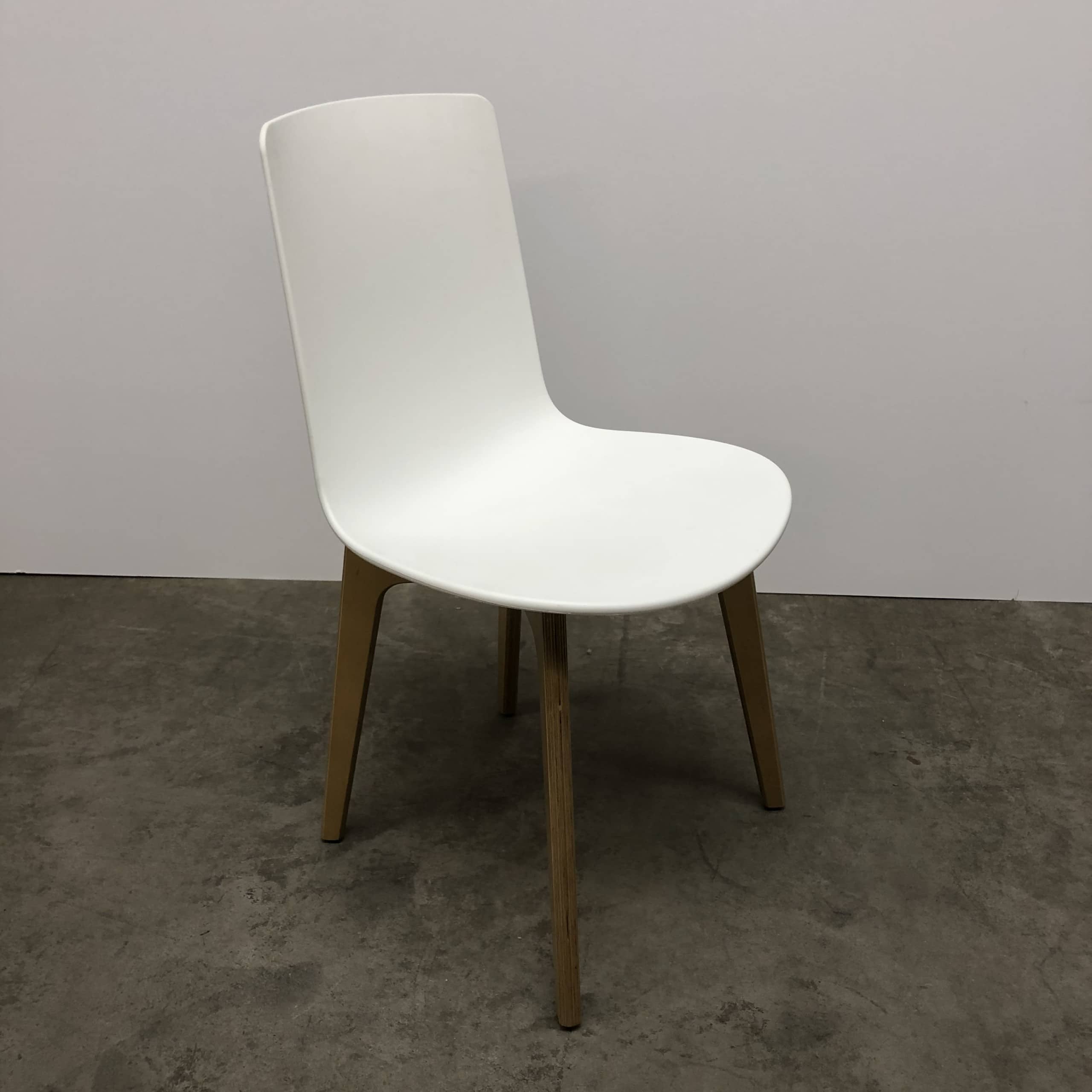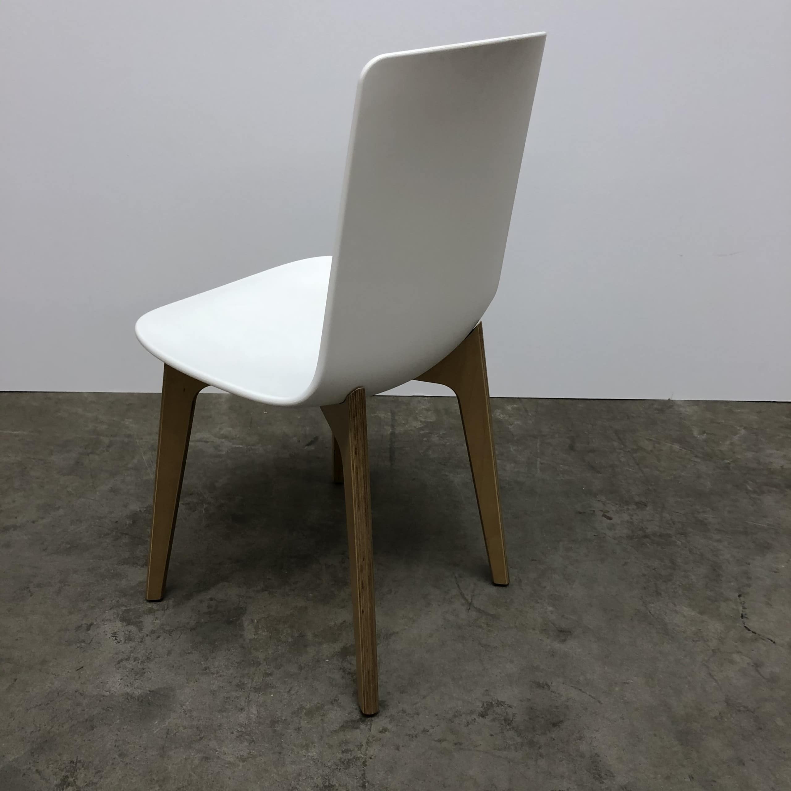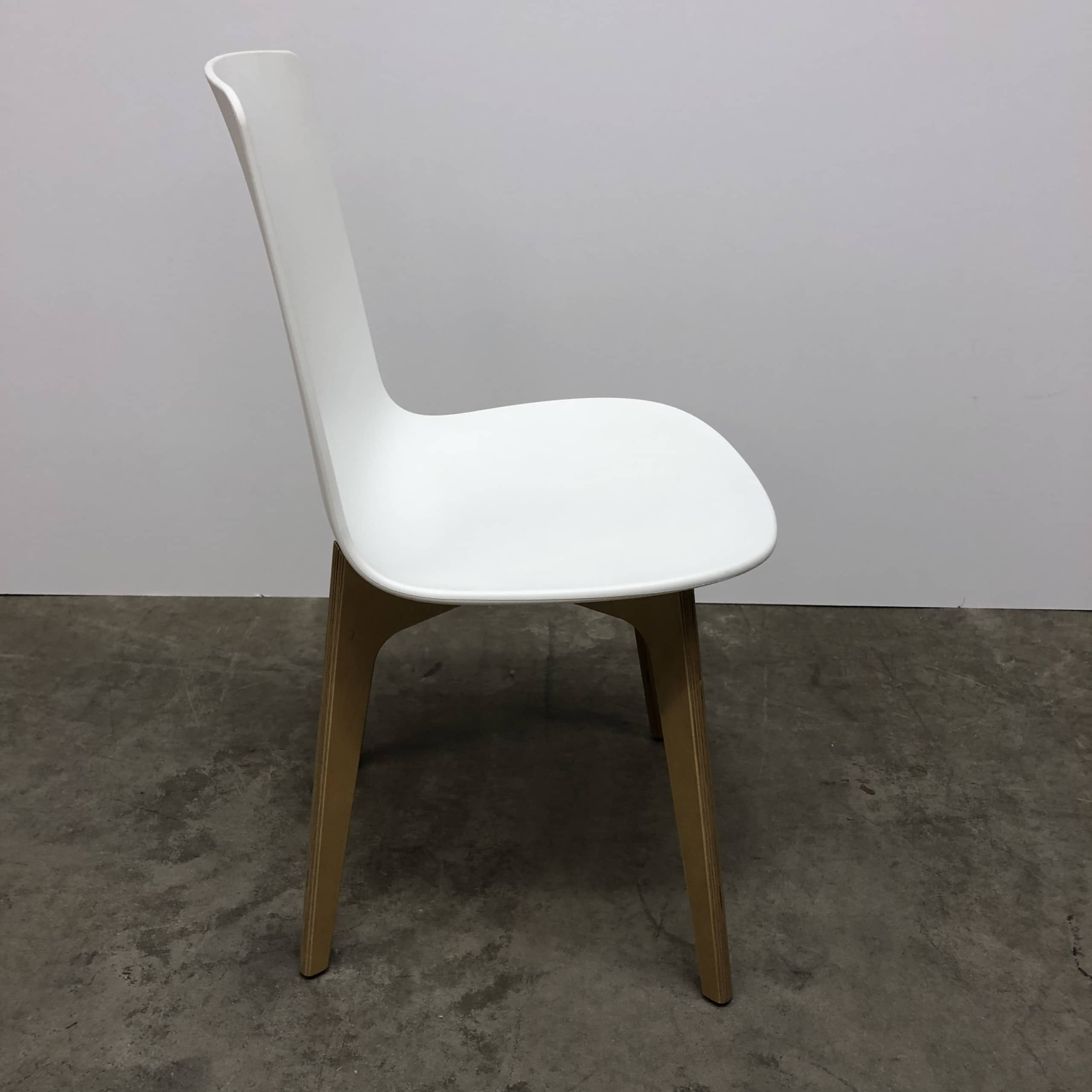 Sits och rygg i plast (vit). Ben i trä (ek).