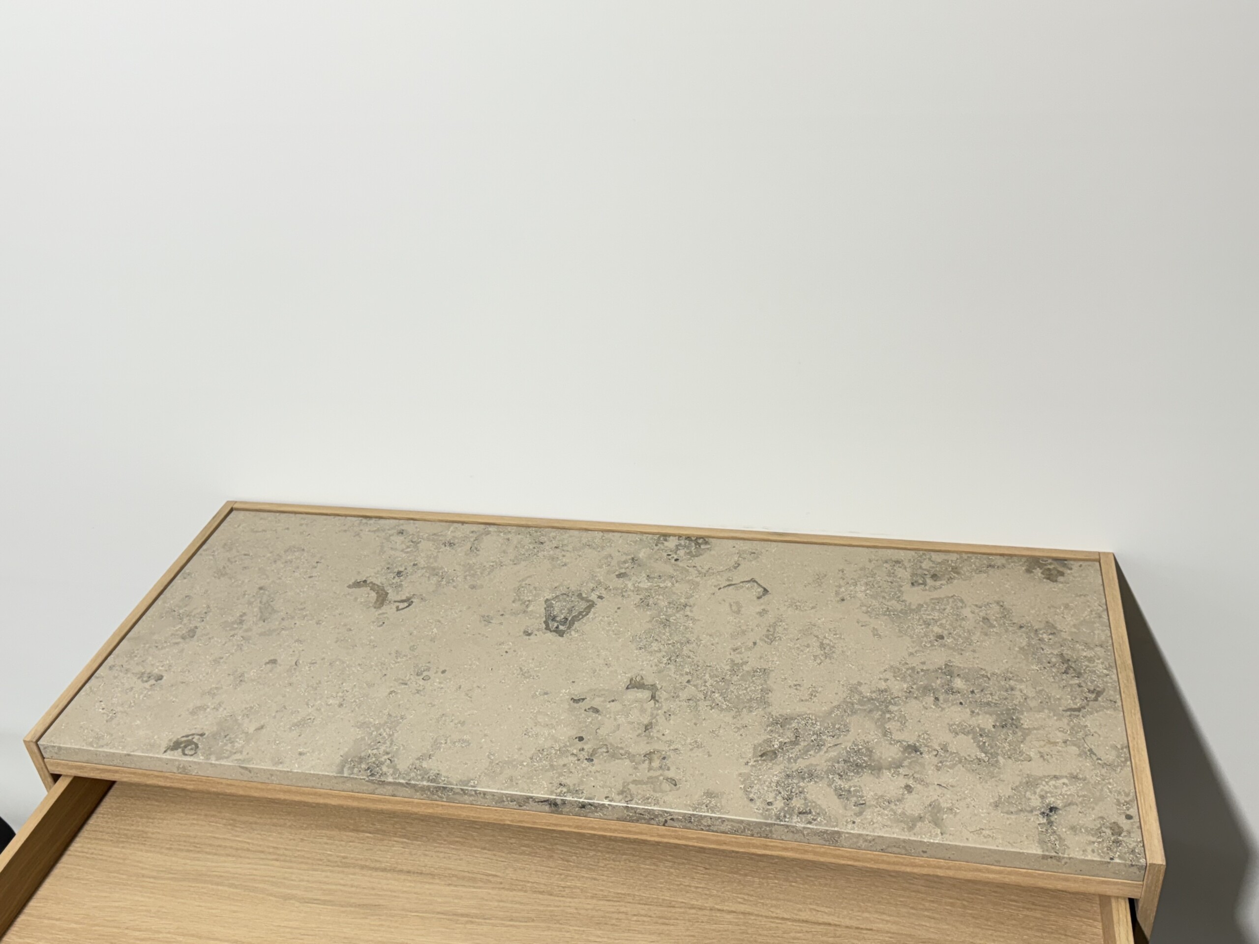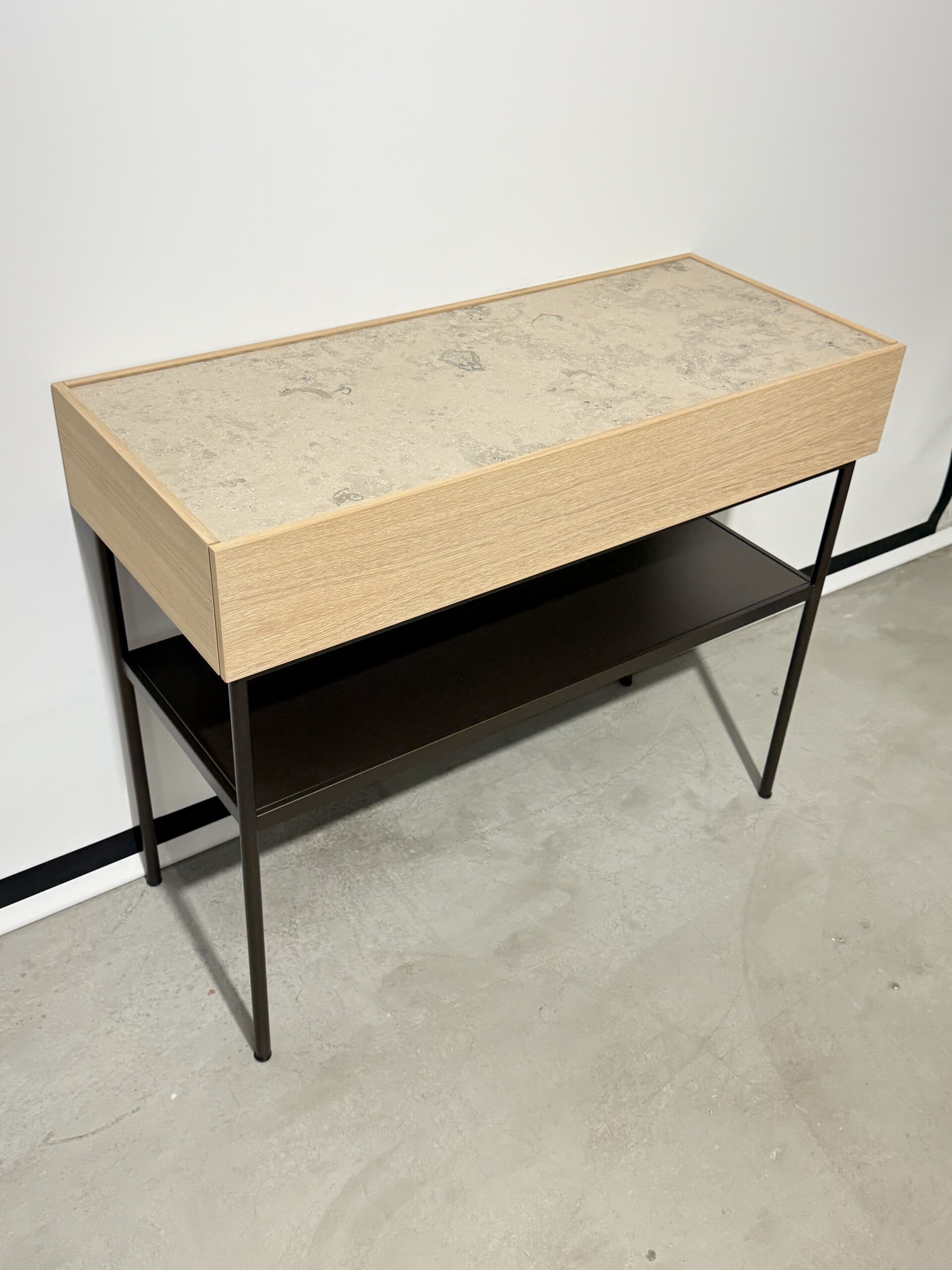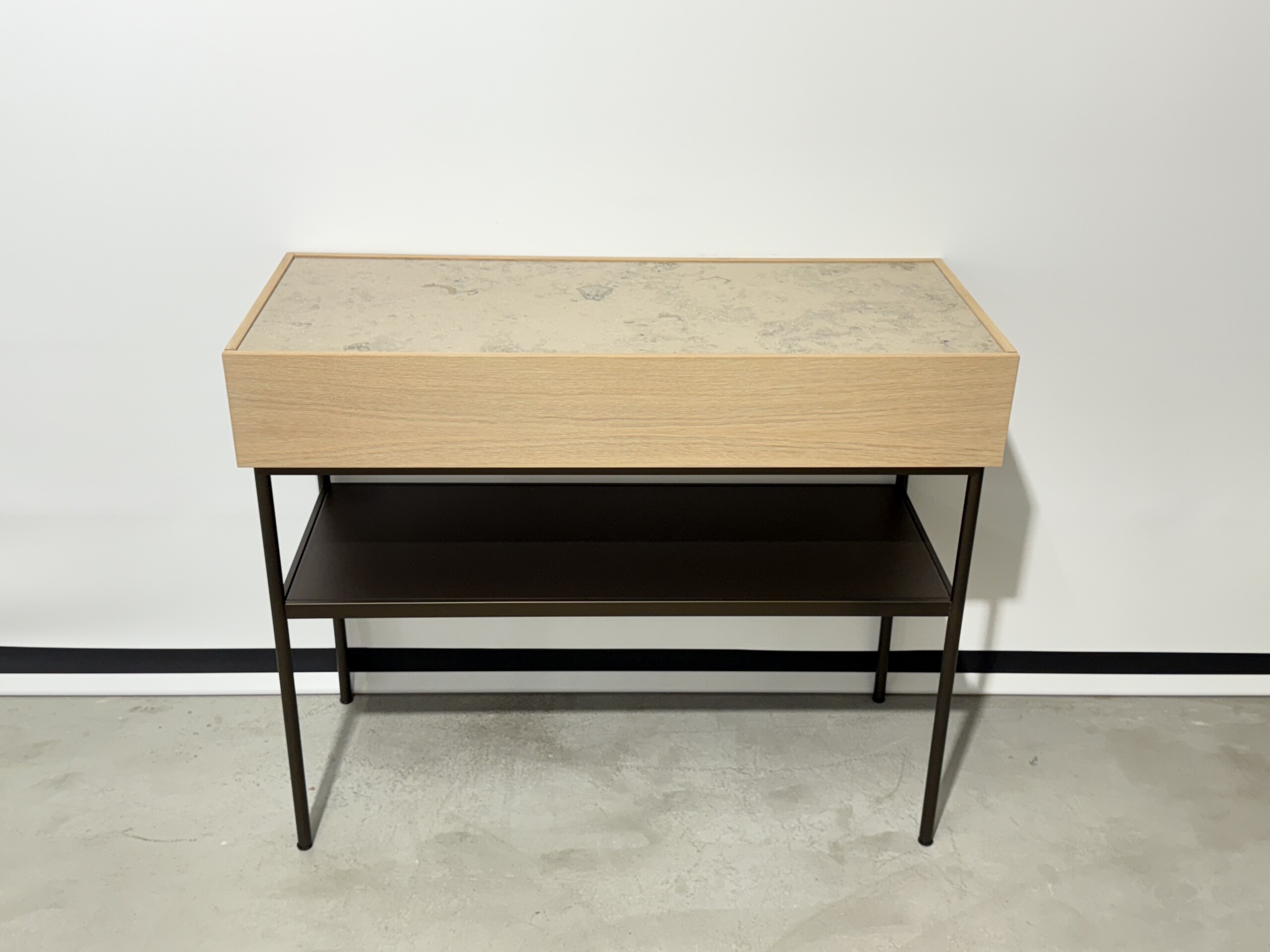 Stomme i metall (svart). Front i trä (ek).