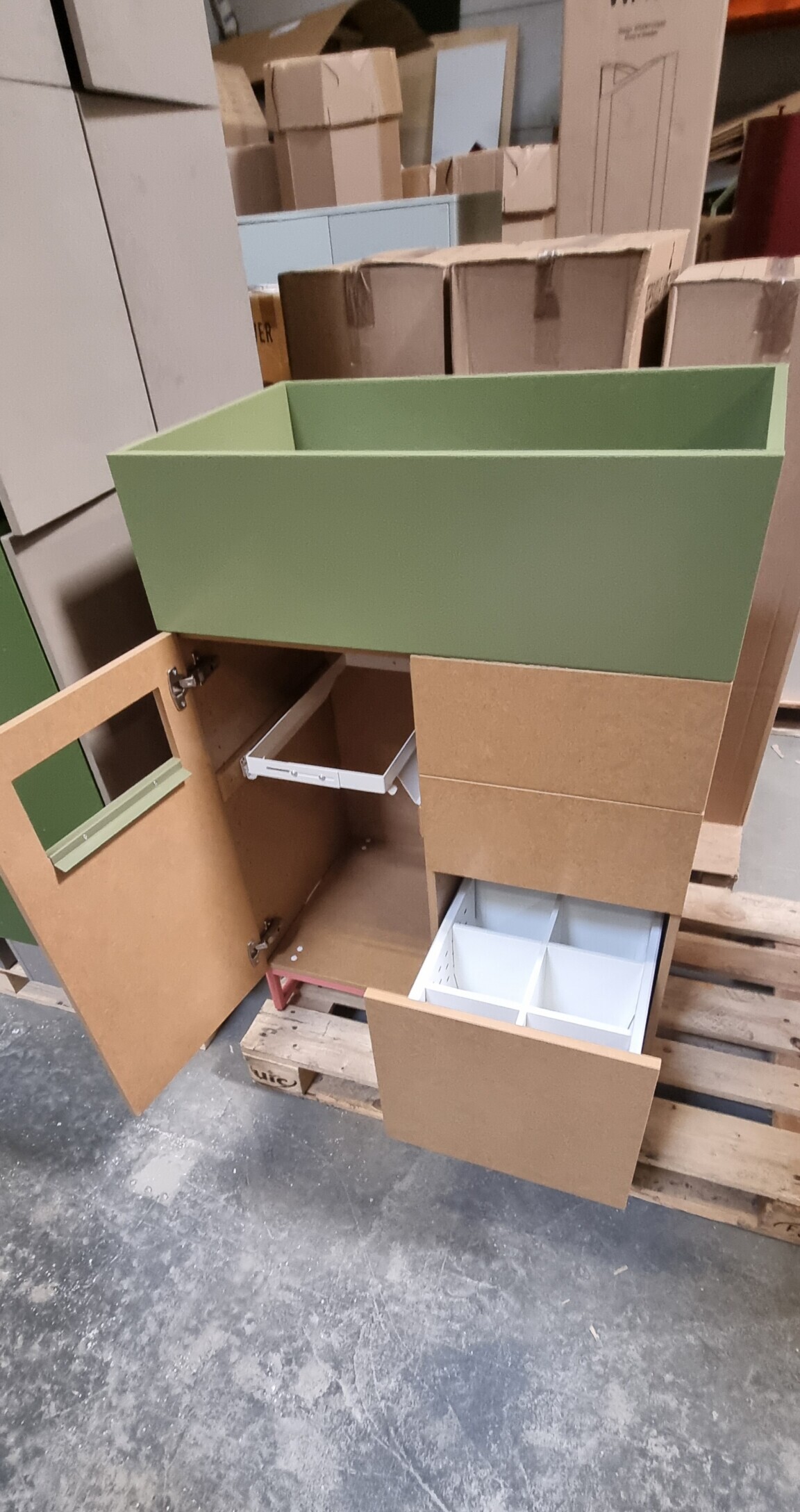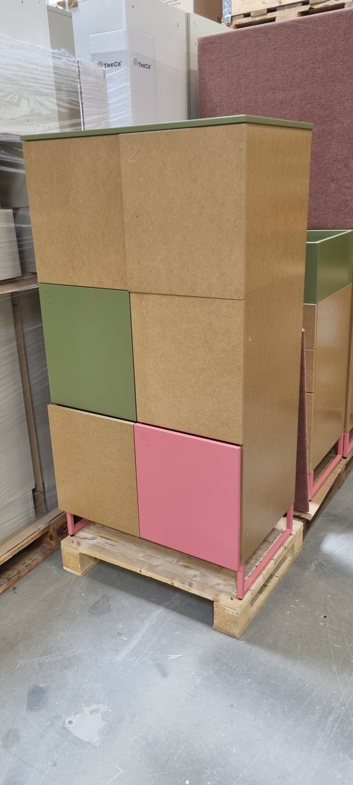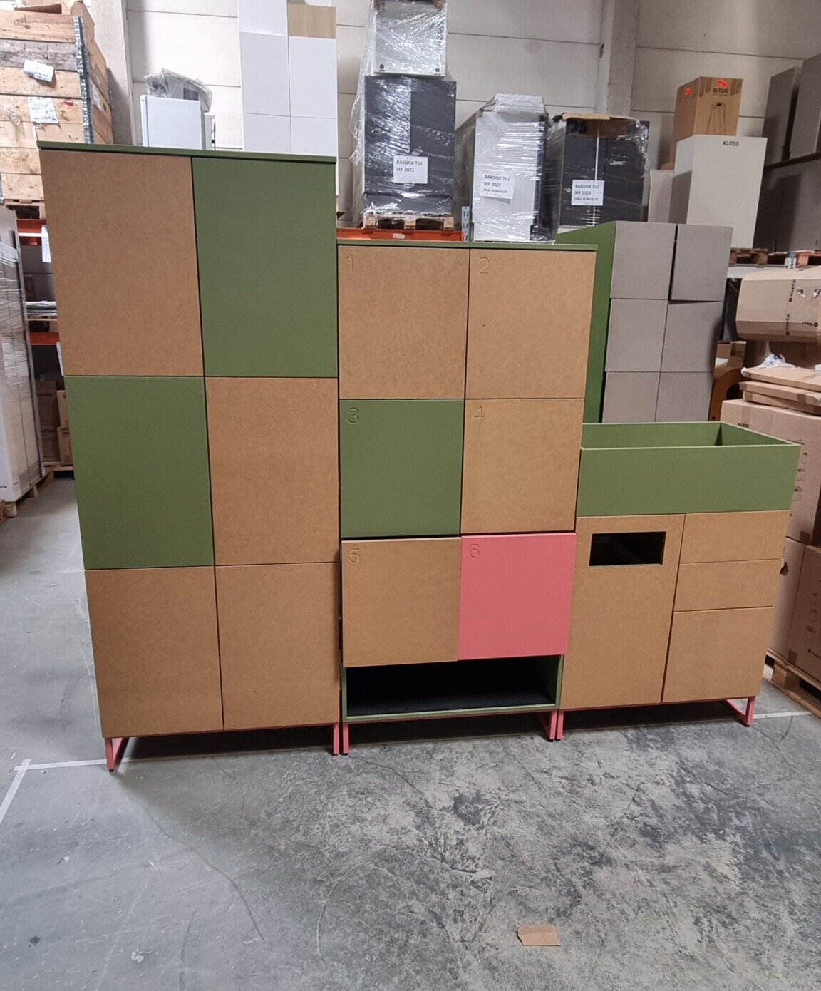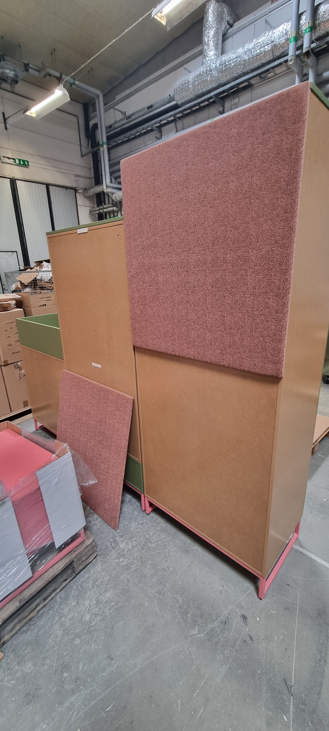 Ljudarbsorbenter klädda i tyg. Ingår: 8 flyttbart hyllplan, 2 plastkärl till blomlåda, 1 säckhållare, 2 lådinsatser. 1 av luckorna har ett litet hål som en diod suttit i. Förvaringen I mitten har ingen skohylla längst ner.
