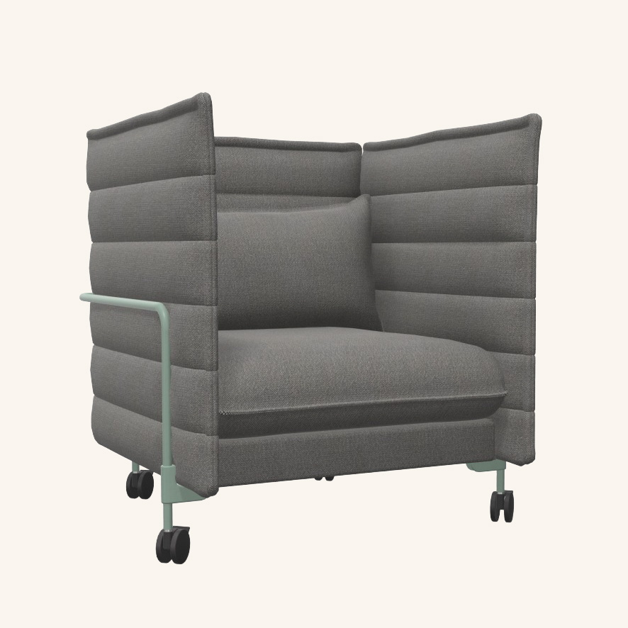 Sits och rygg i tyg (grå). Ben i metall (grön).
