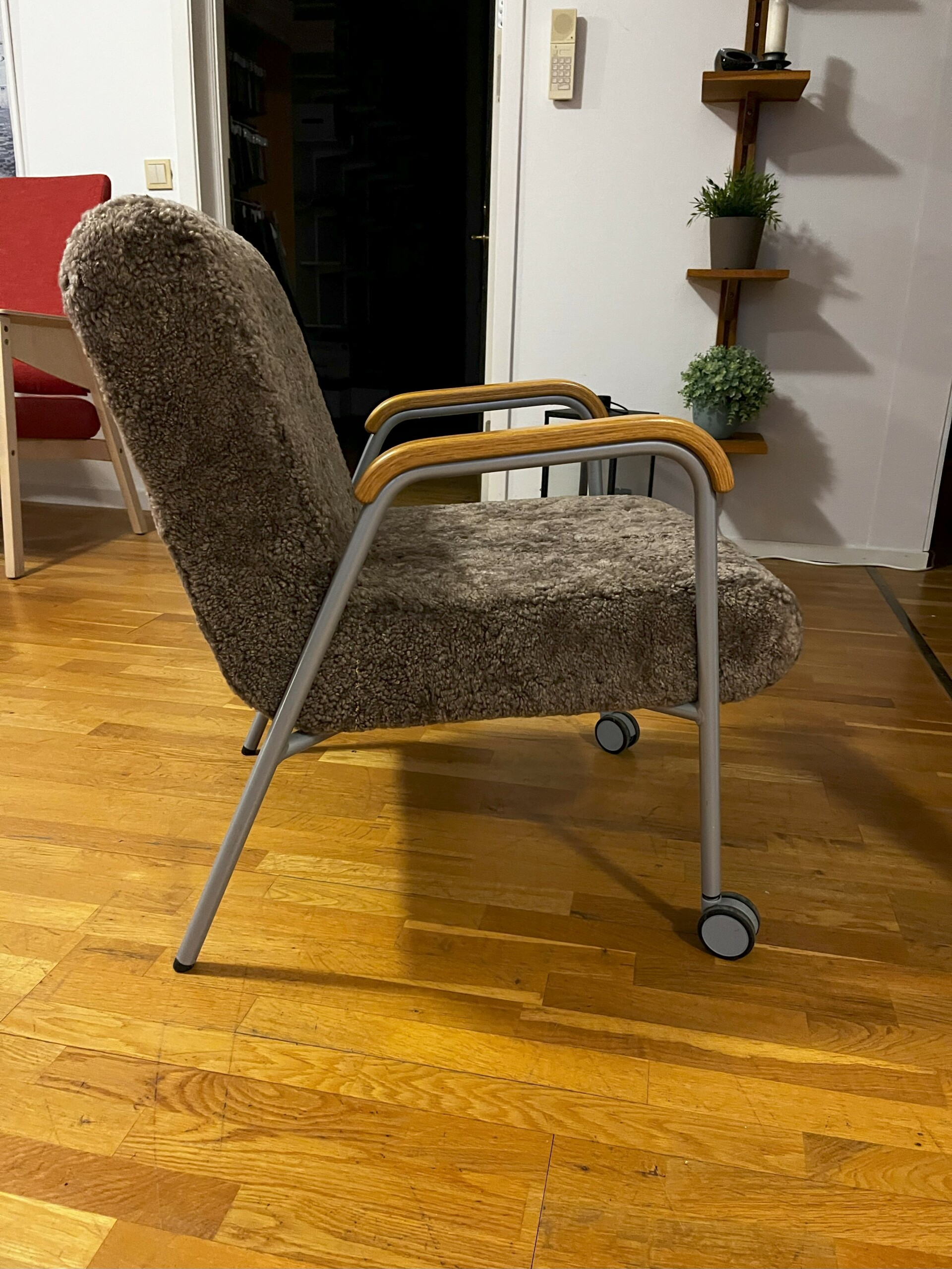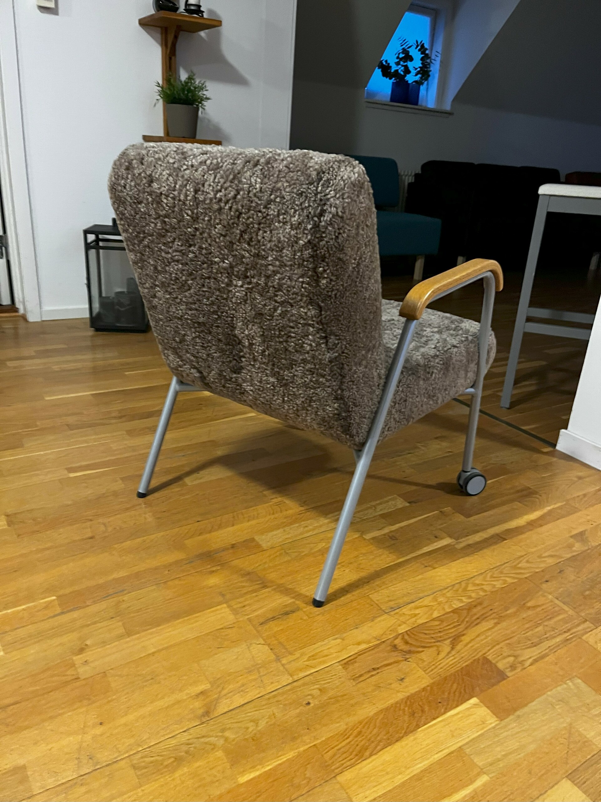 Sits och rygg i fårskinn (brun). Ben i metall (silver).