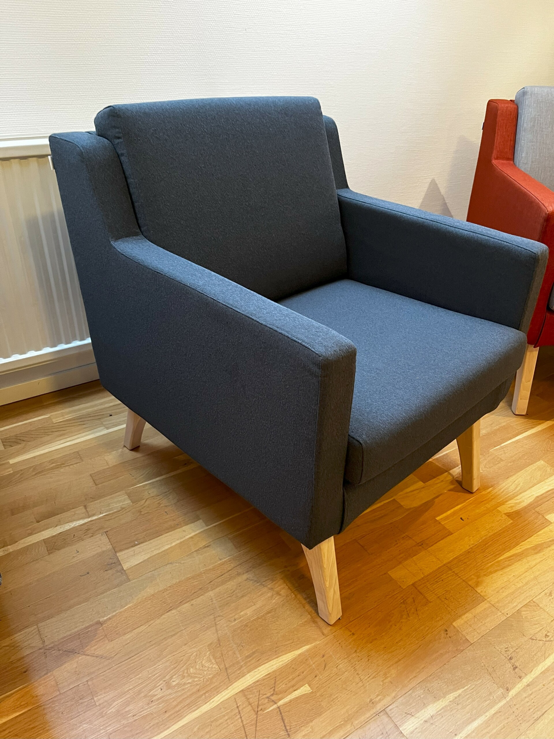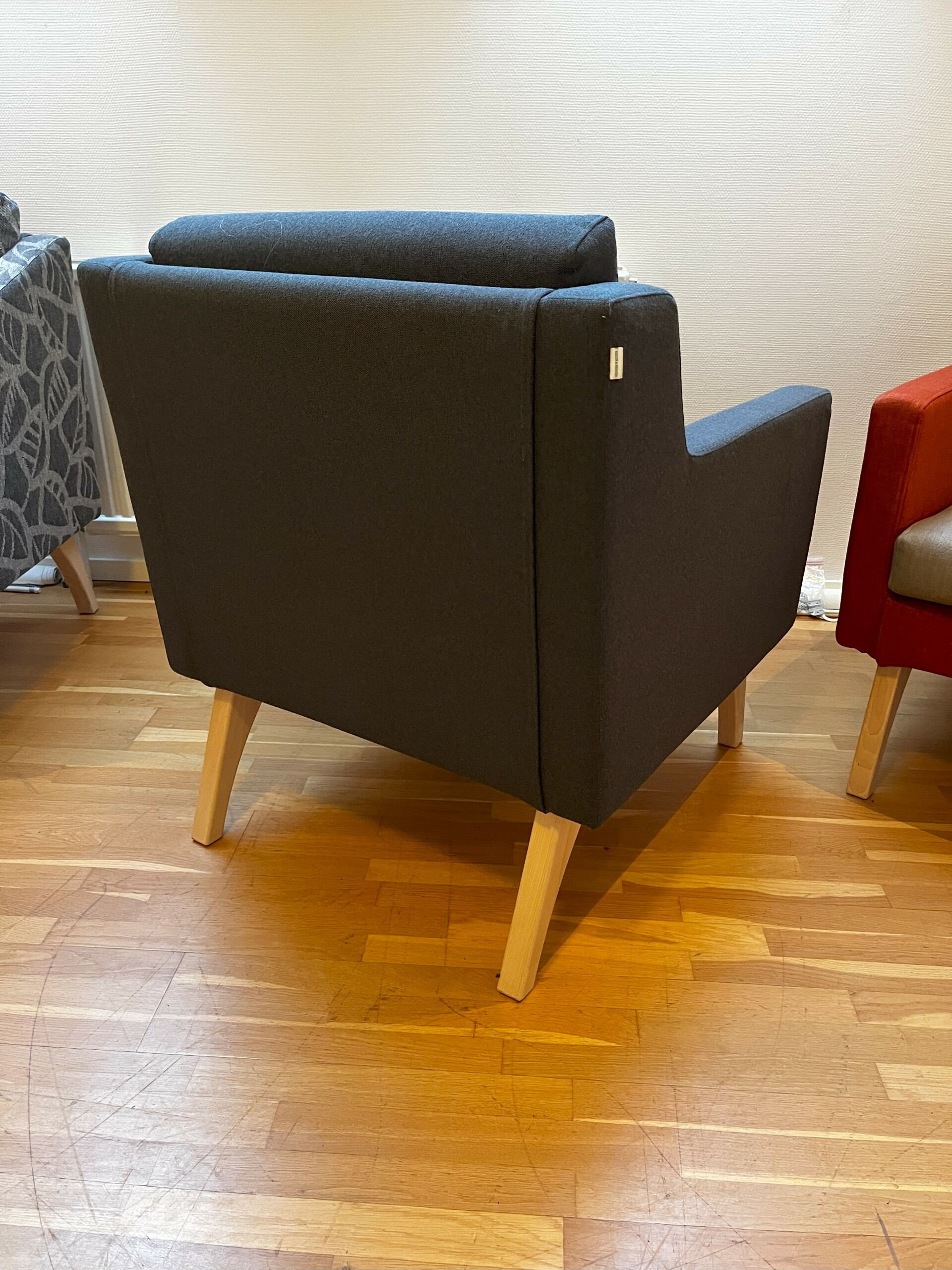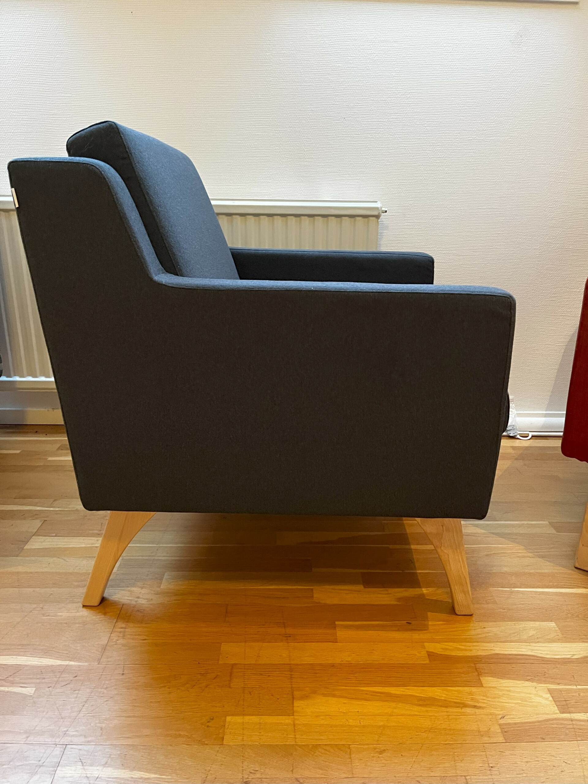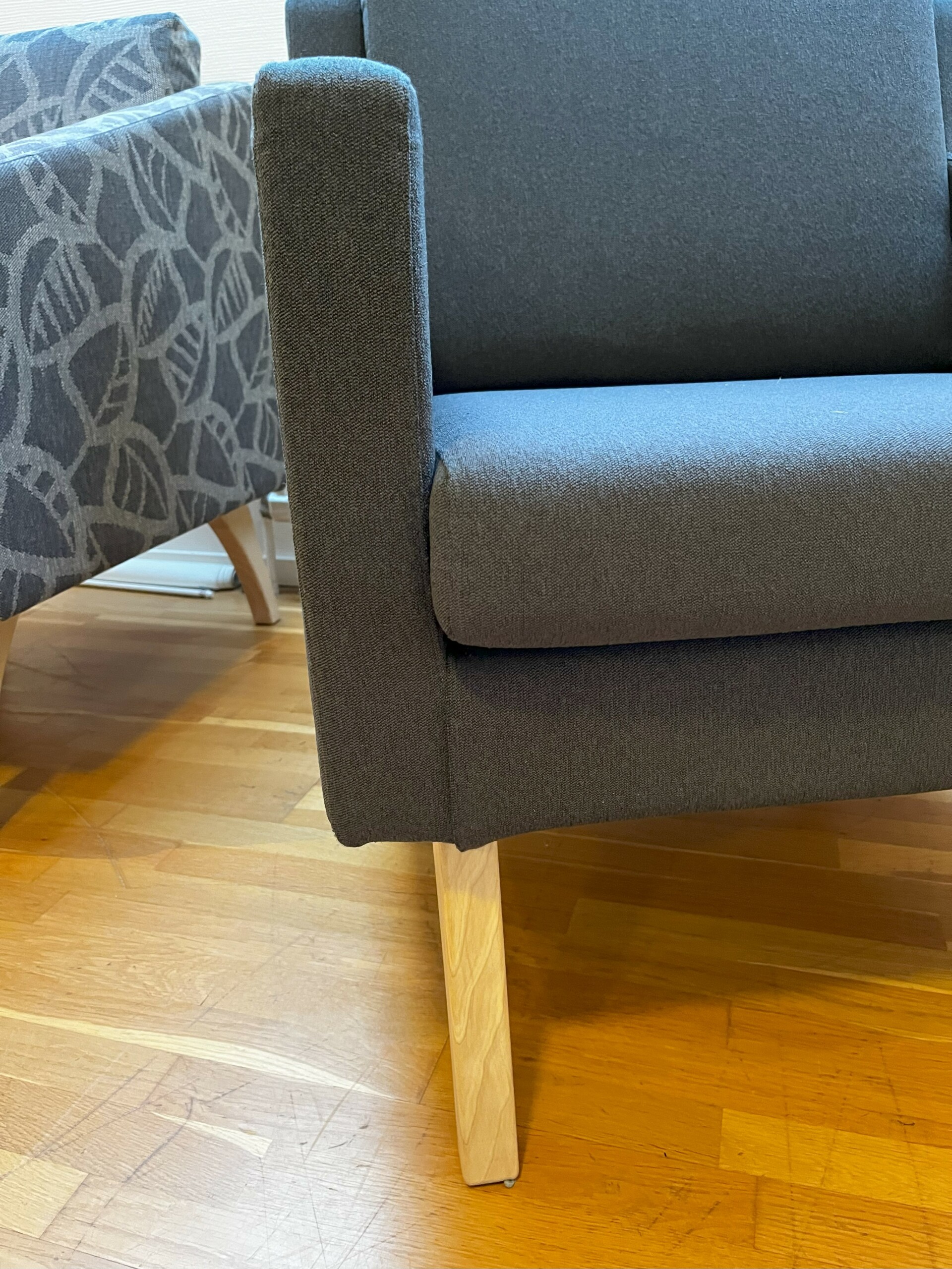 Sits och rygg i tyg (grå). Ben i trä (björk).