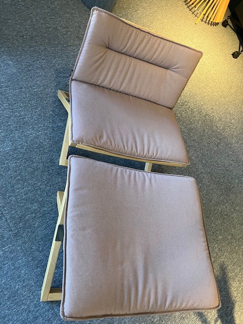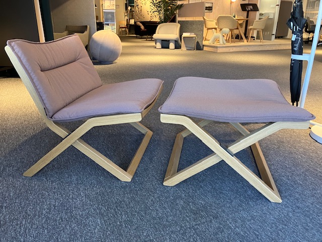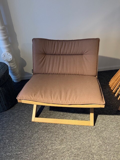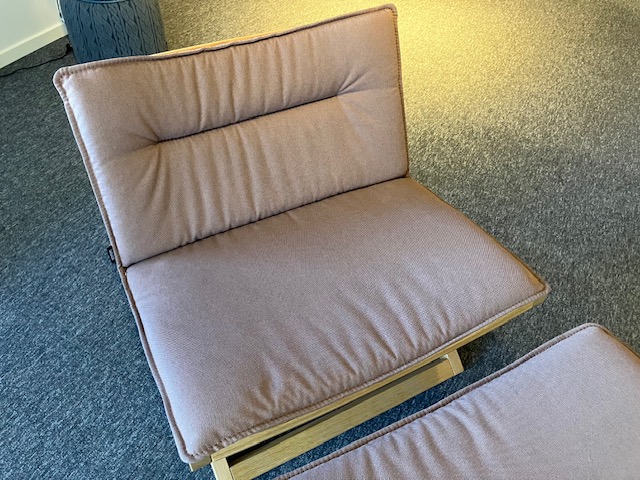 Sits och rygg i tyg (rosa). Medstativ i trä (ek).