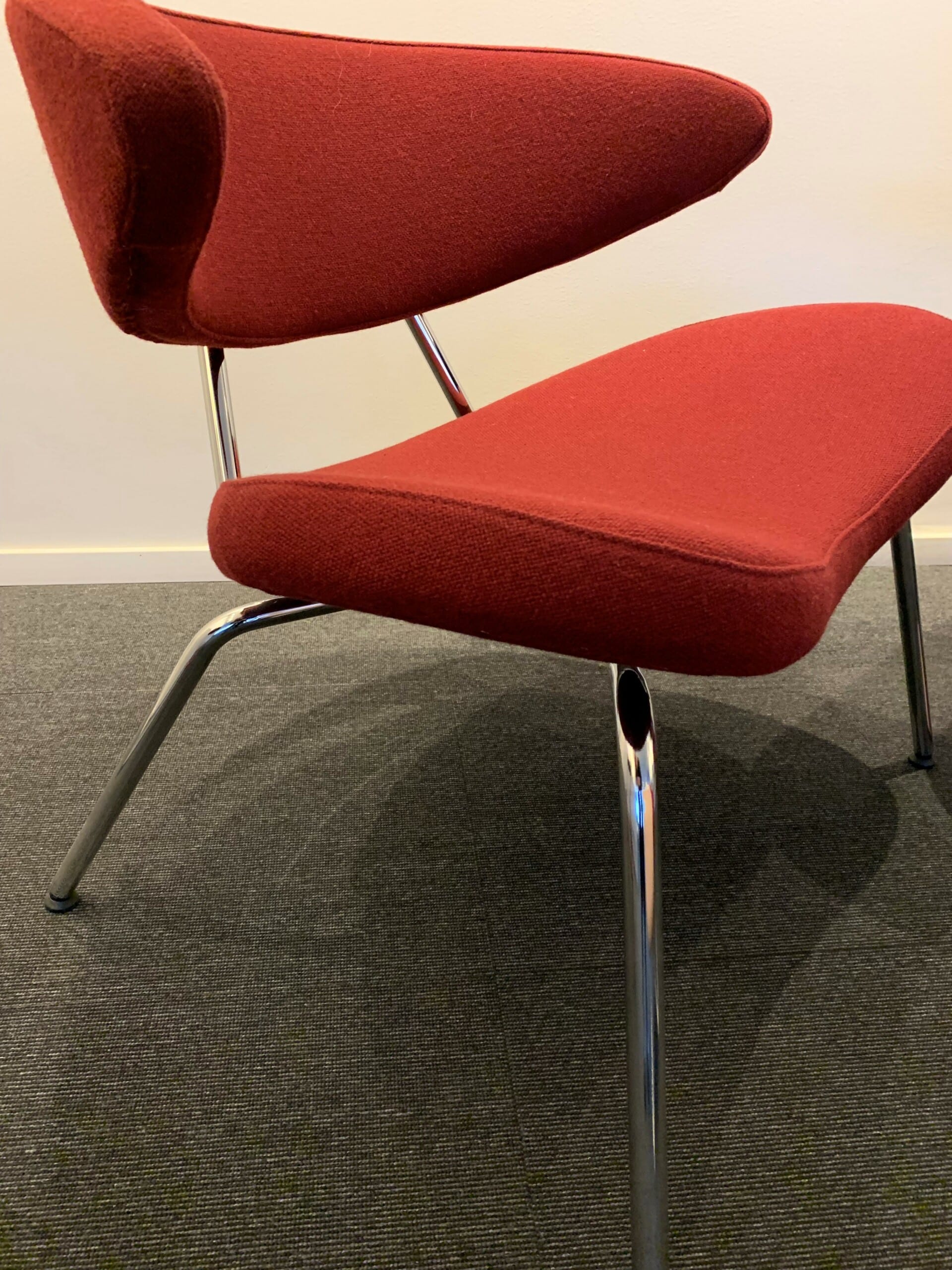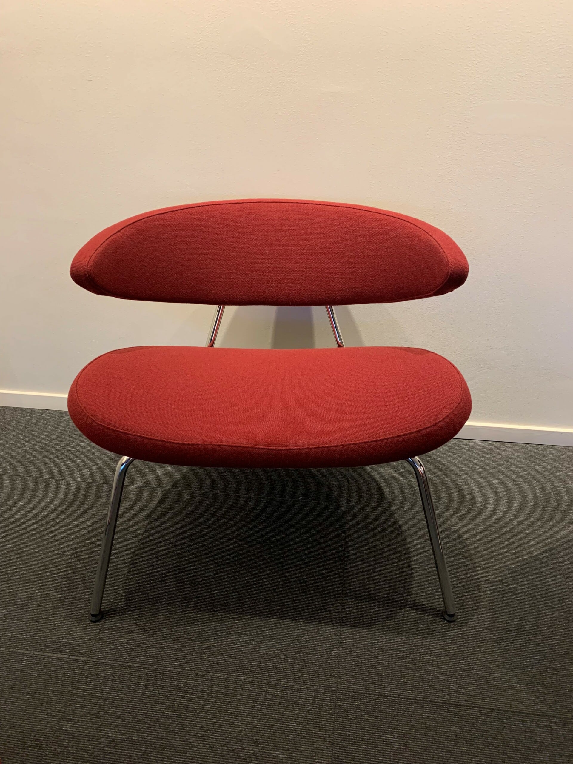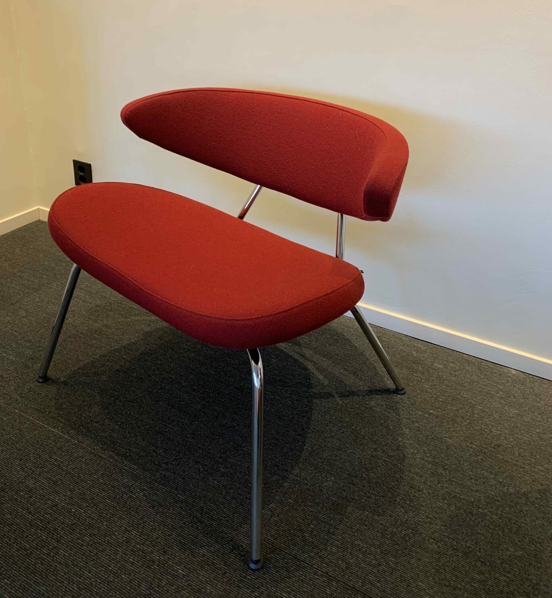 Sits och rygg i tyg (röd). Ben i metall (krom).