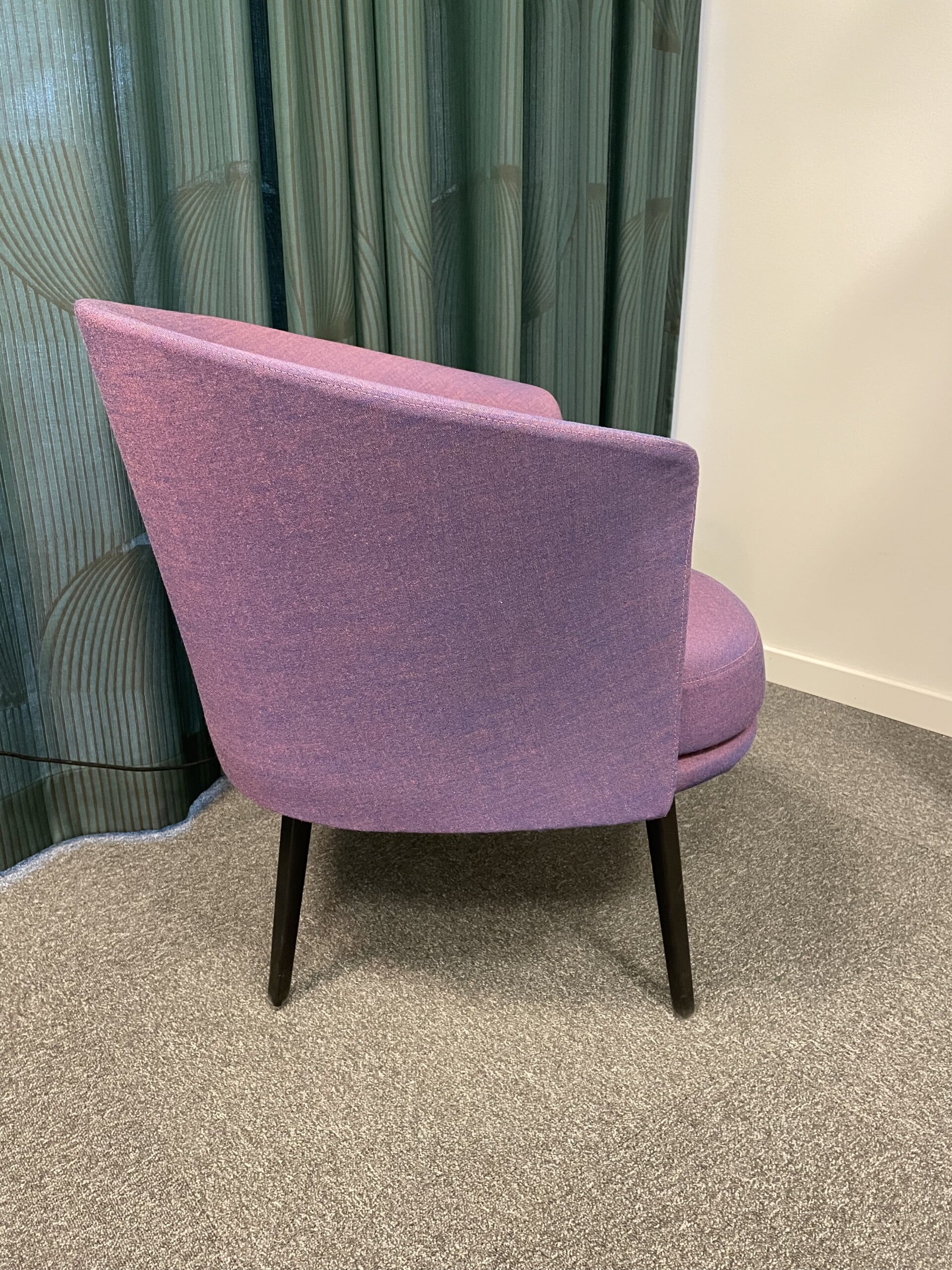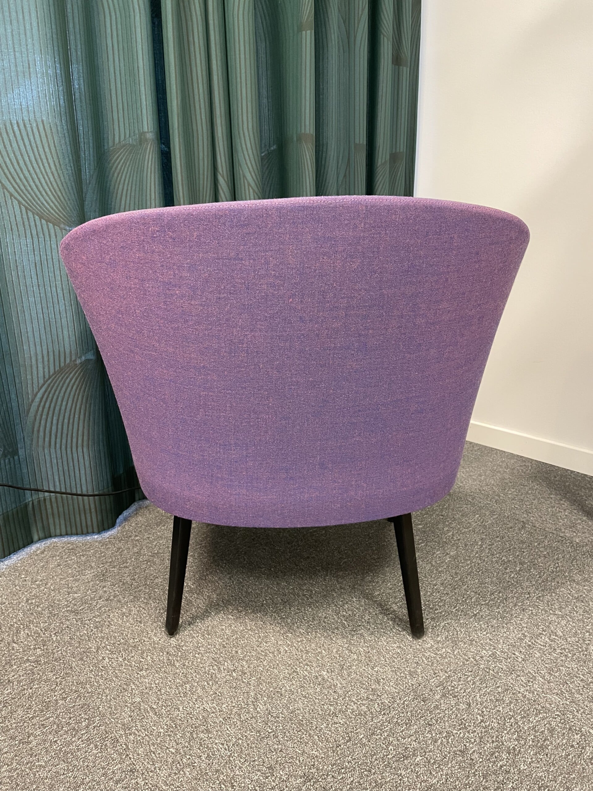 Sits och rygg i tyg (lila). Ben i metall (svart).