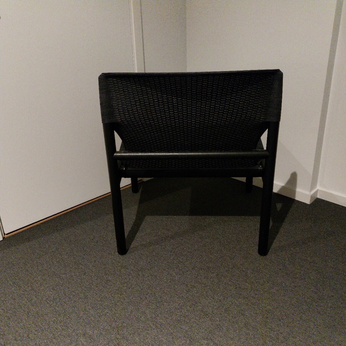 Sits och rygg i tyg (svart). Ben i trä (svart).