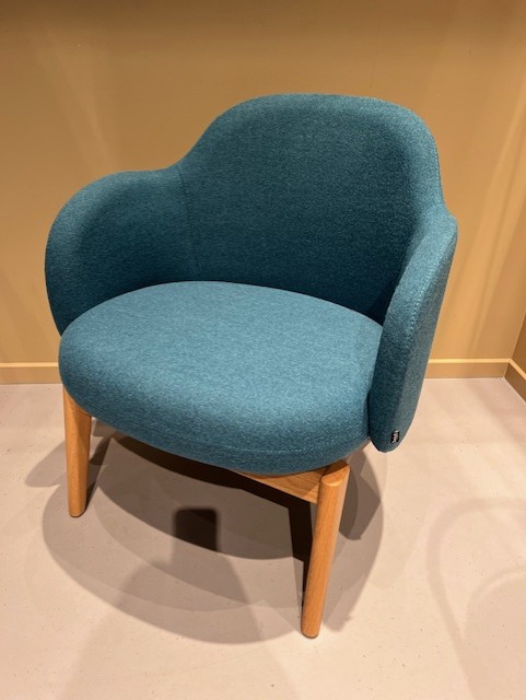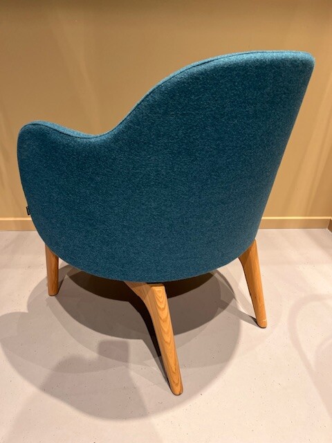 Sits och rygg i tyg (turkos). Ben i trä (ek).
