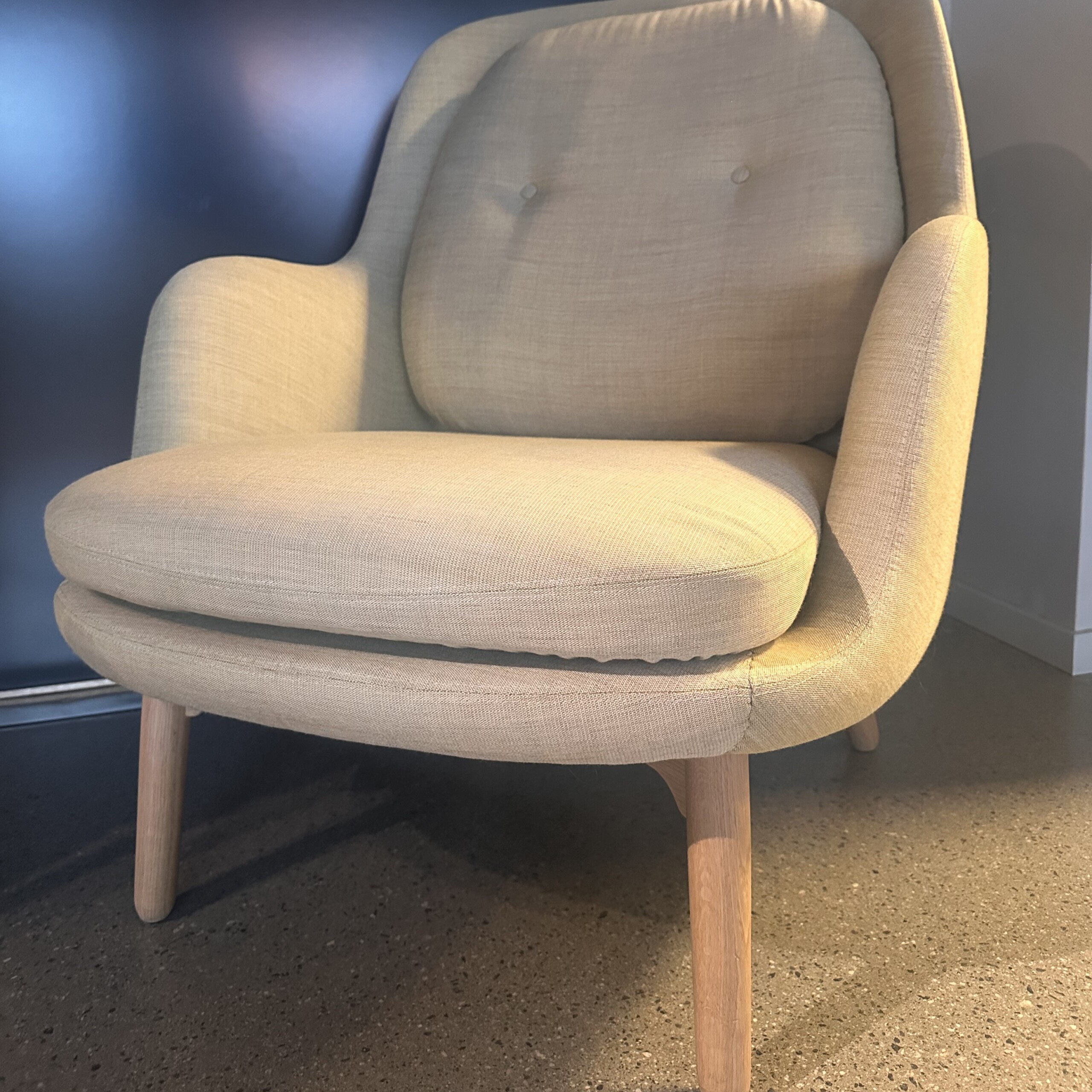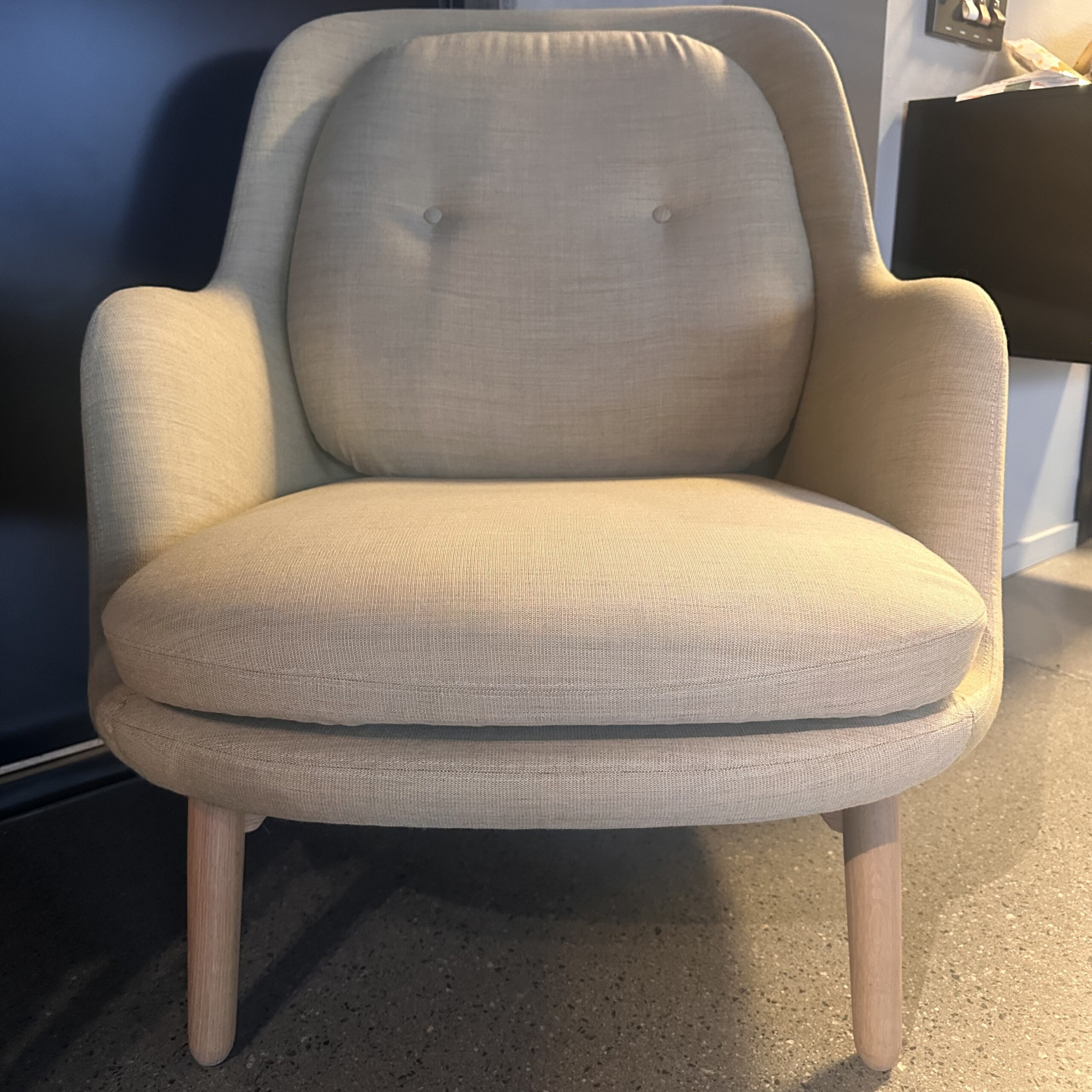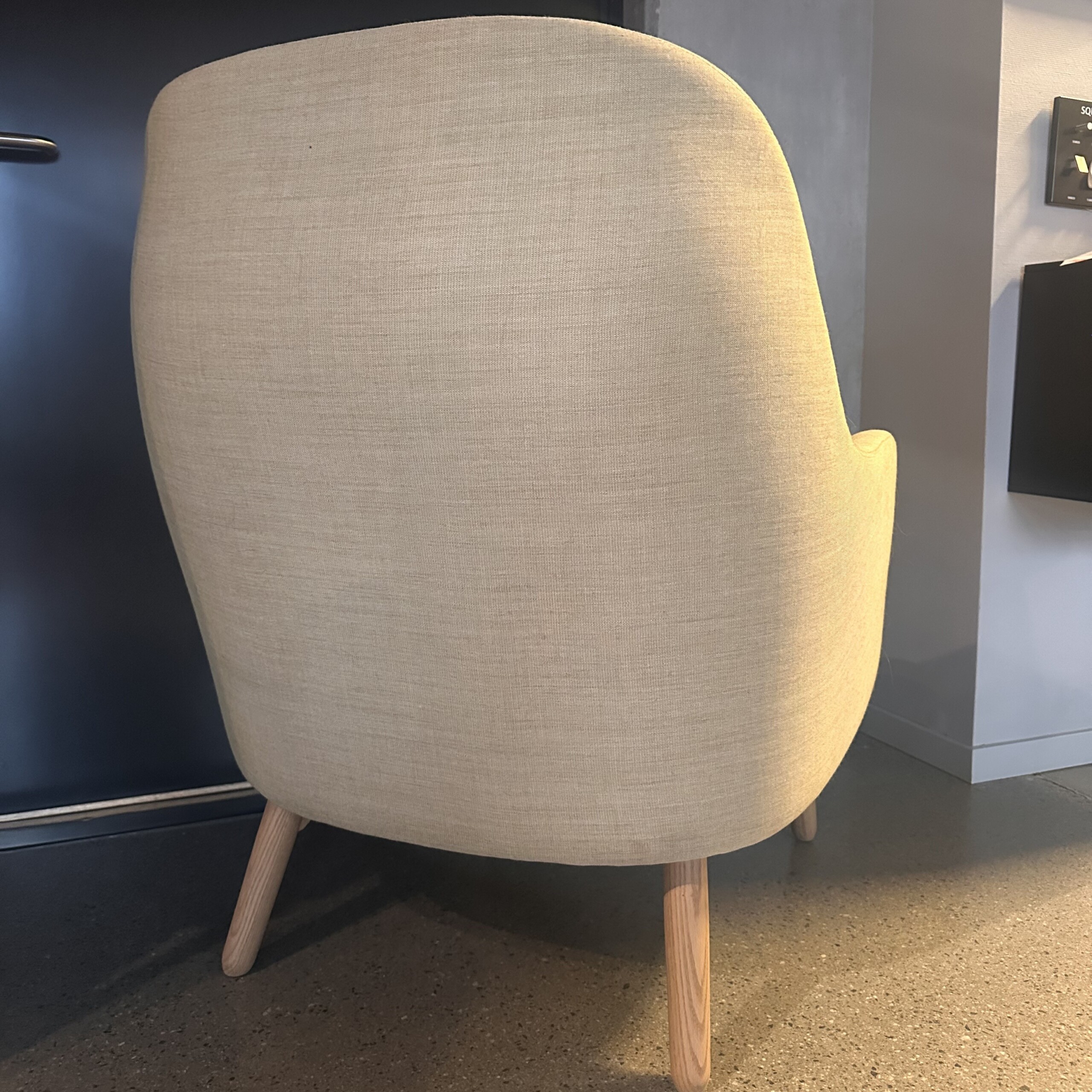 Sits och rygg i tyg (beige). Ben i trä (ek).