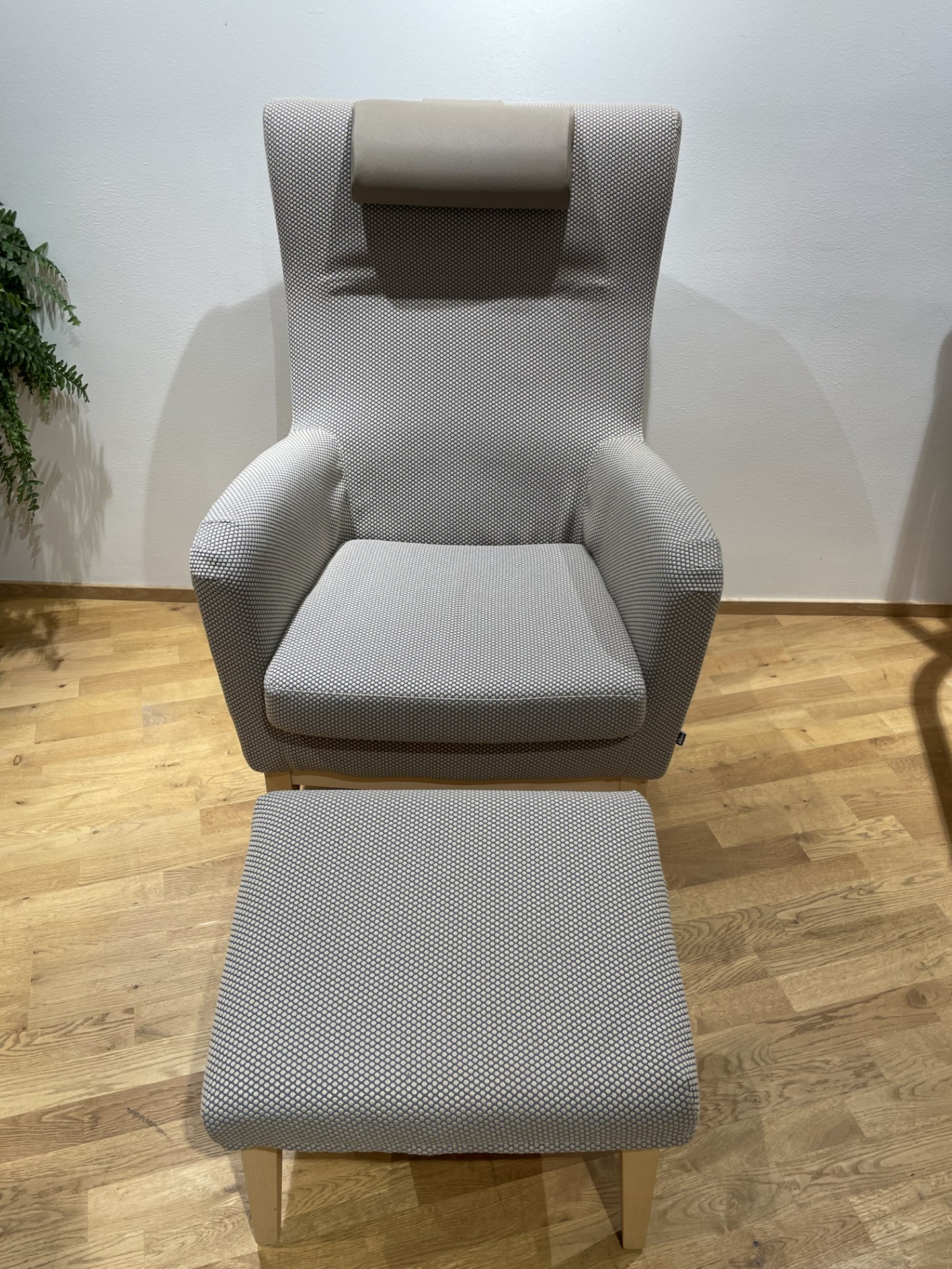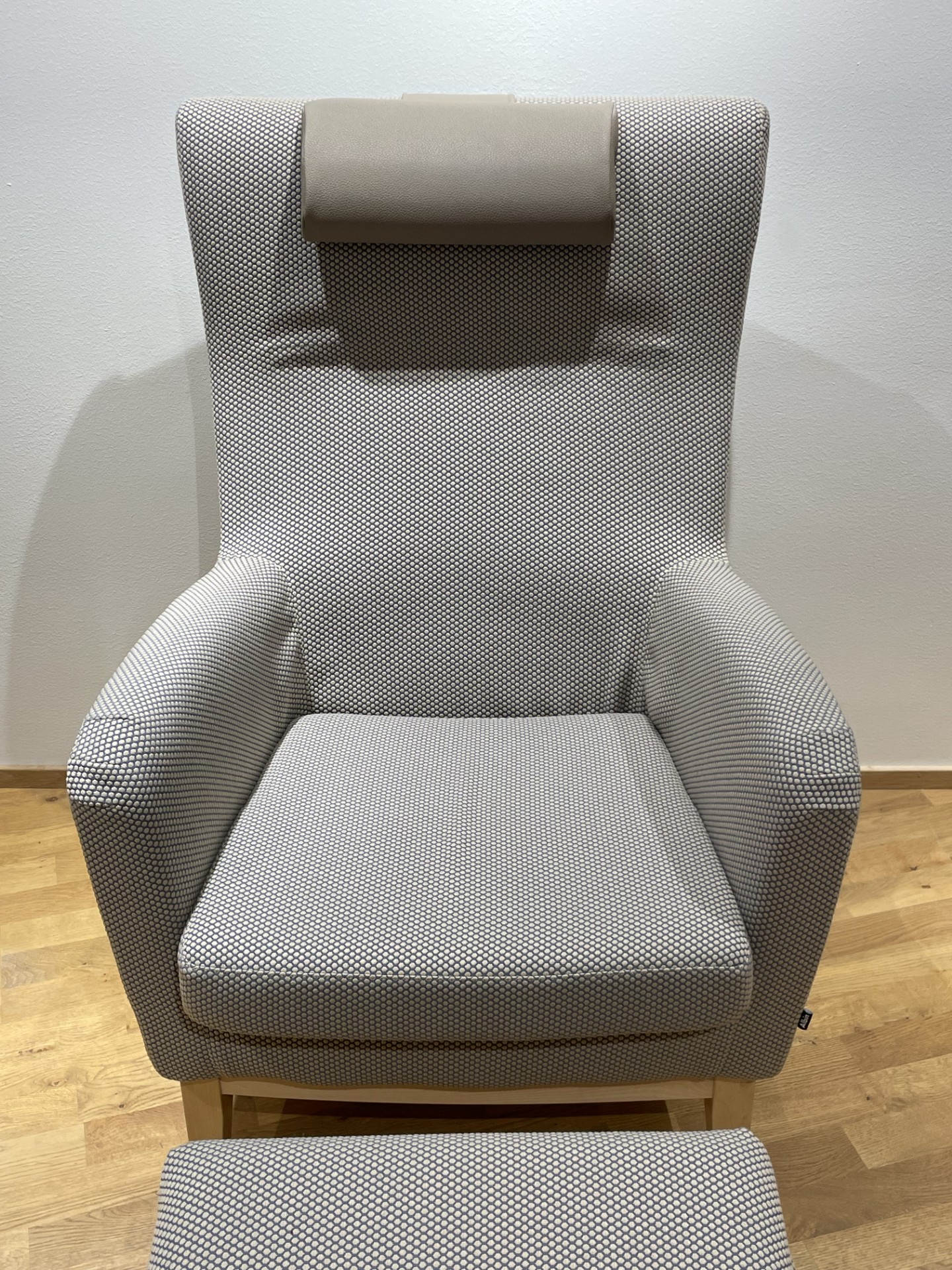Sits och rygg i tyg. Ben i trä (björk).
