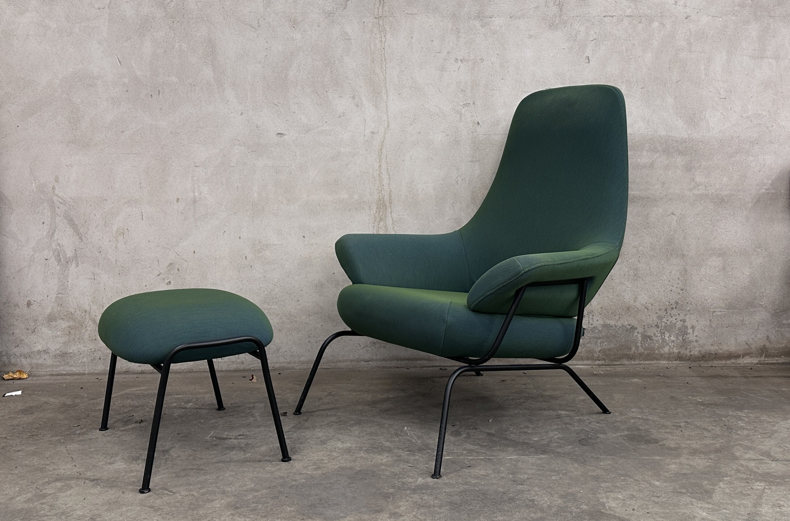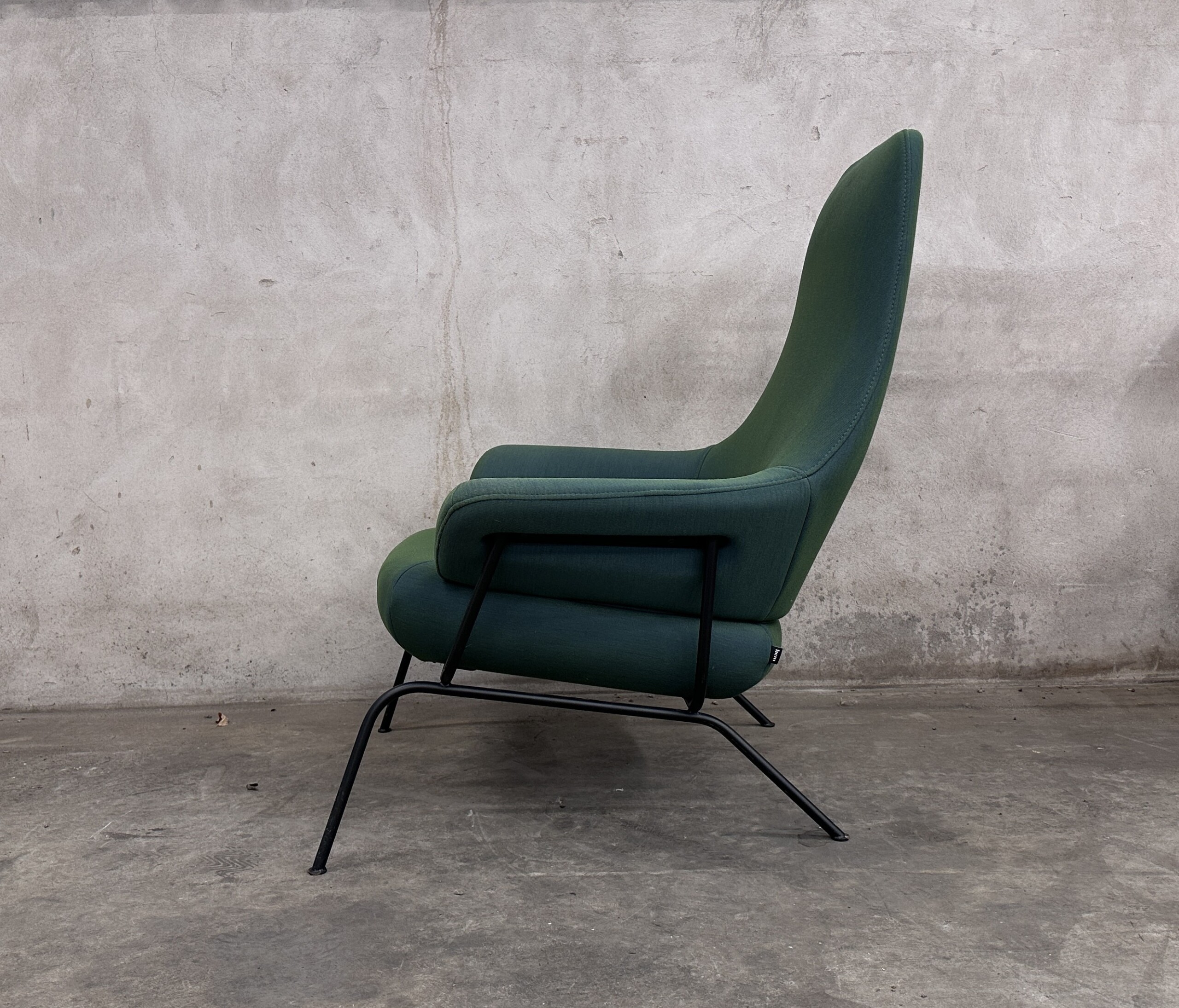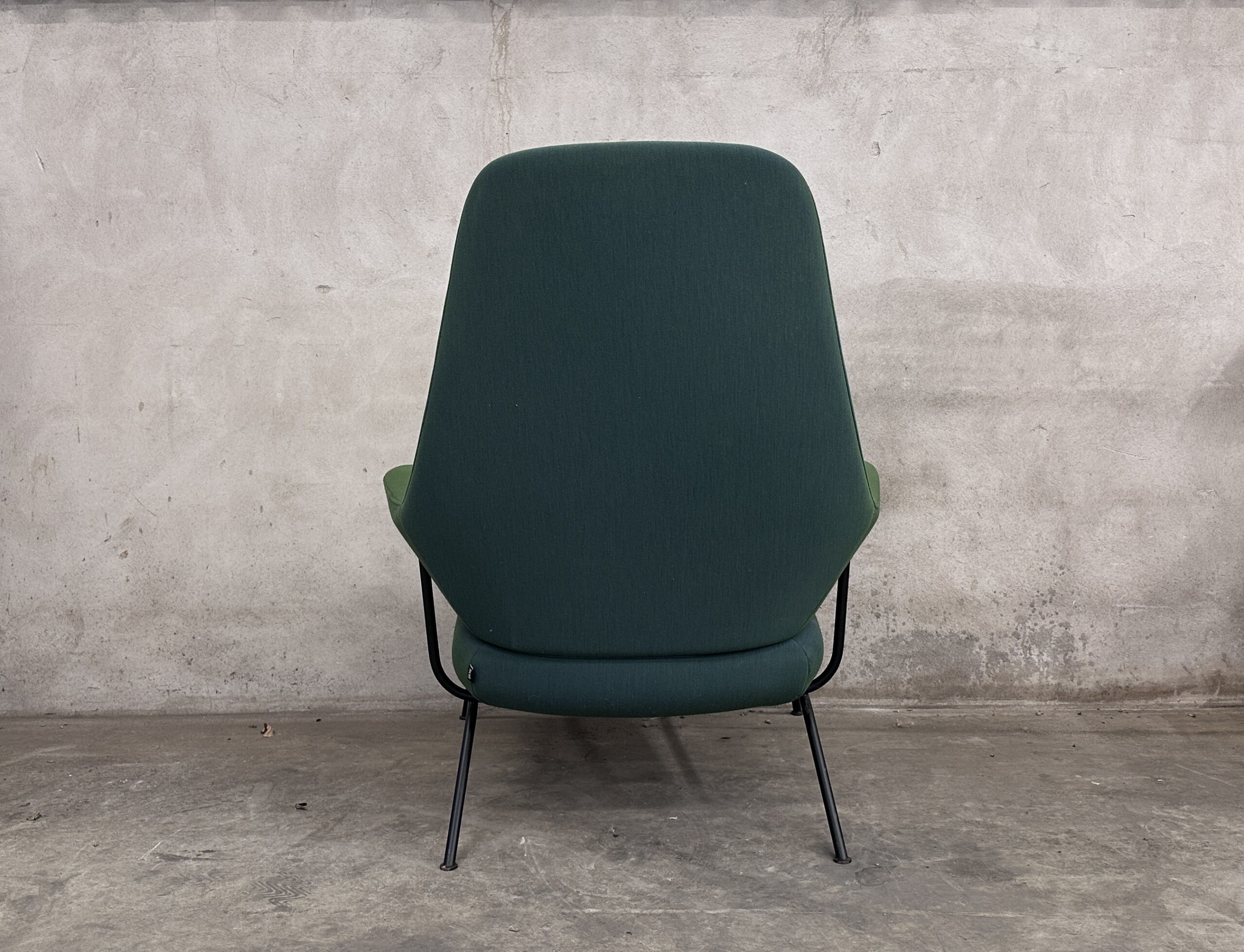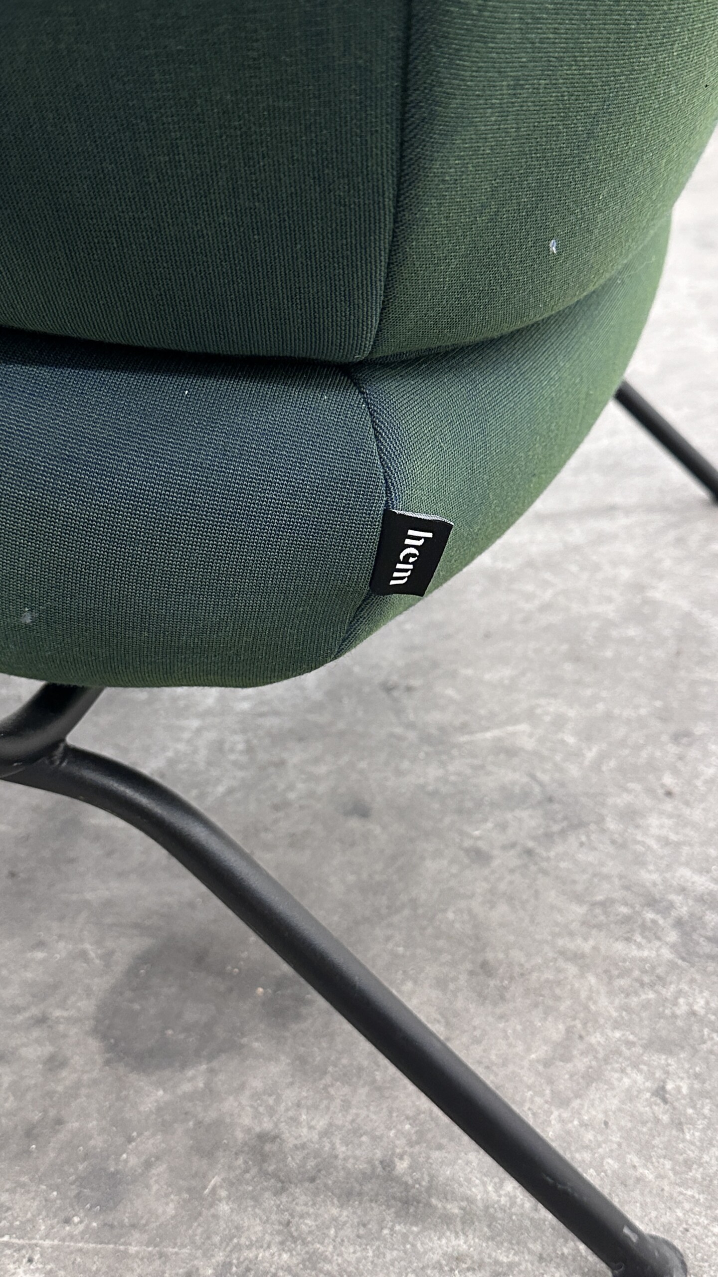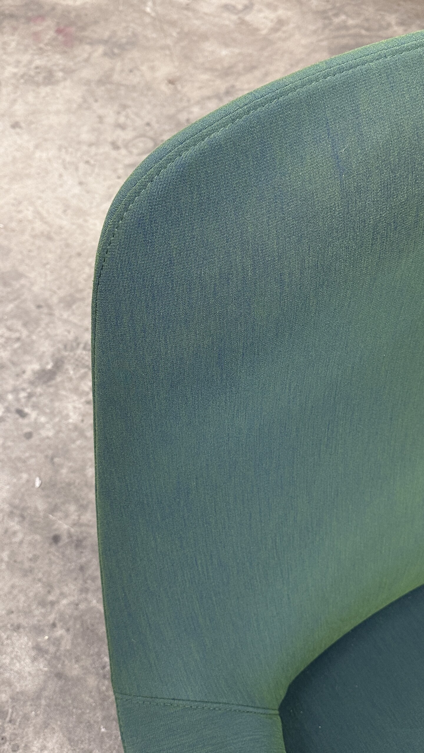 Sits och rygg i tyg (grön). Ben i metall (svart).