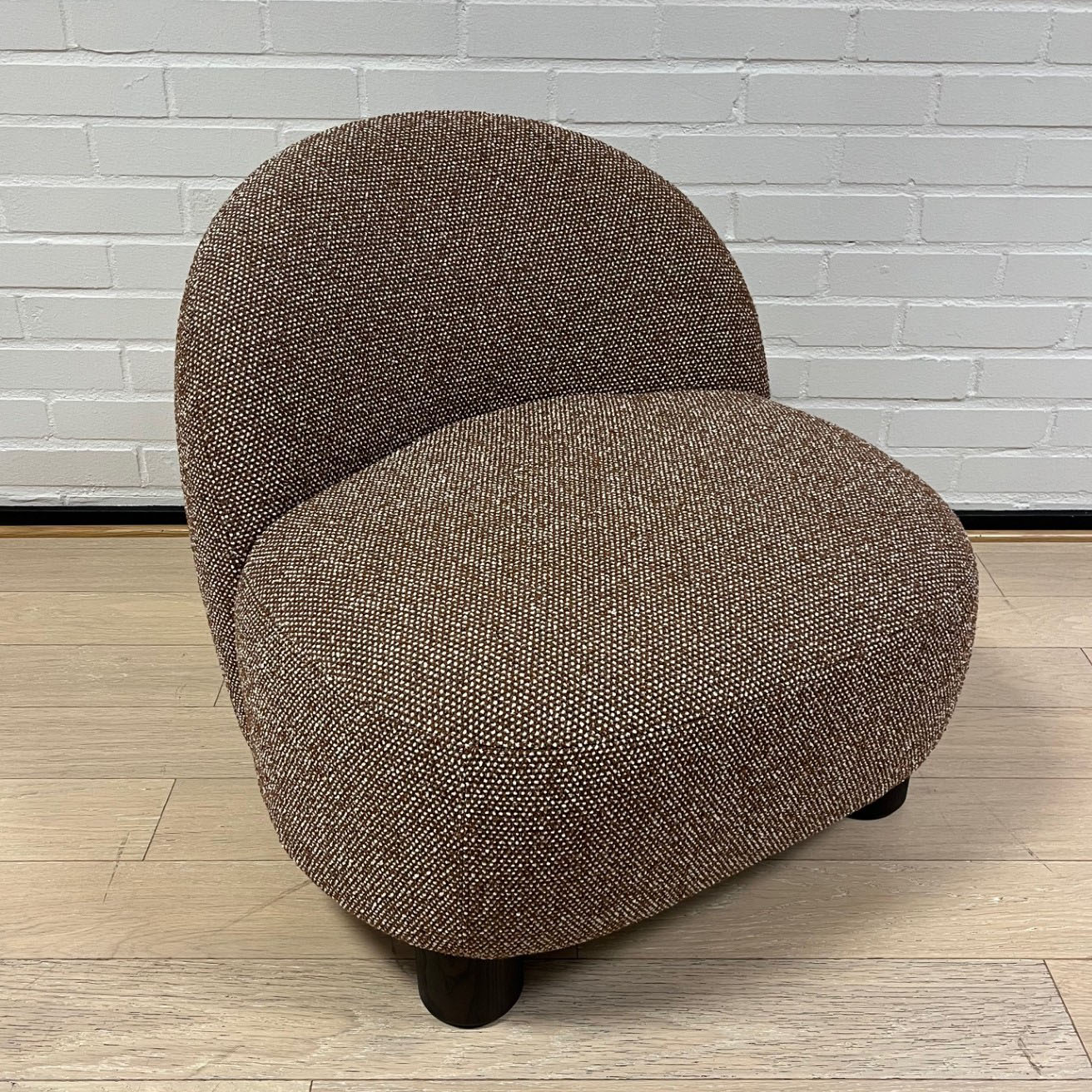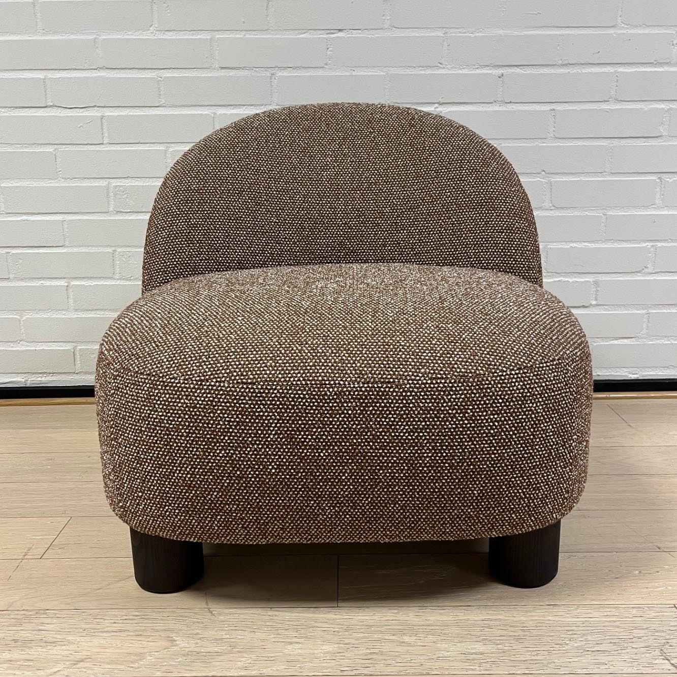 Sits och rygg i tyg (brun). Ben i trä (brun).