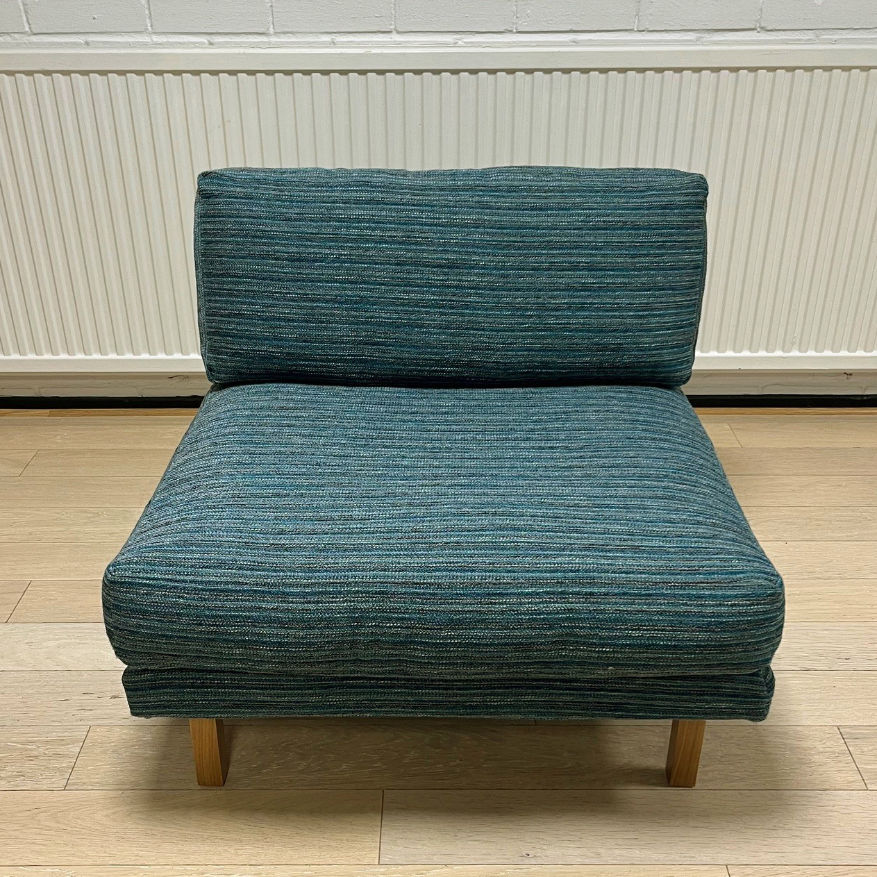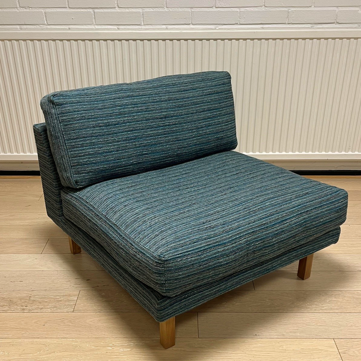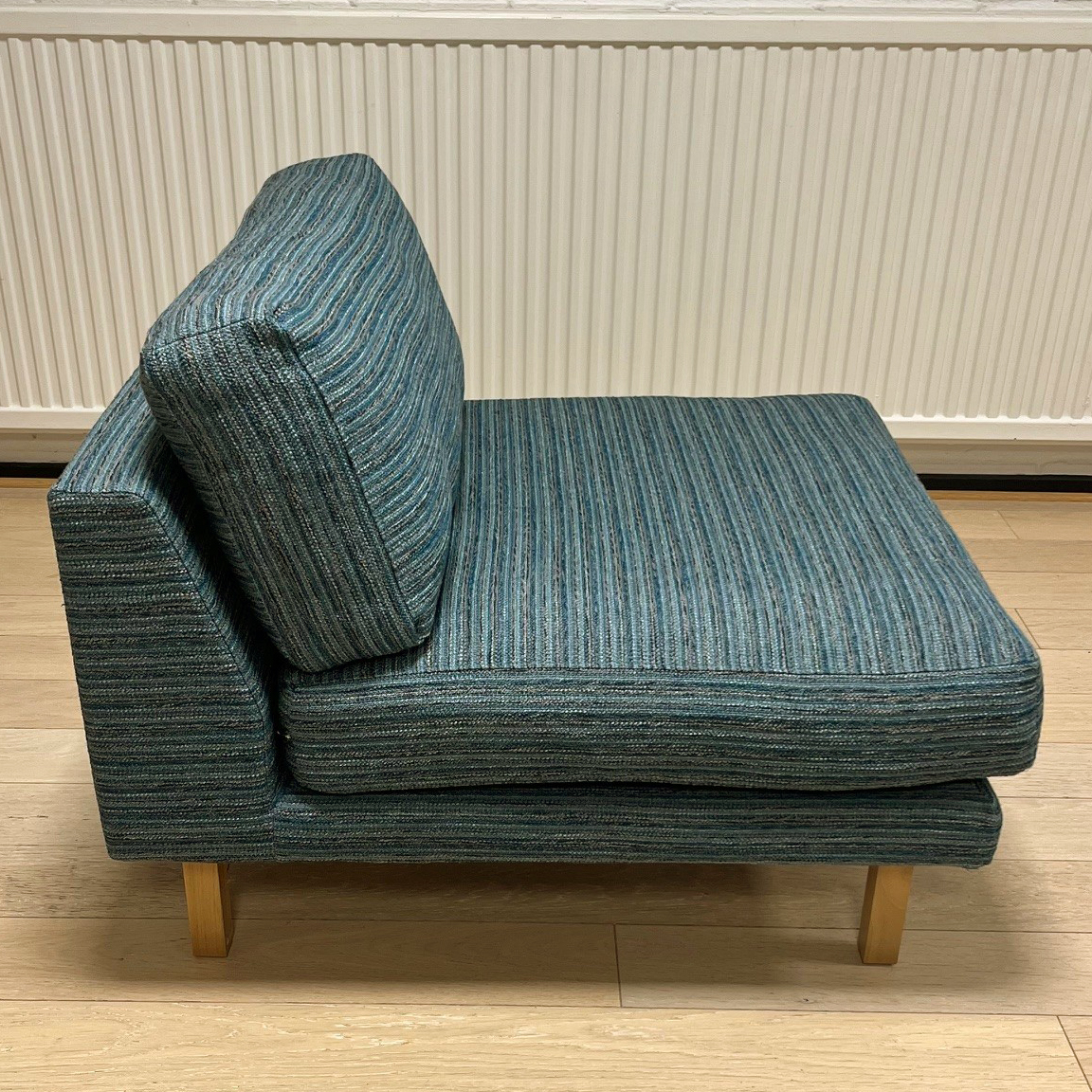 Sits och rygg i tyg (turkos). Ben i trä (valnöt).