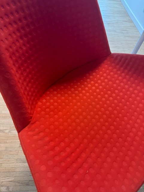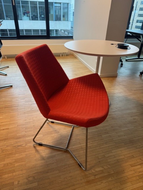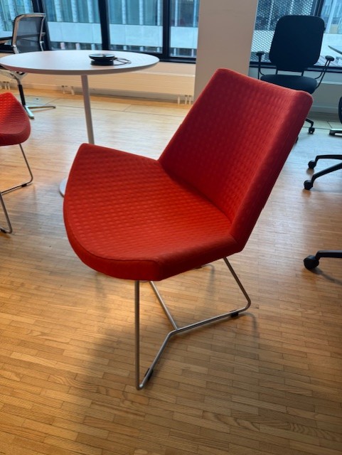 Sits och rygg i tyg (röd). Medstativ i metall (rostfritt).