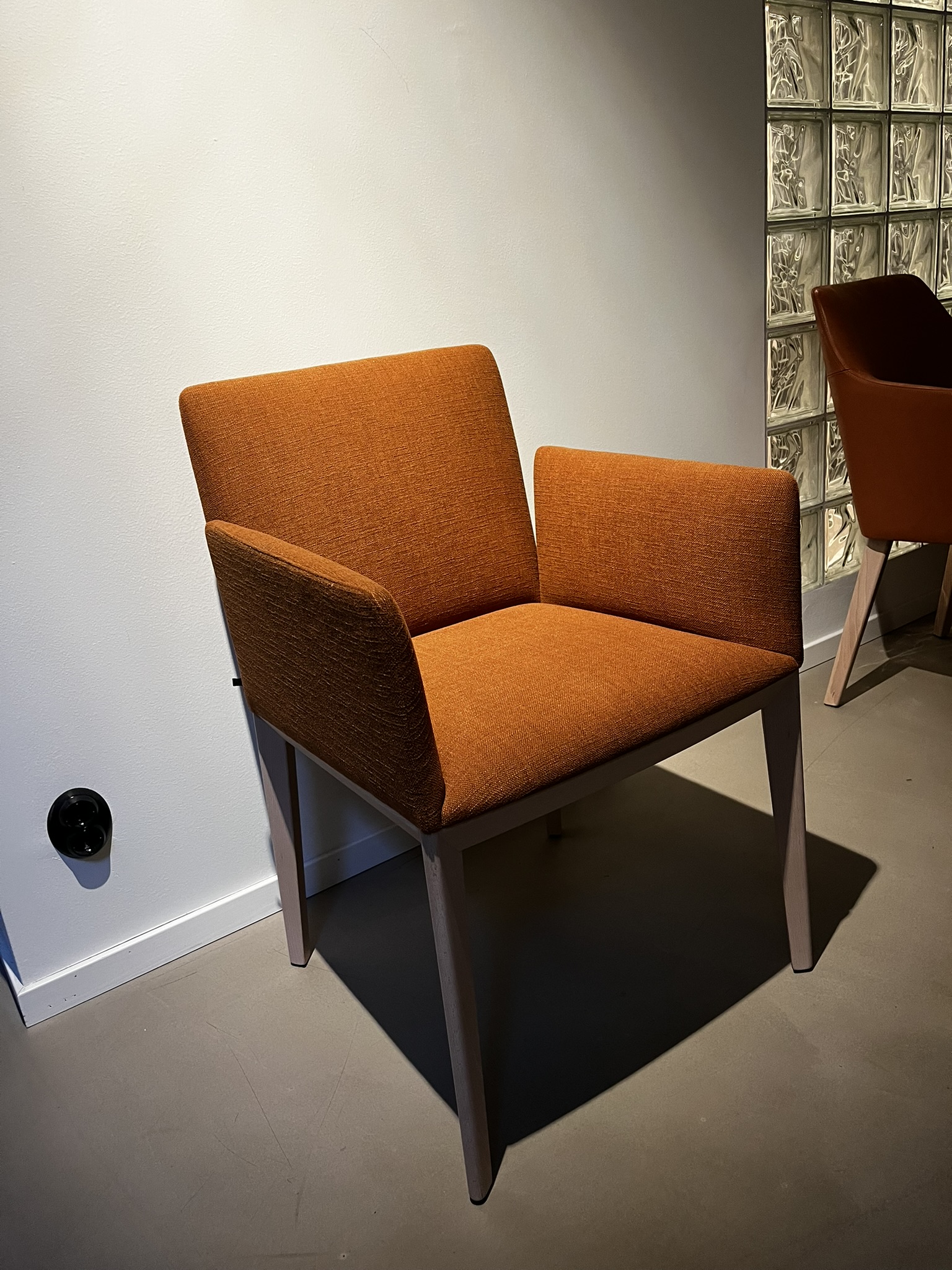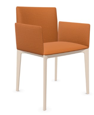 Sits och rygg i tyg (orange). Ben i trä (ask).