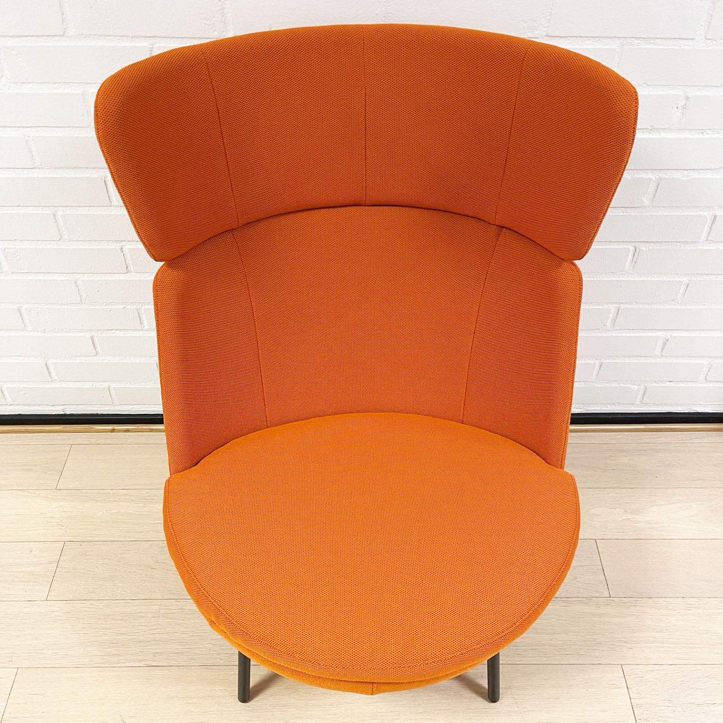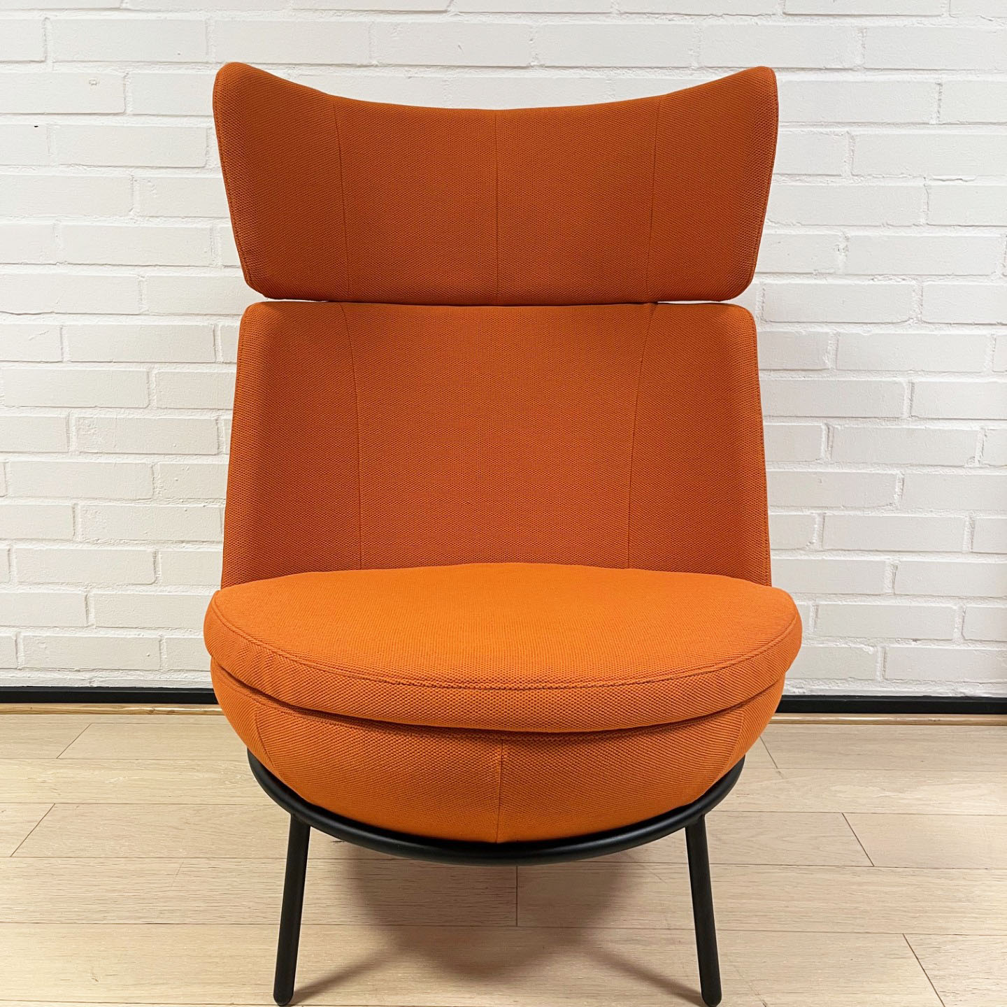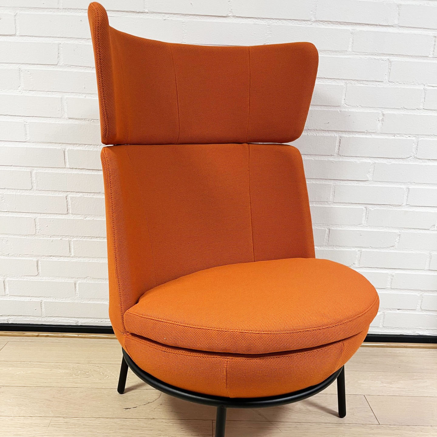 Sits och rygg i tyg (orange). Ben i metall (svart).