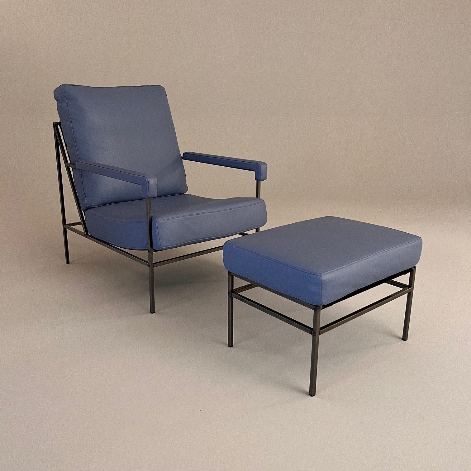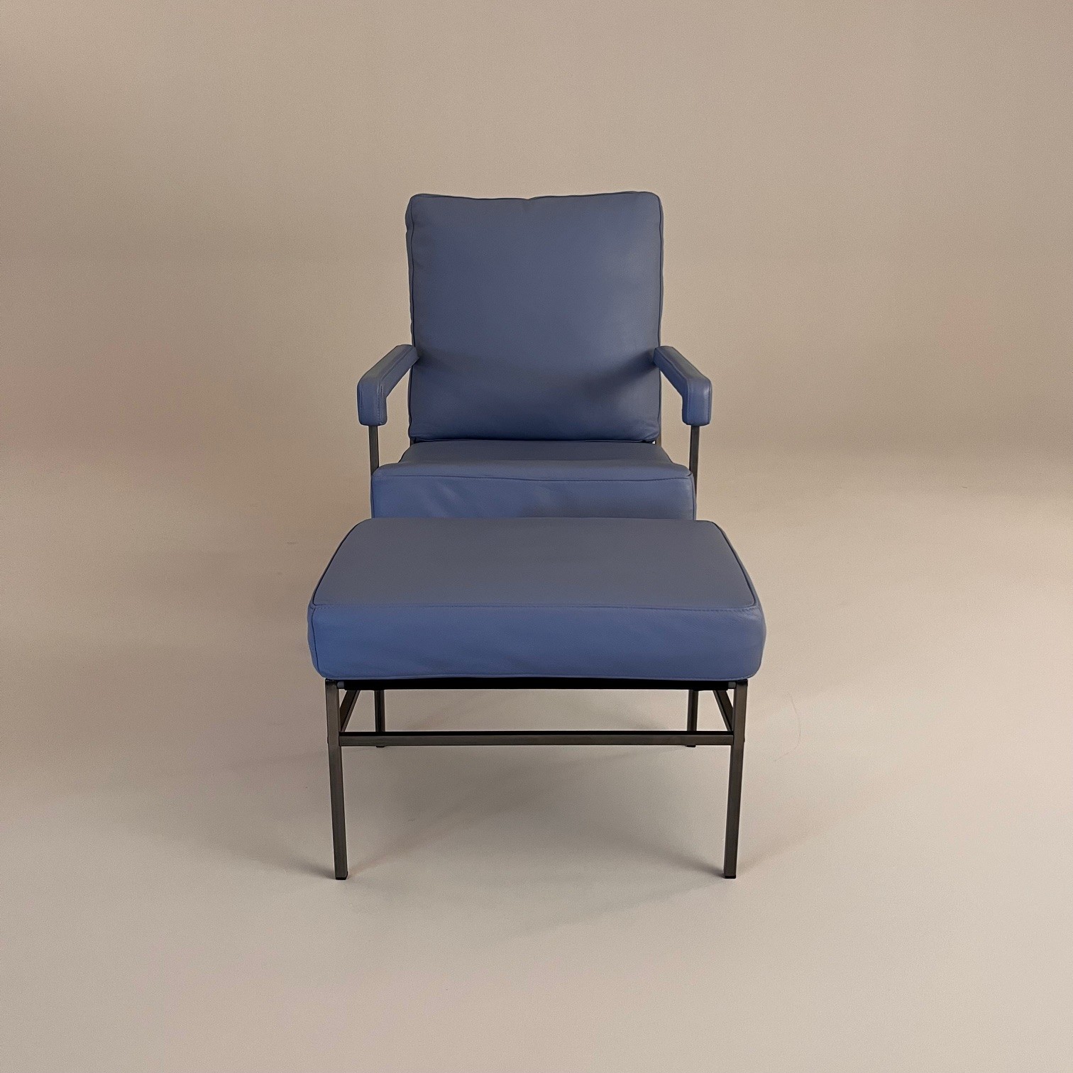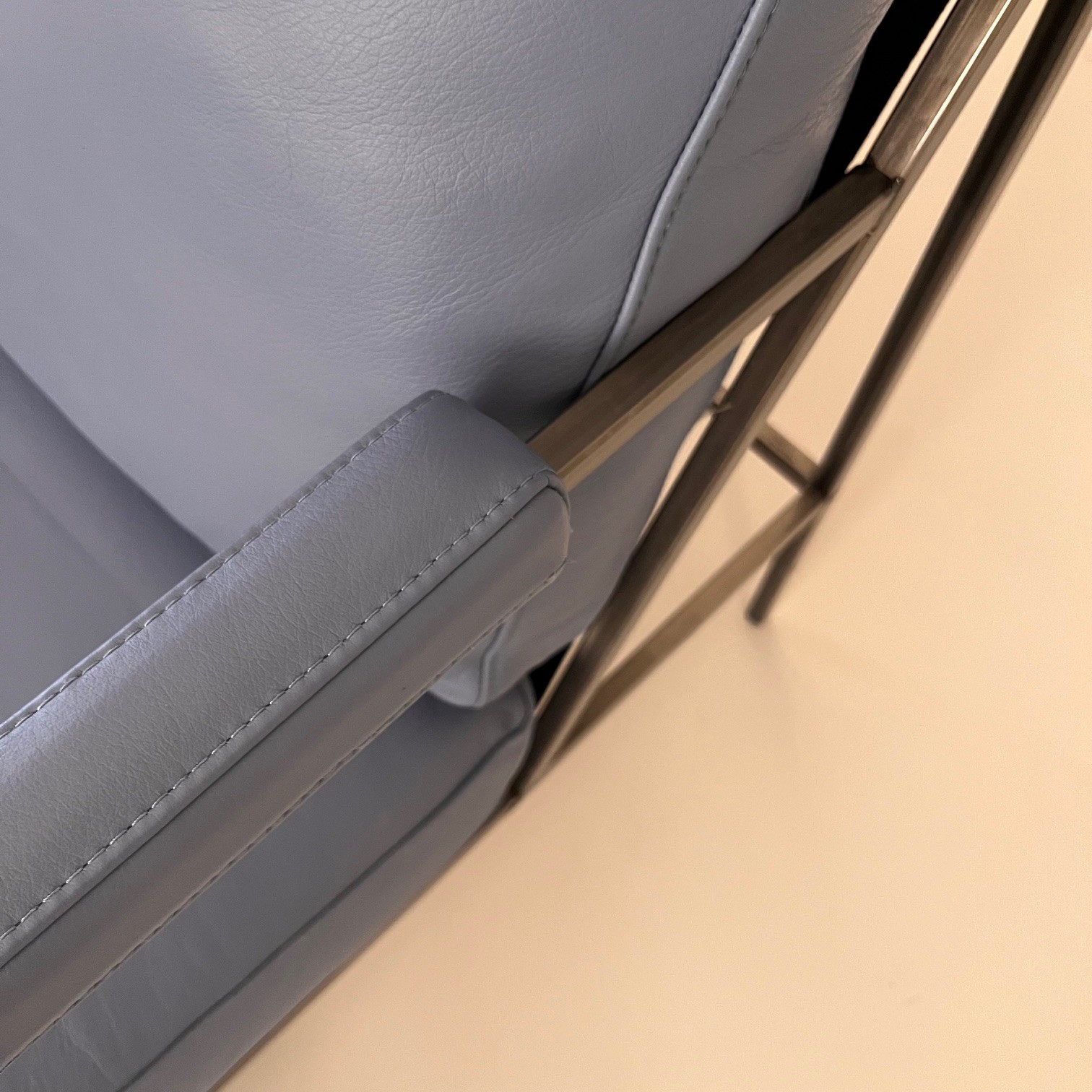 Sits och rygg i läder (blå). Ben i metall (grå).