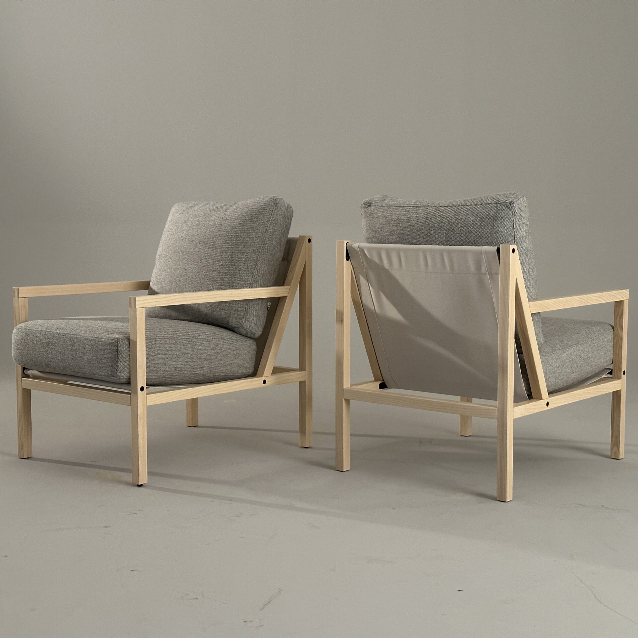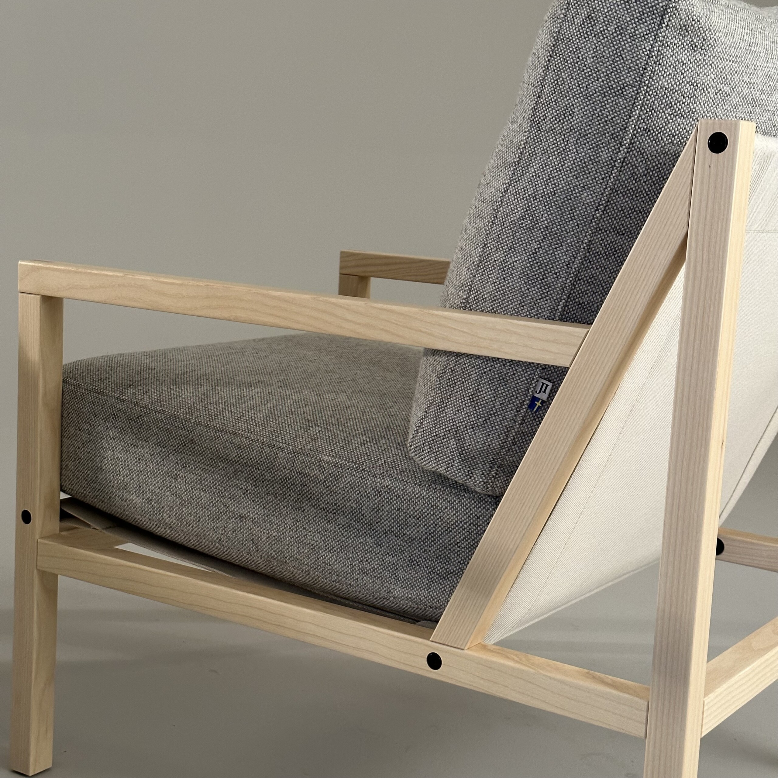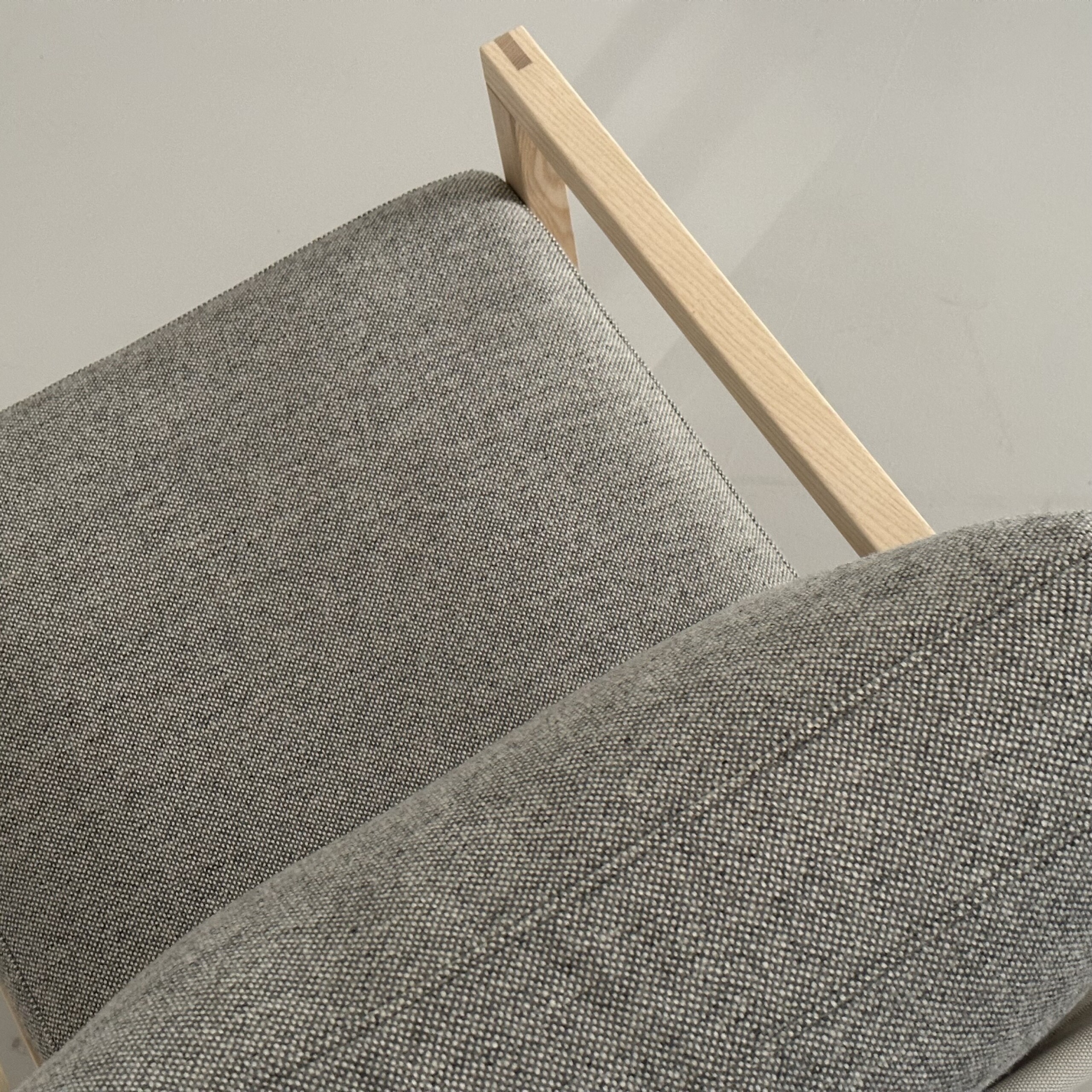 Sits och rygg i tyg (grå). Ben i trä (ask).
