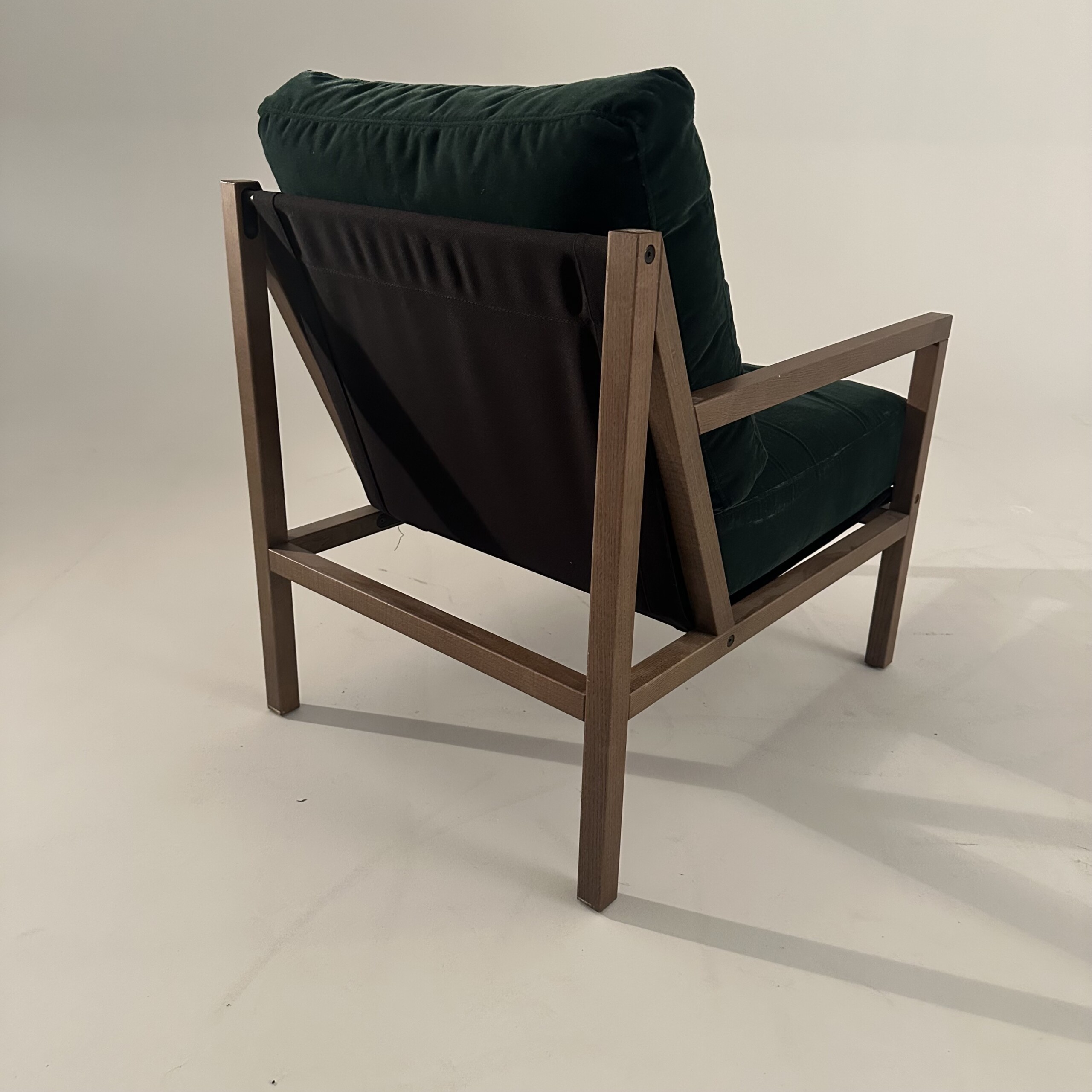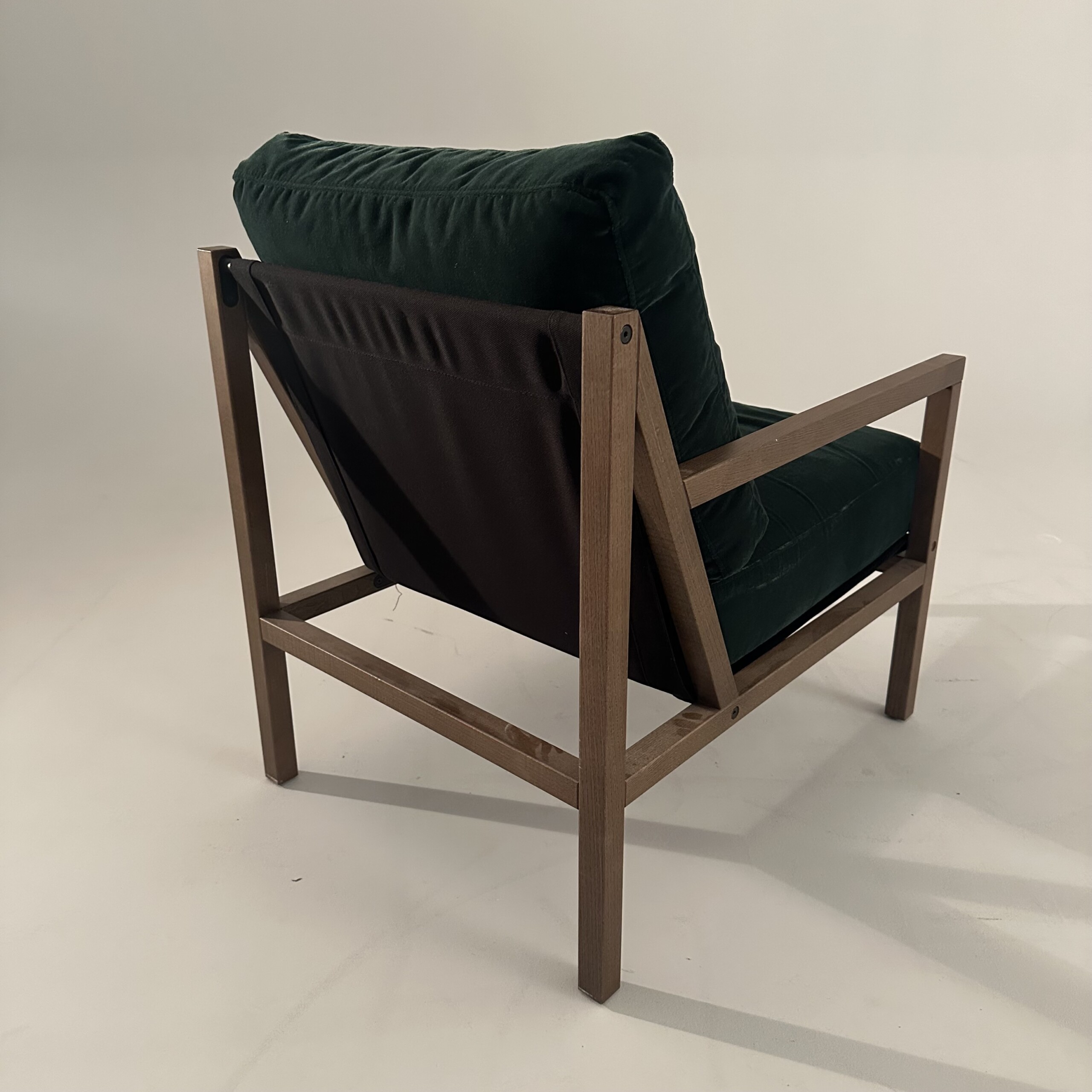 Sits och rygg i tyg (grön). Ben i trä (bok).