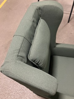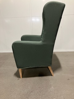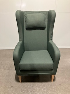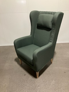 Sits och rygg i tyg (grön). Ben i trä (ek).