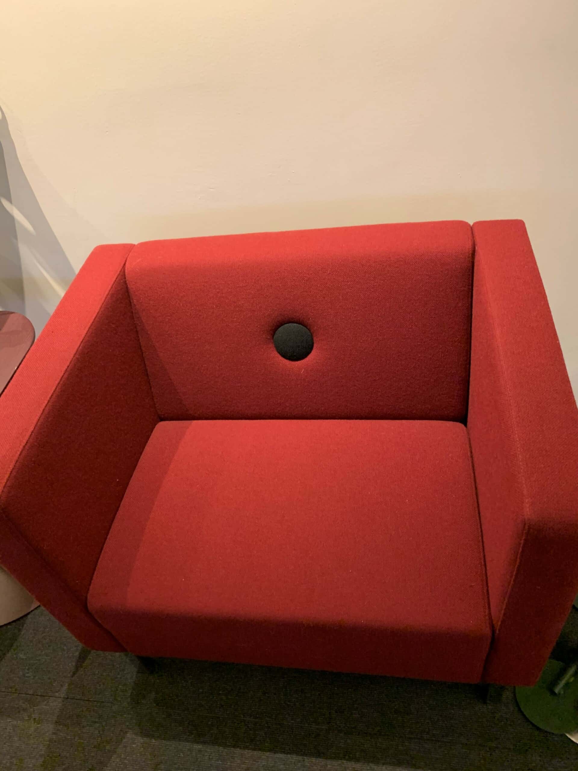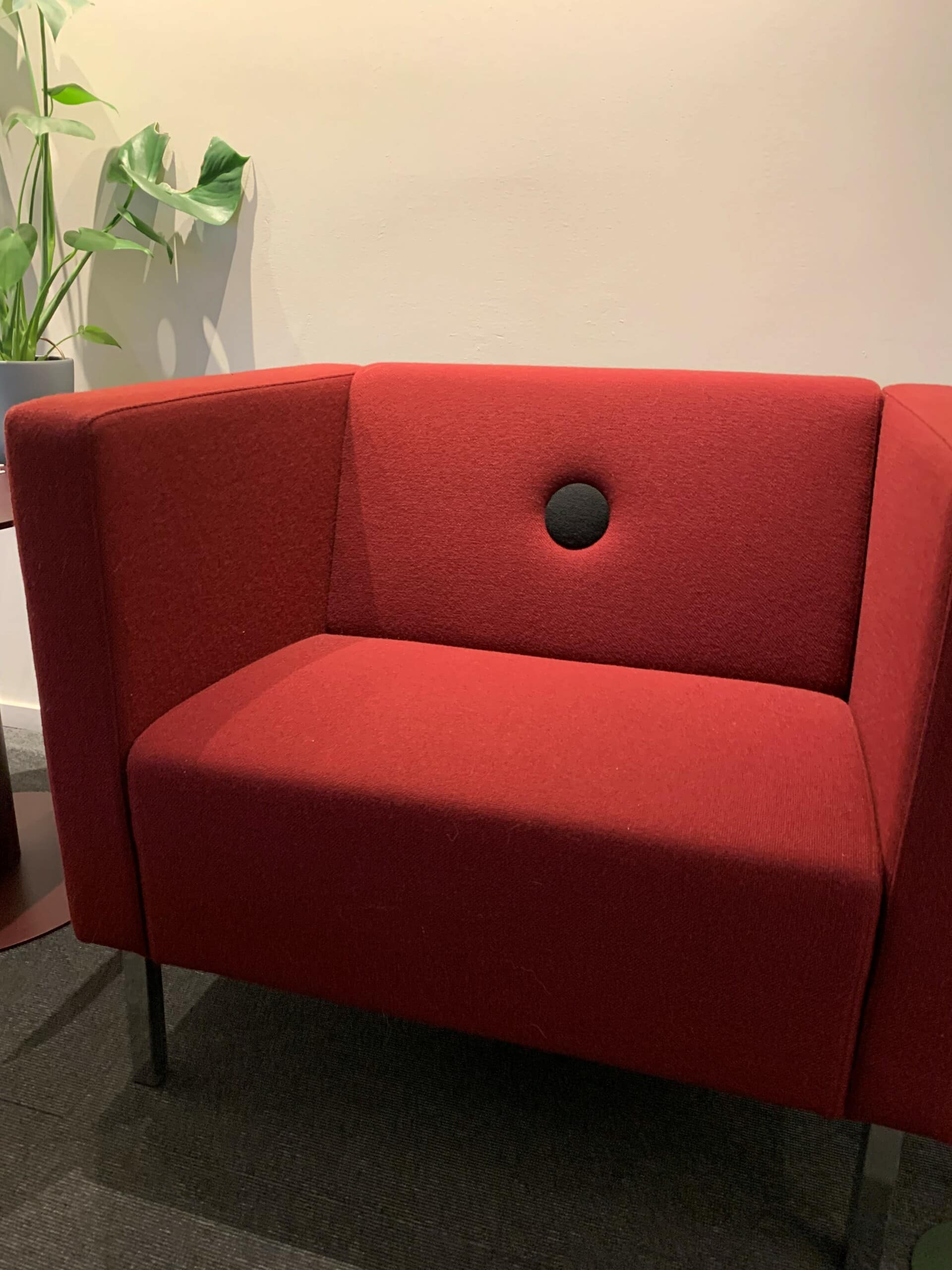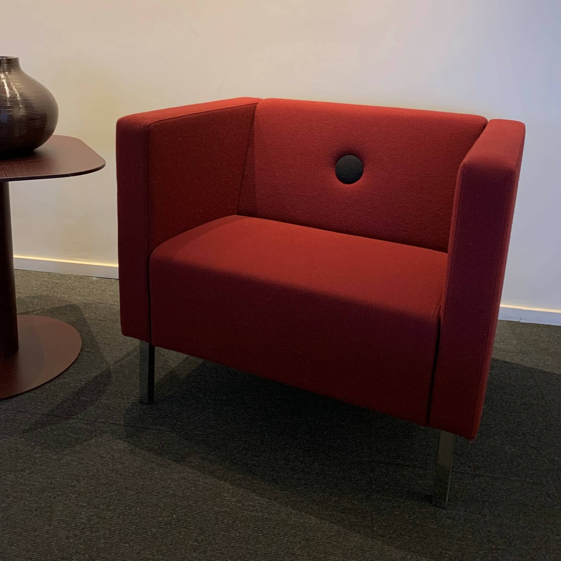 Sits och rygg i tyg (röd). Ben i metall (silver).
