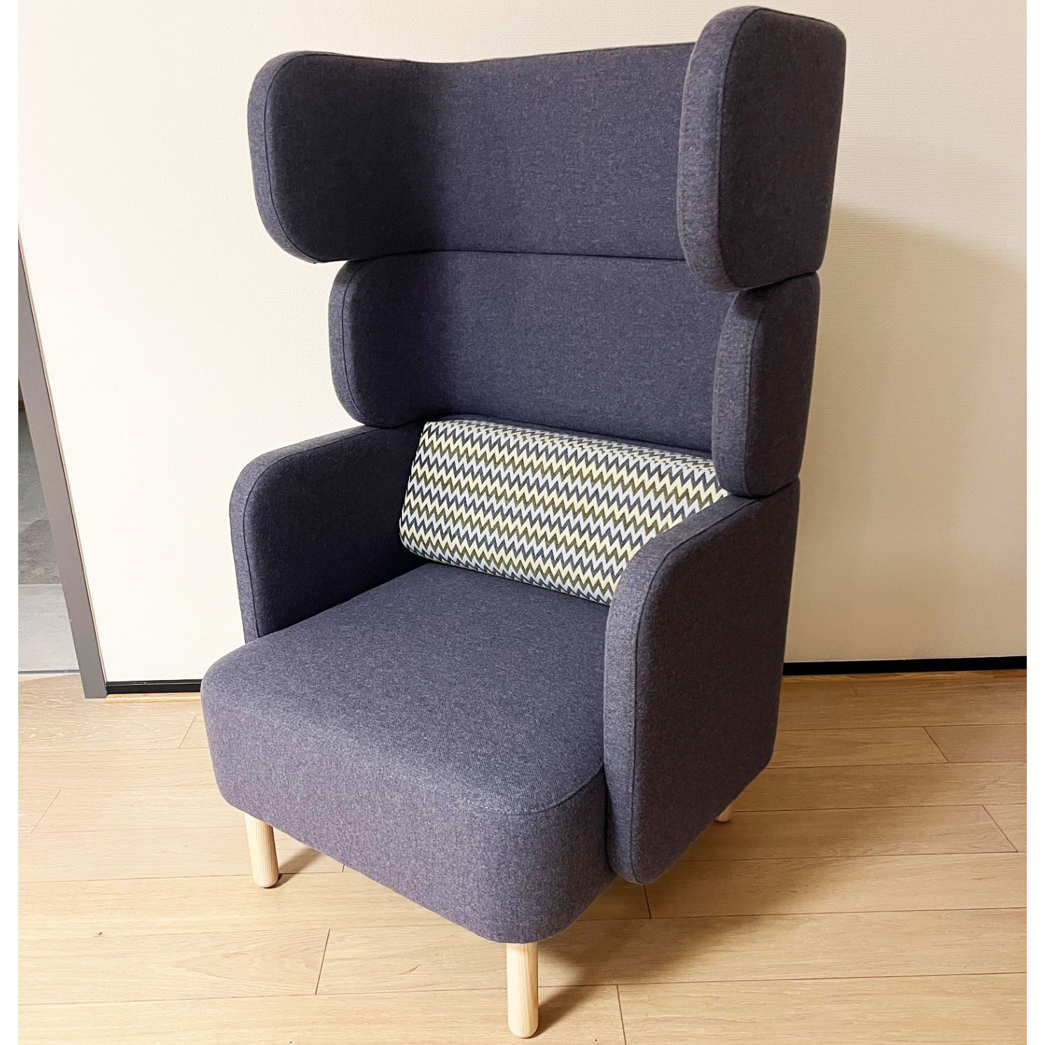 Sits och rygg i tyg (blå). Ben i trä (ask).