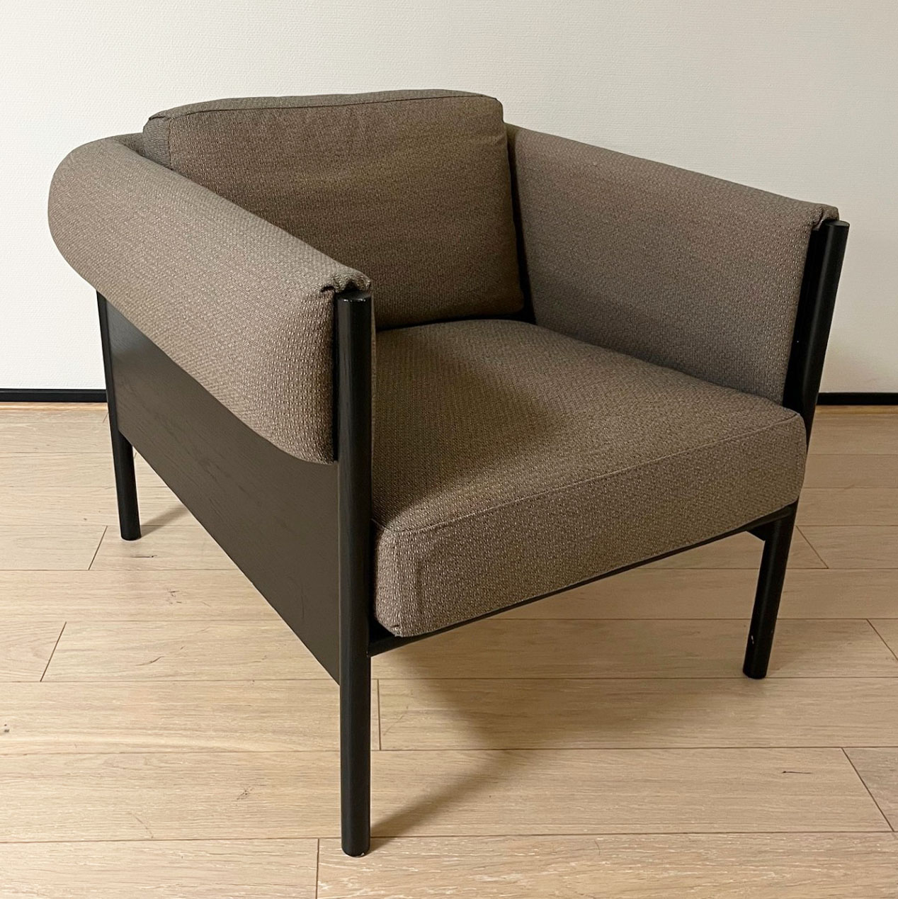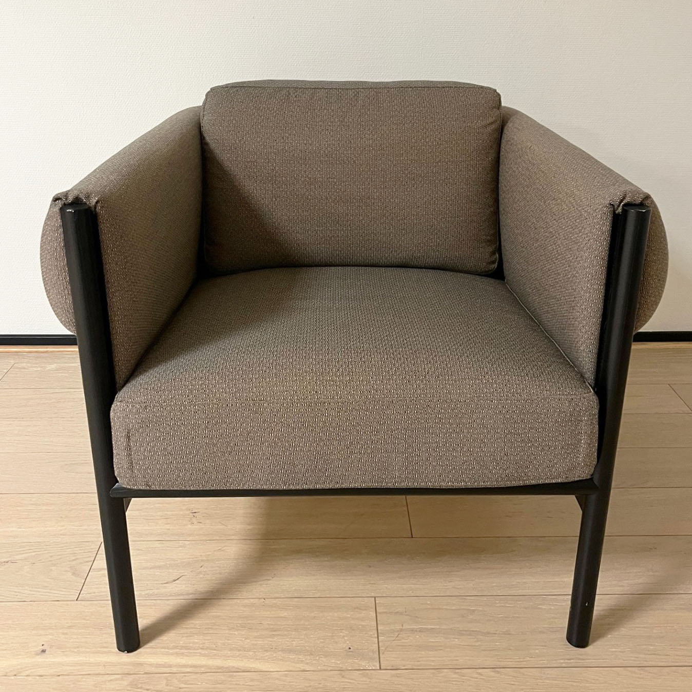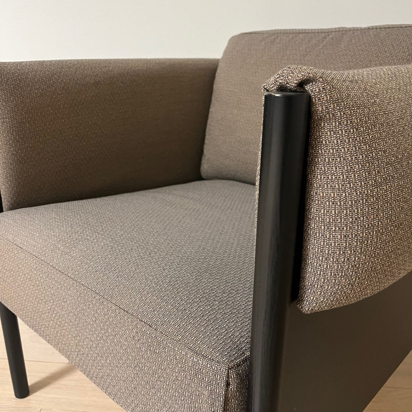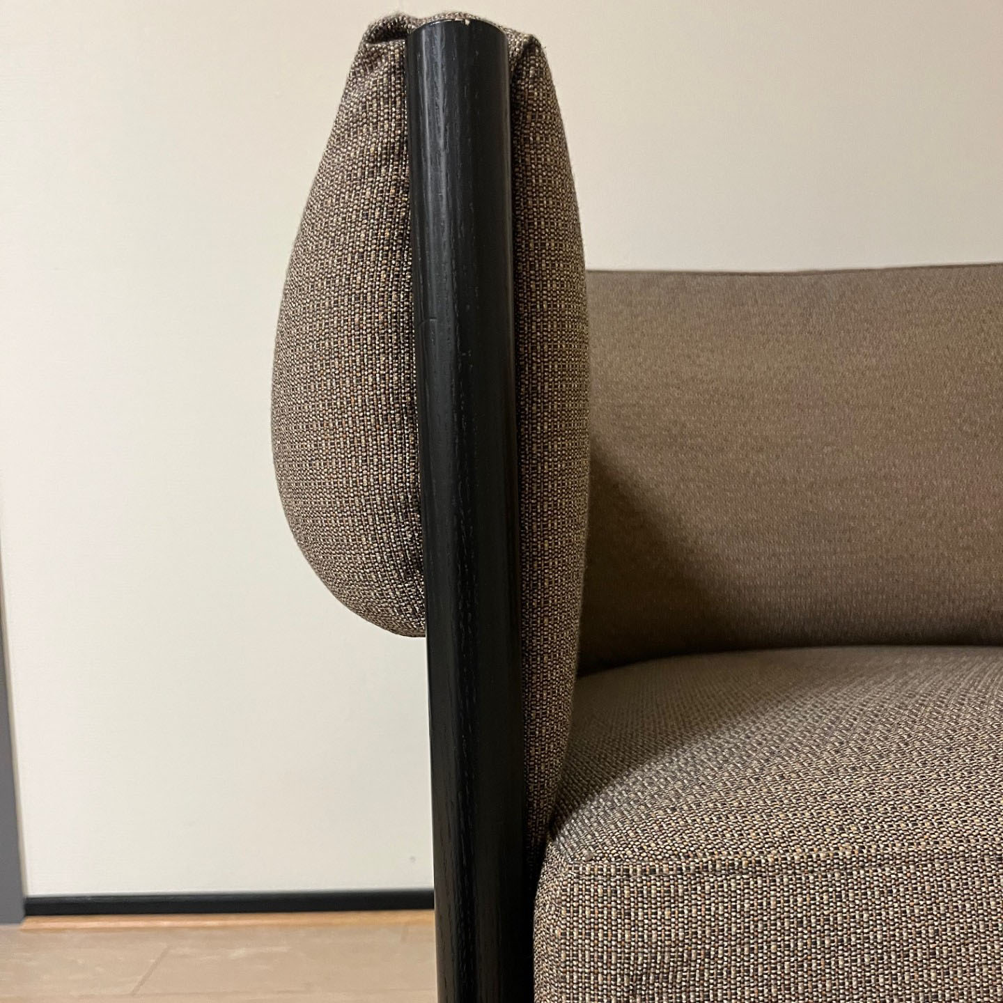 Sits och rygg i tyg (brun). Ben i trä (svart).