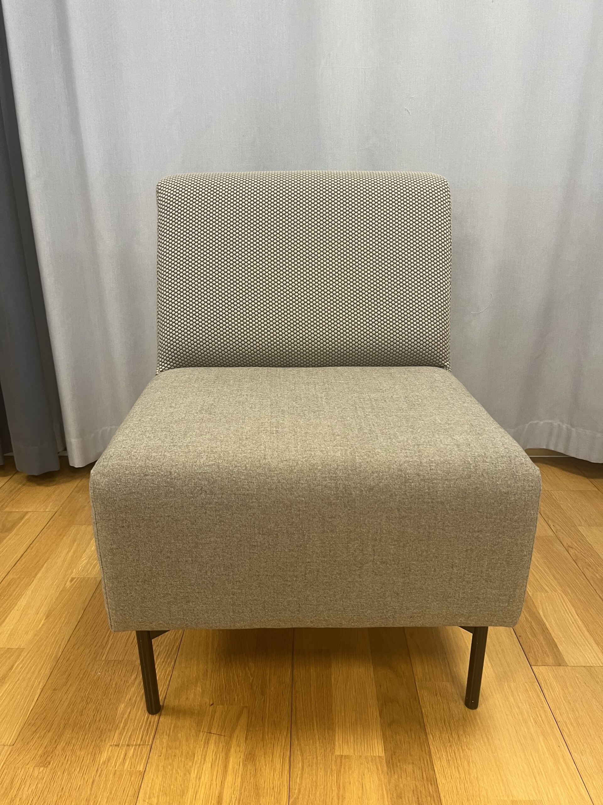 Sits i tyg (beige). Rygg i tyg (grön). Ben i metall (svart).