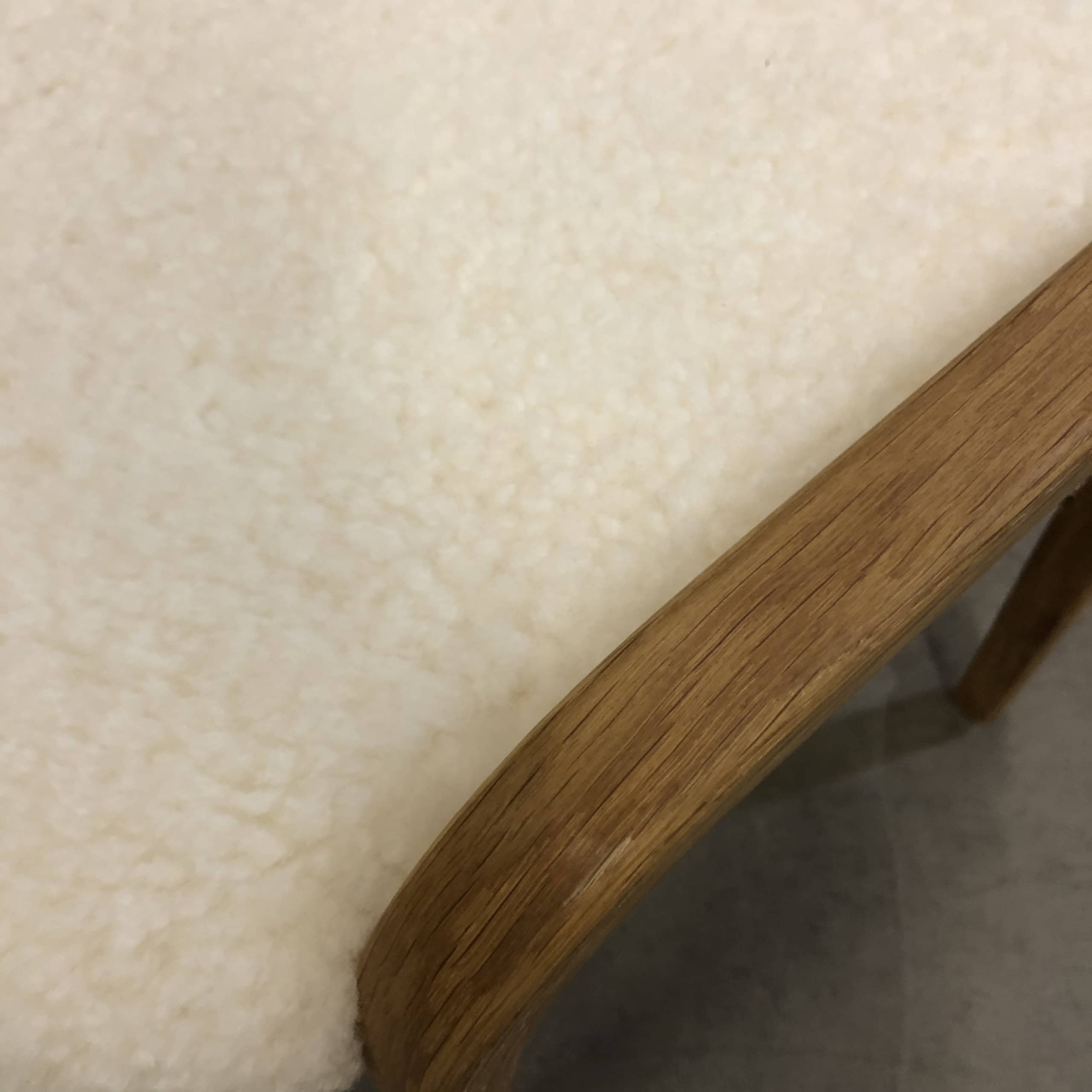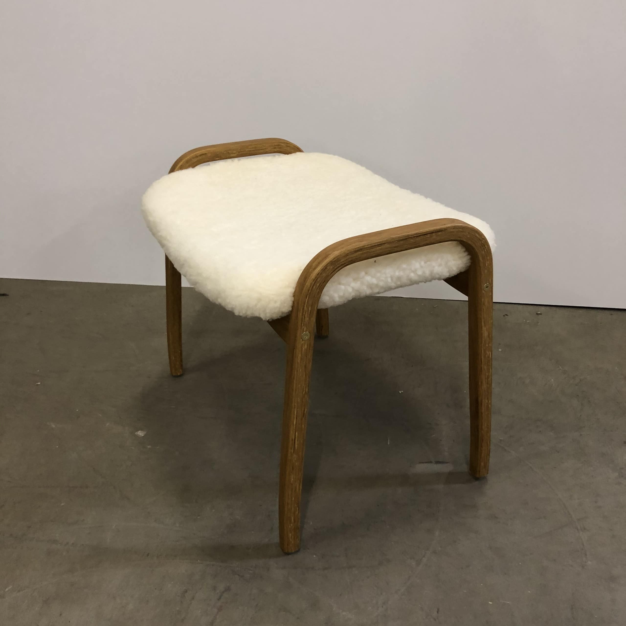 Sits i fårskinn (vit). Ben i trä (ek).