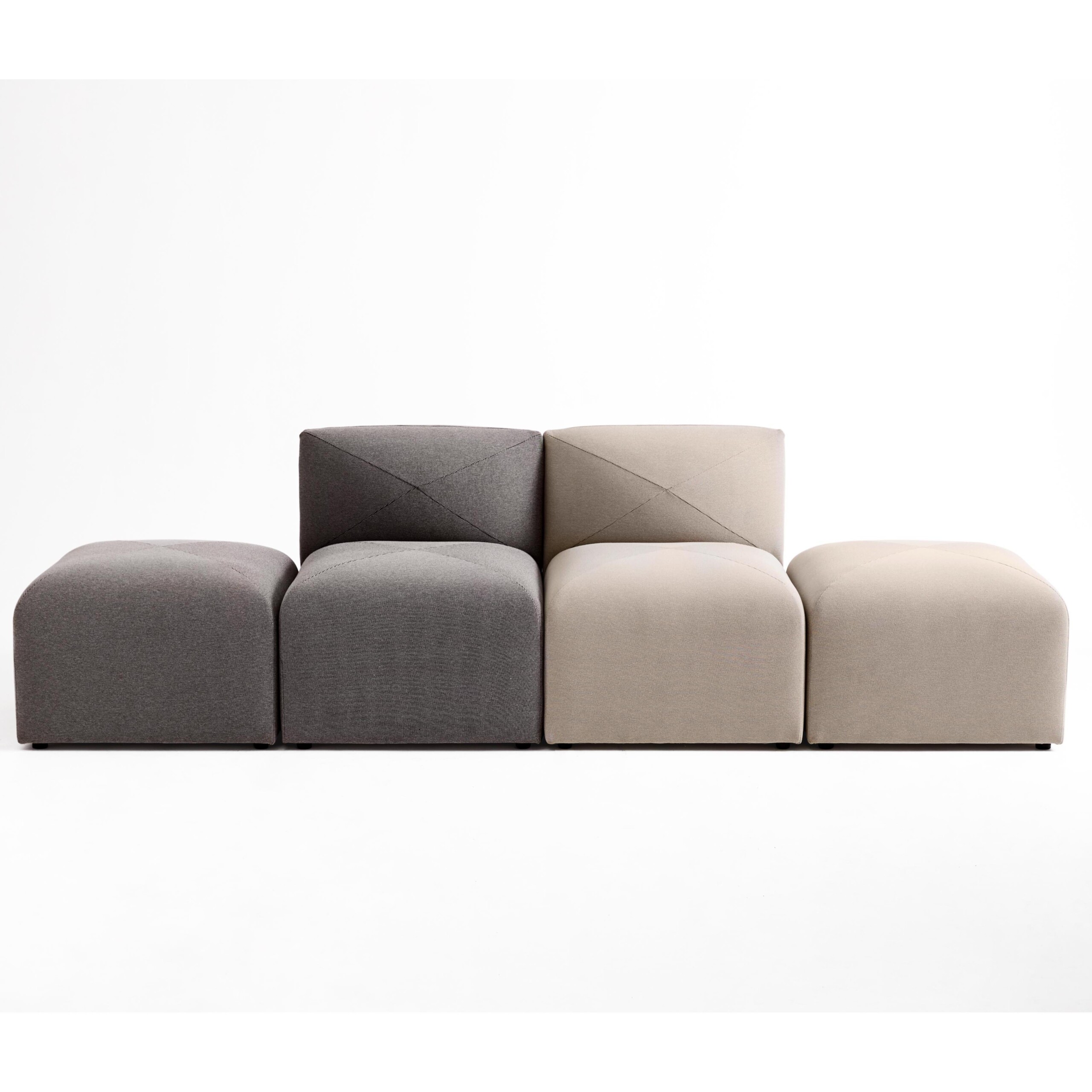 Sits i tyg (beige). Ben i plast (svart).