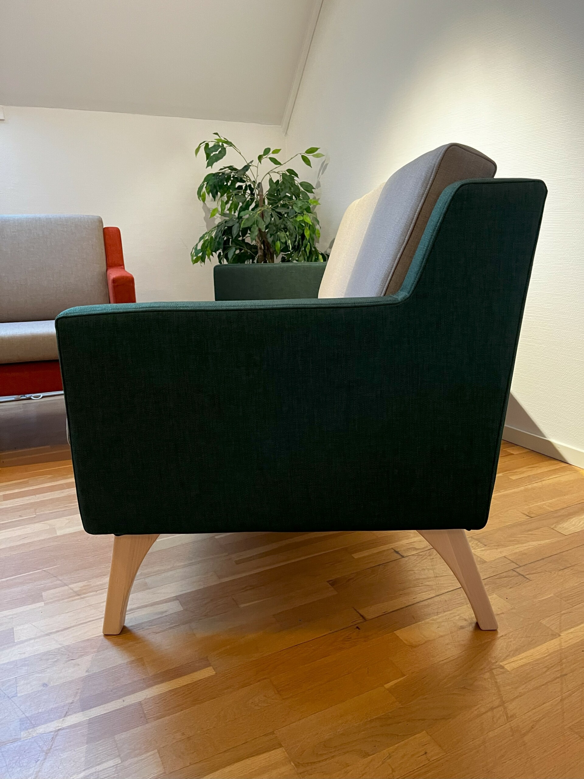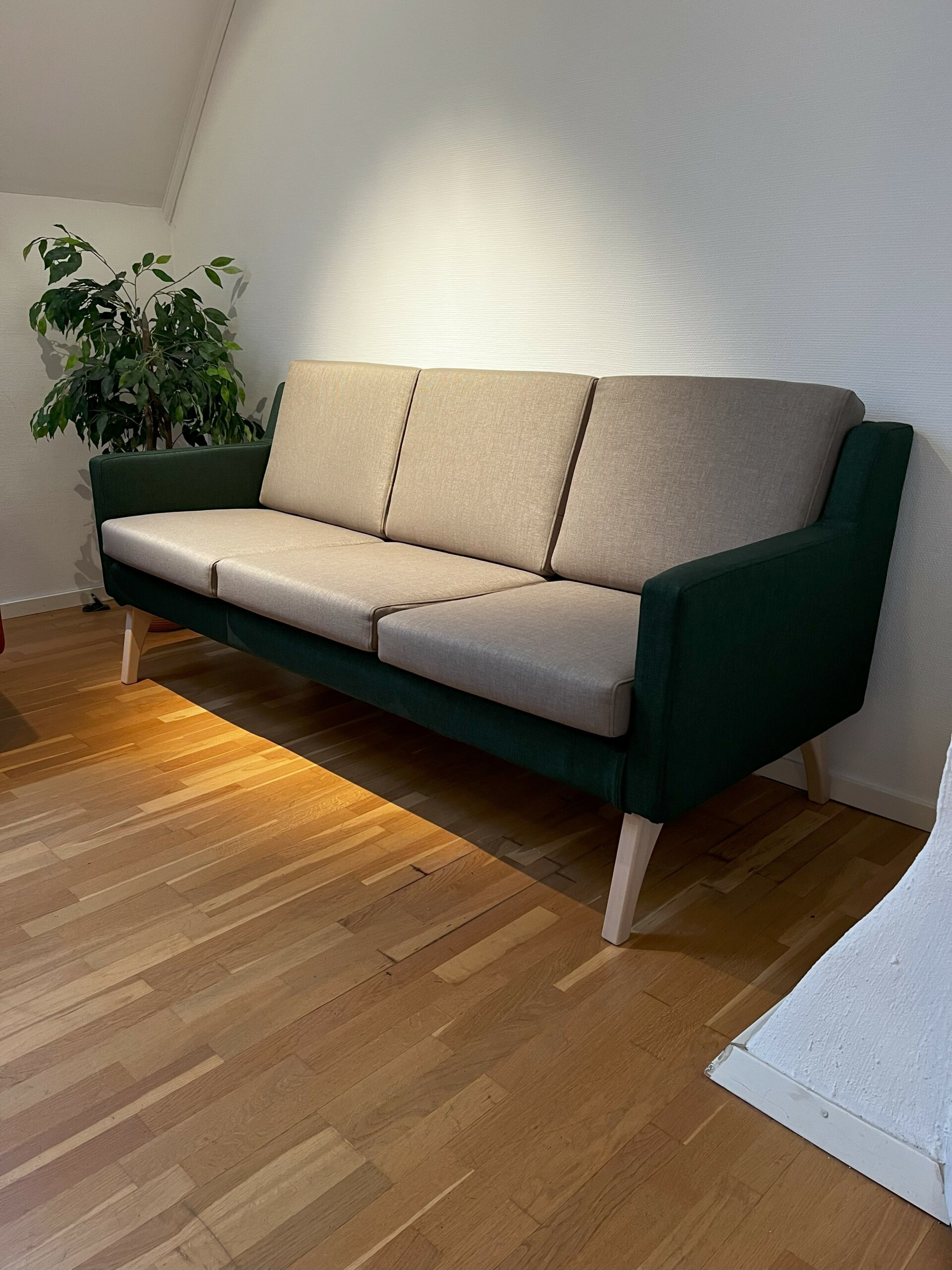Sits och rygg i tyg (beige). Ben i trä (björk).