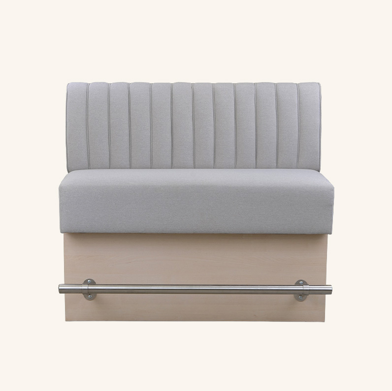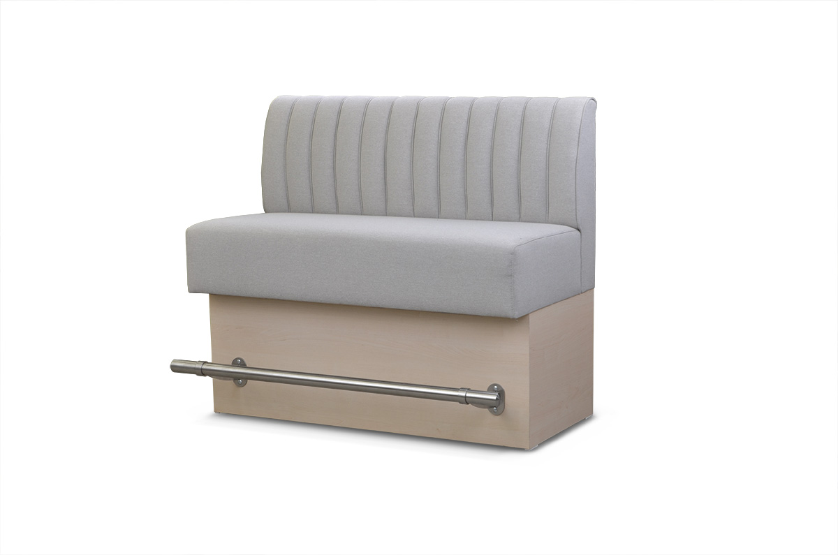 Sits och rygg i tyg (grå). Sockel i trä (björk).