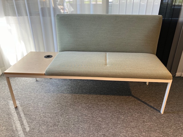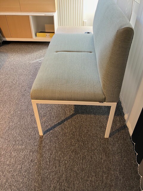 Sits och rygg i tyg (grön). Ben i metall (vit).