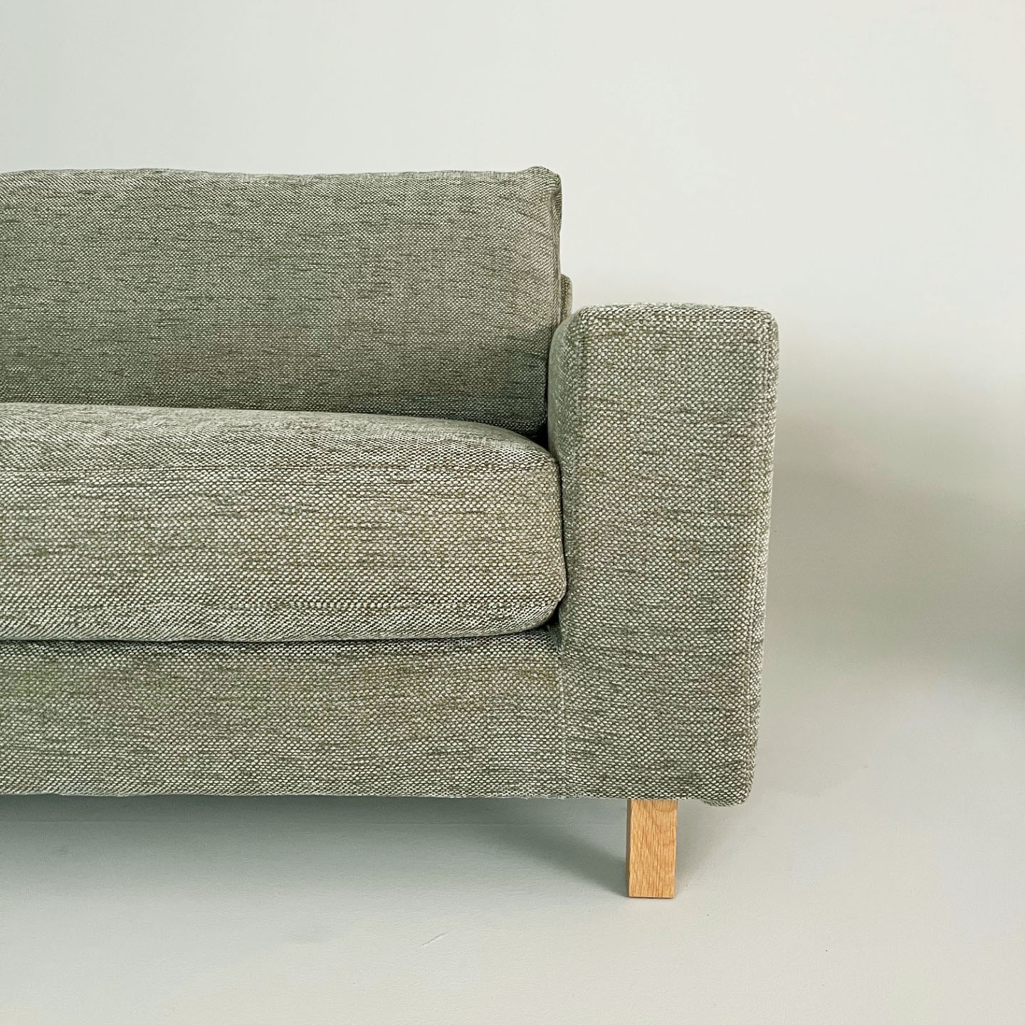 Sits och rygg i tyg (grön). Ben i trä (ek).