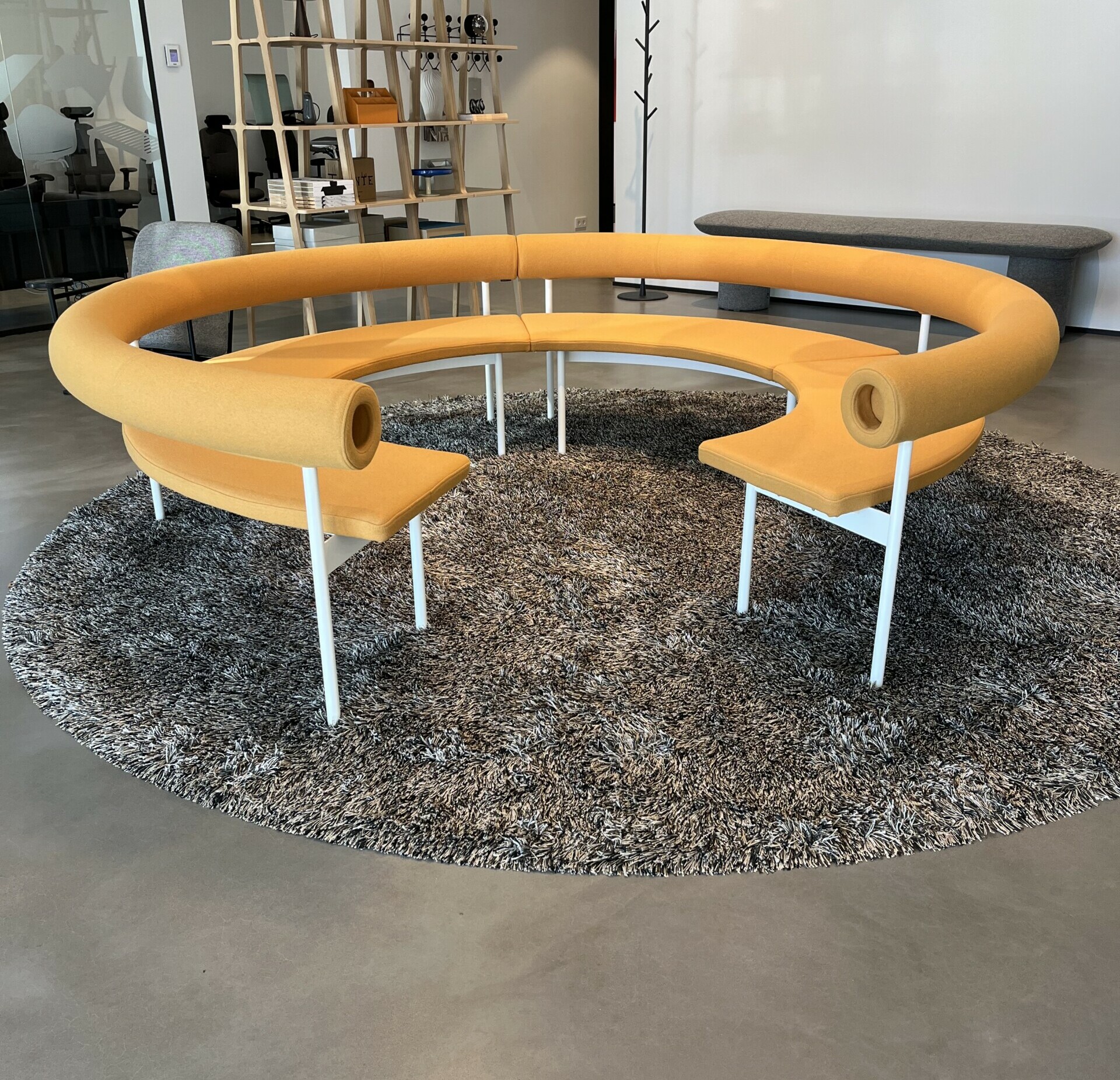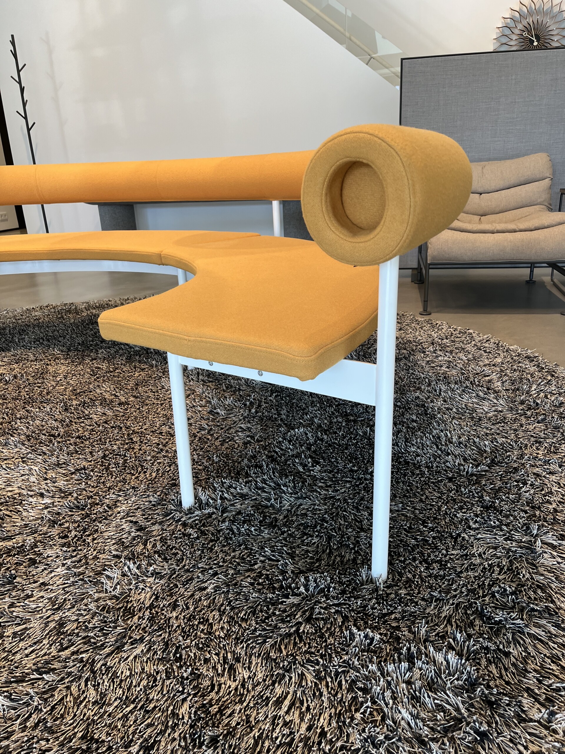 Sits och rygg i tyg (gul). Ben i metall (vit).
