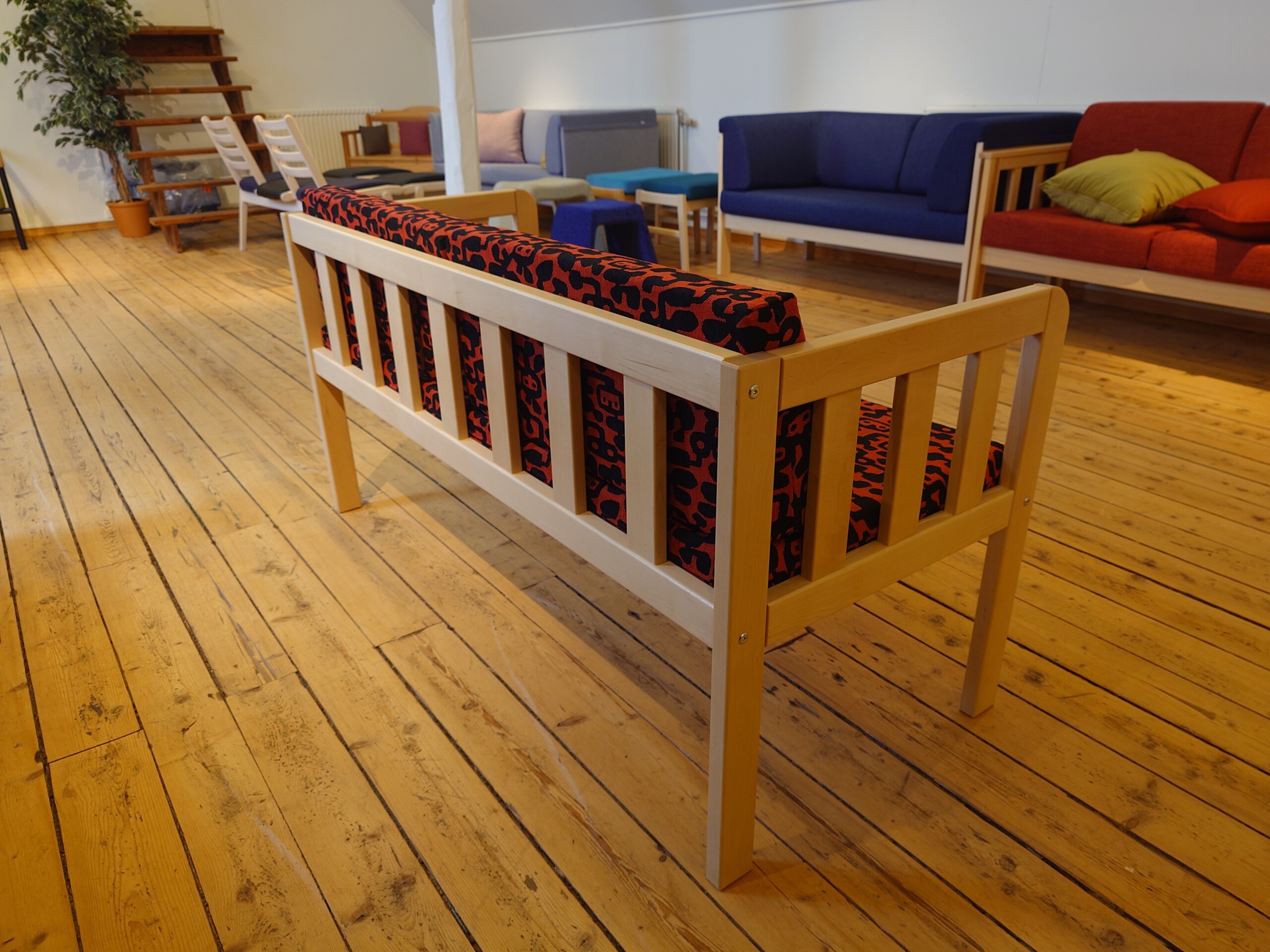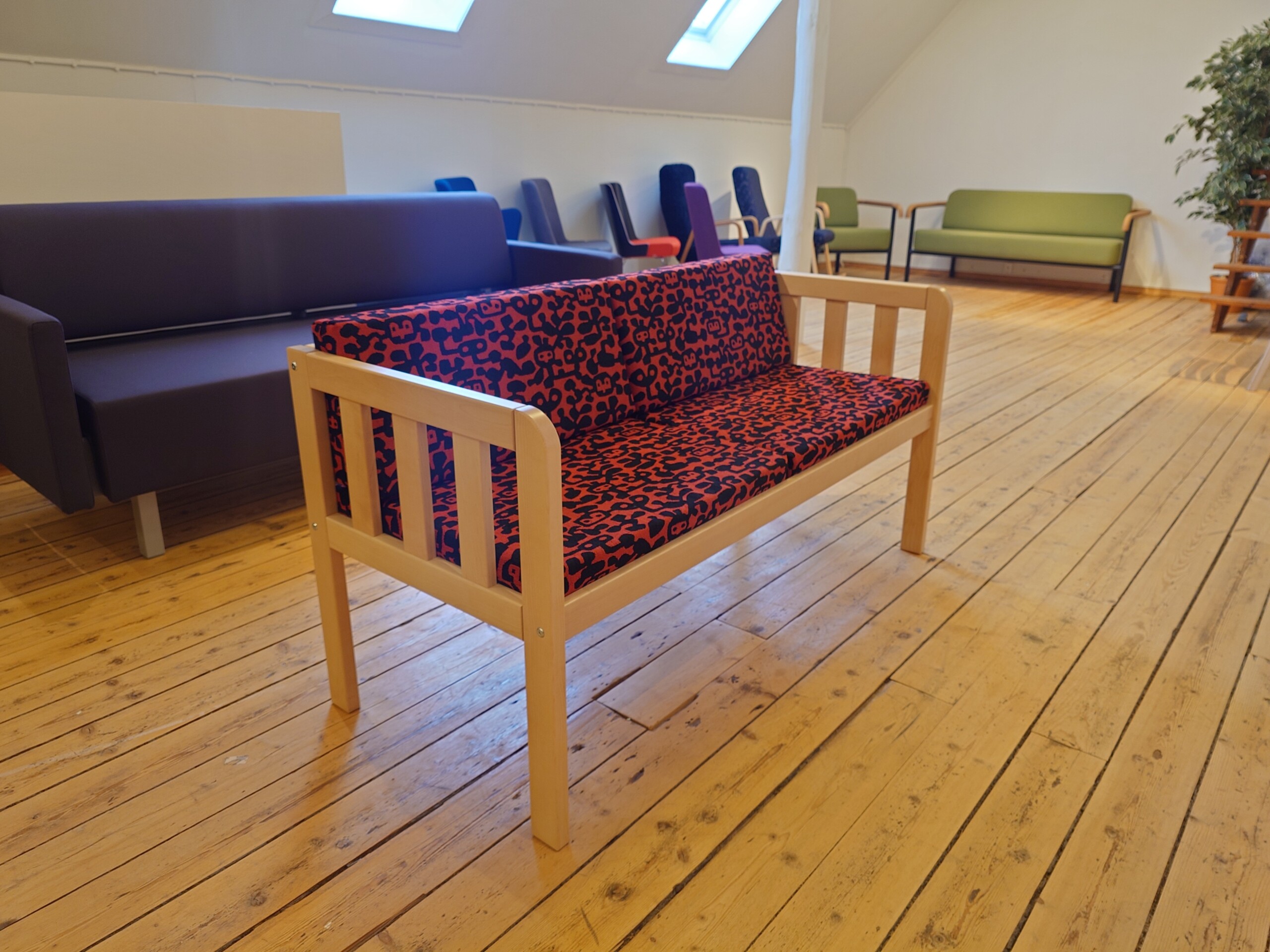Sits och rygg i tyg (röd). Ben i trä (björk).