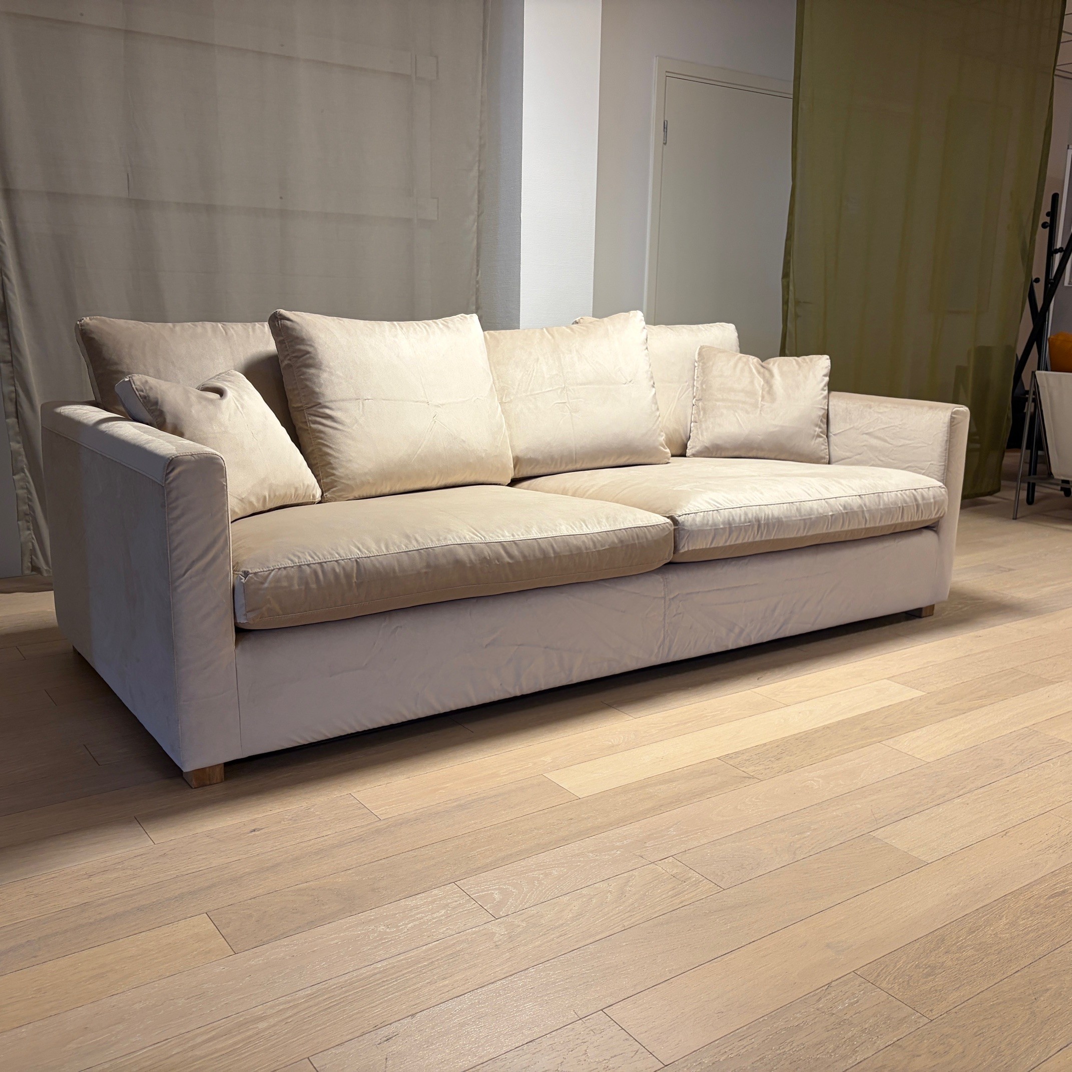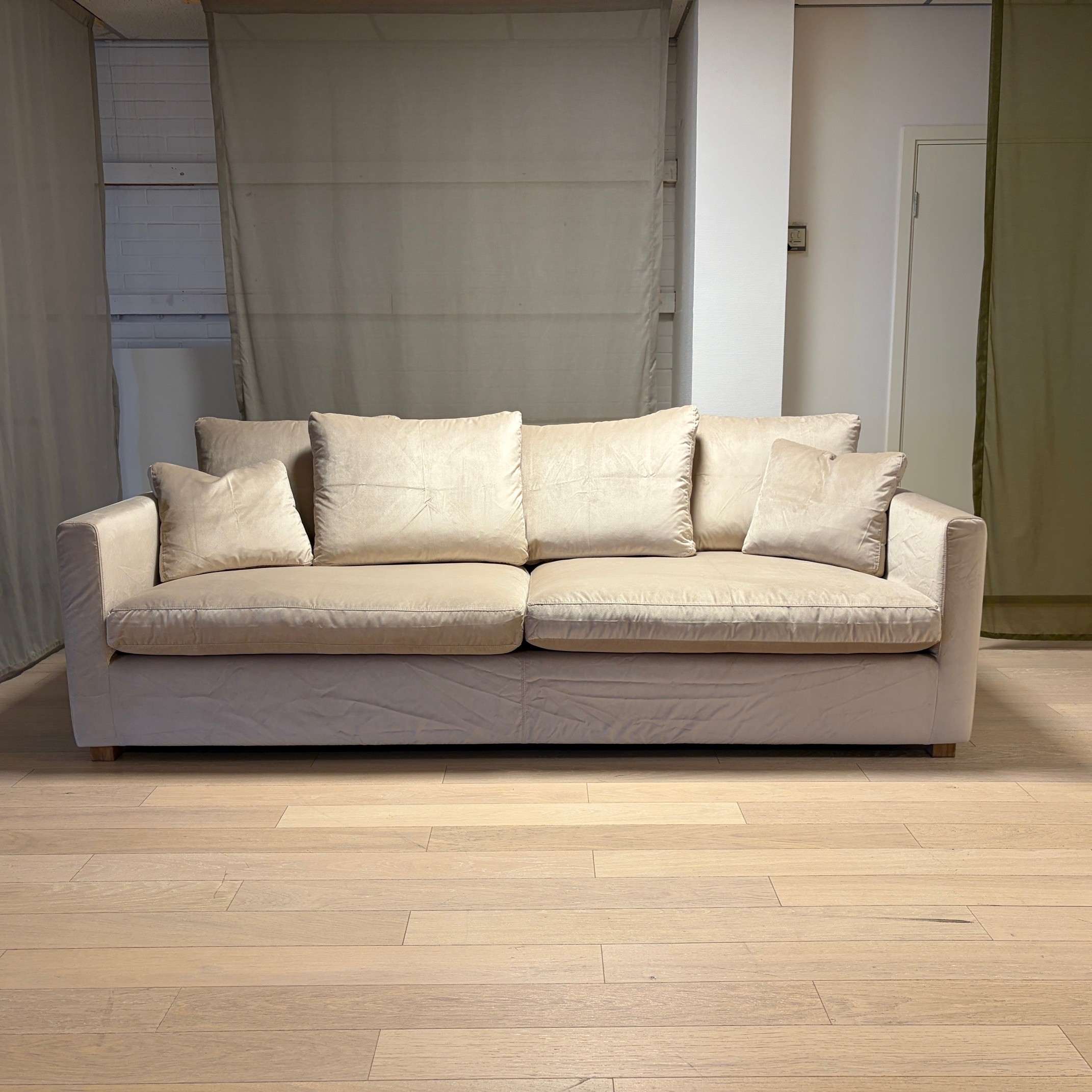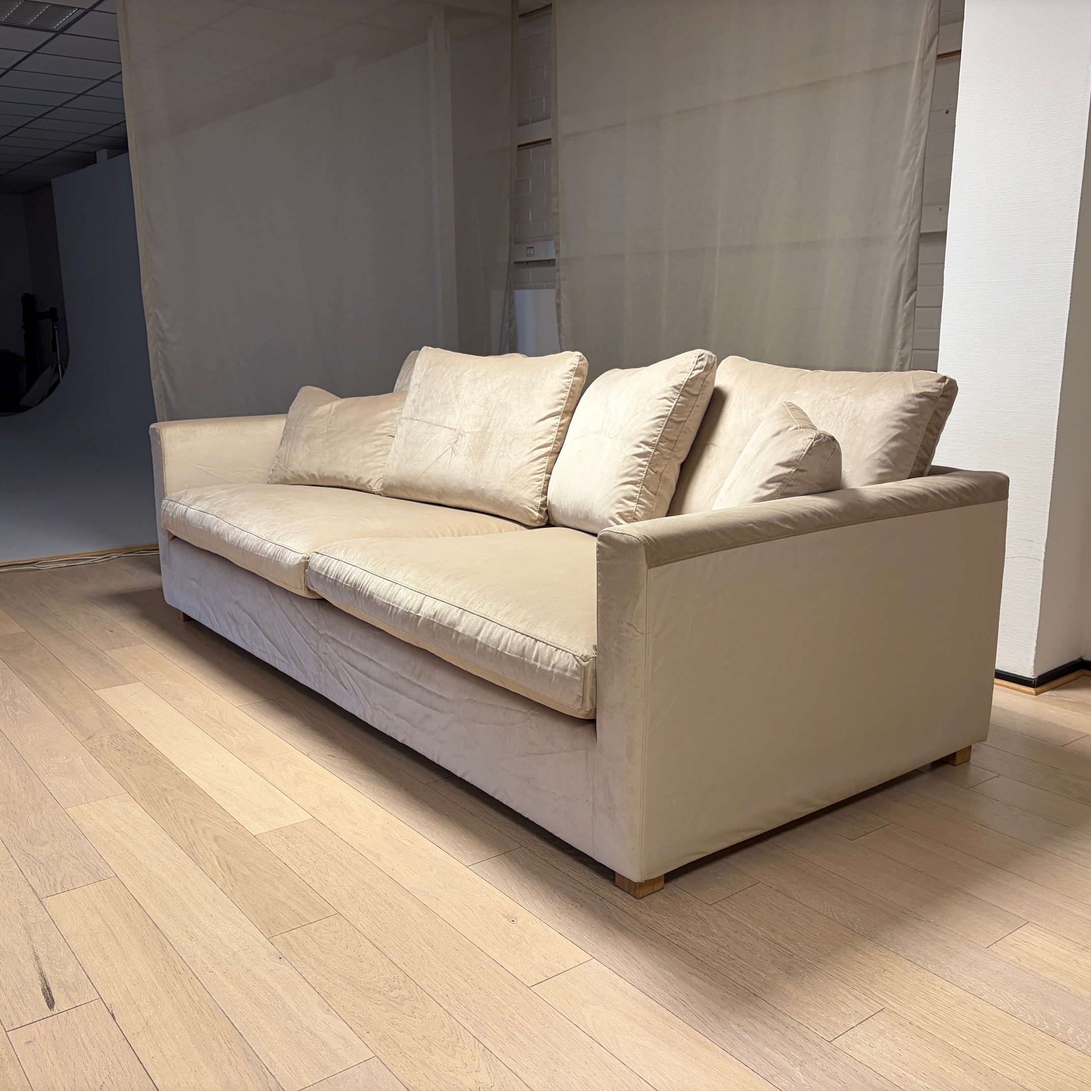 Sits och rygg i tyg (beige). Ben i trä (ek).