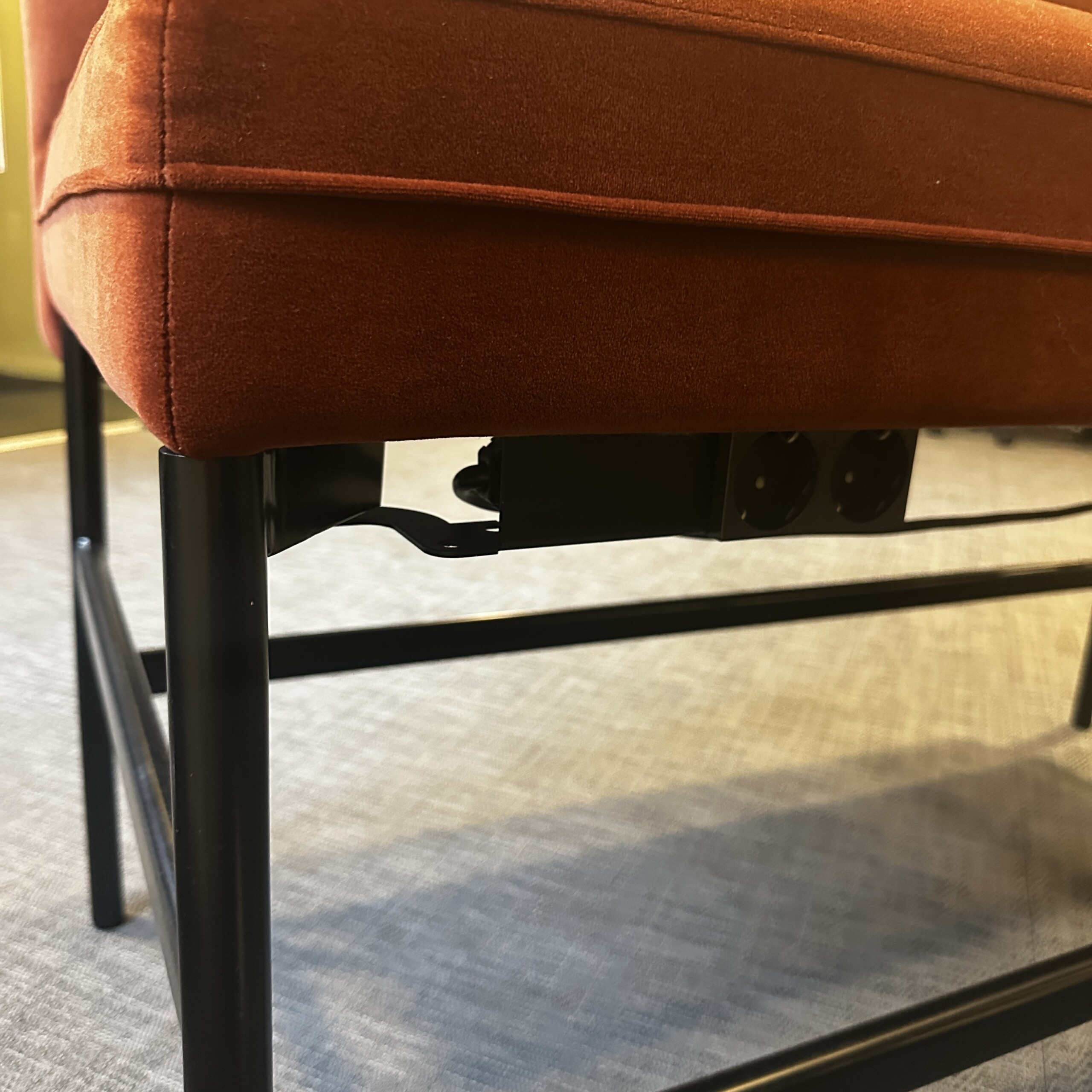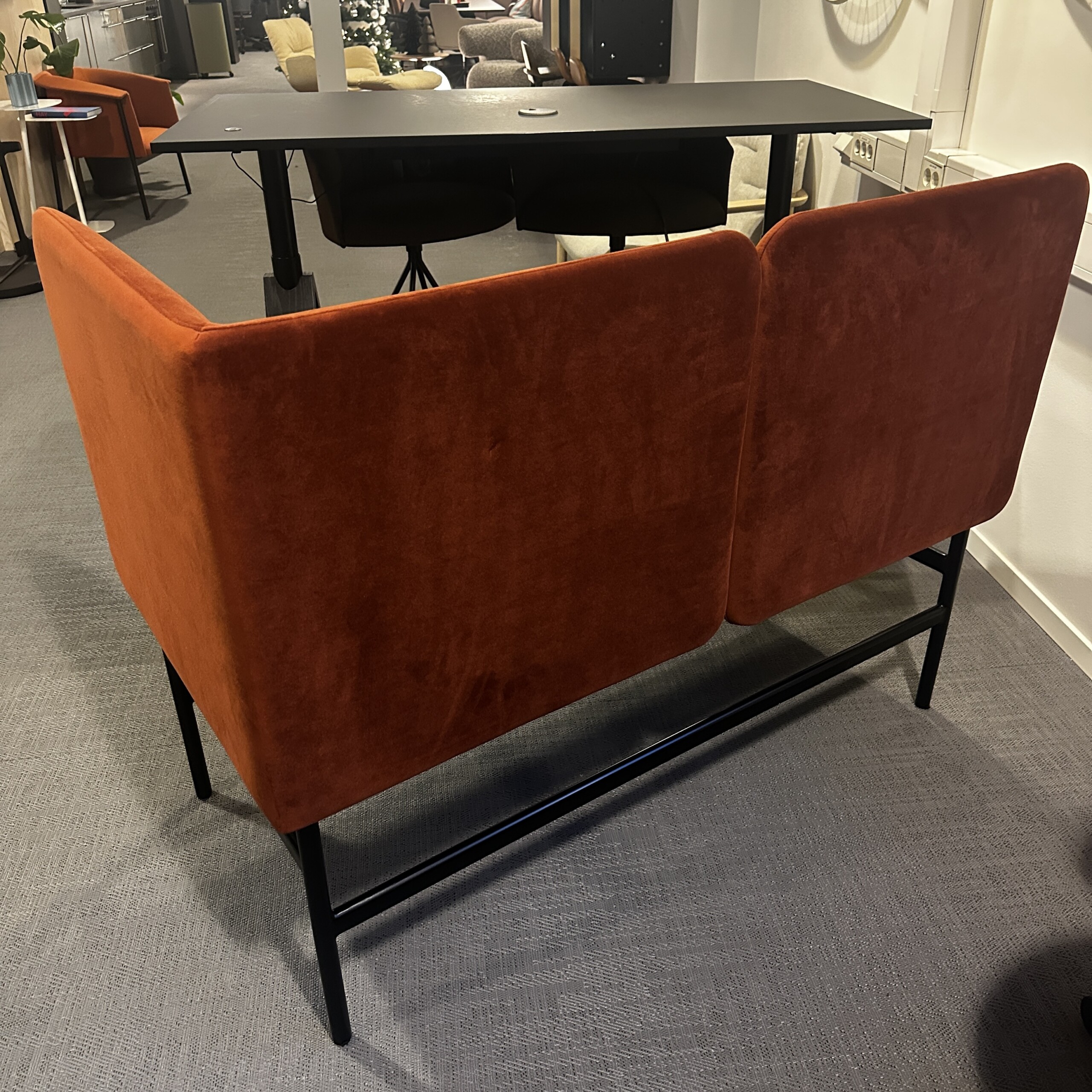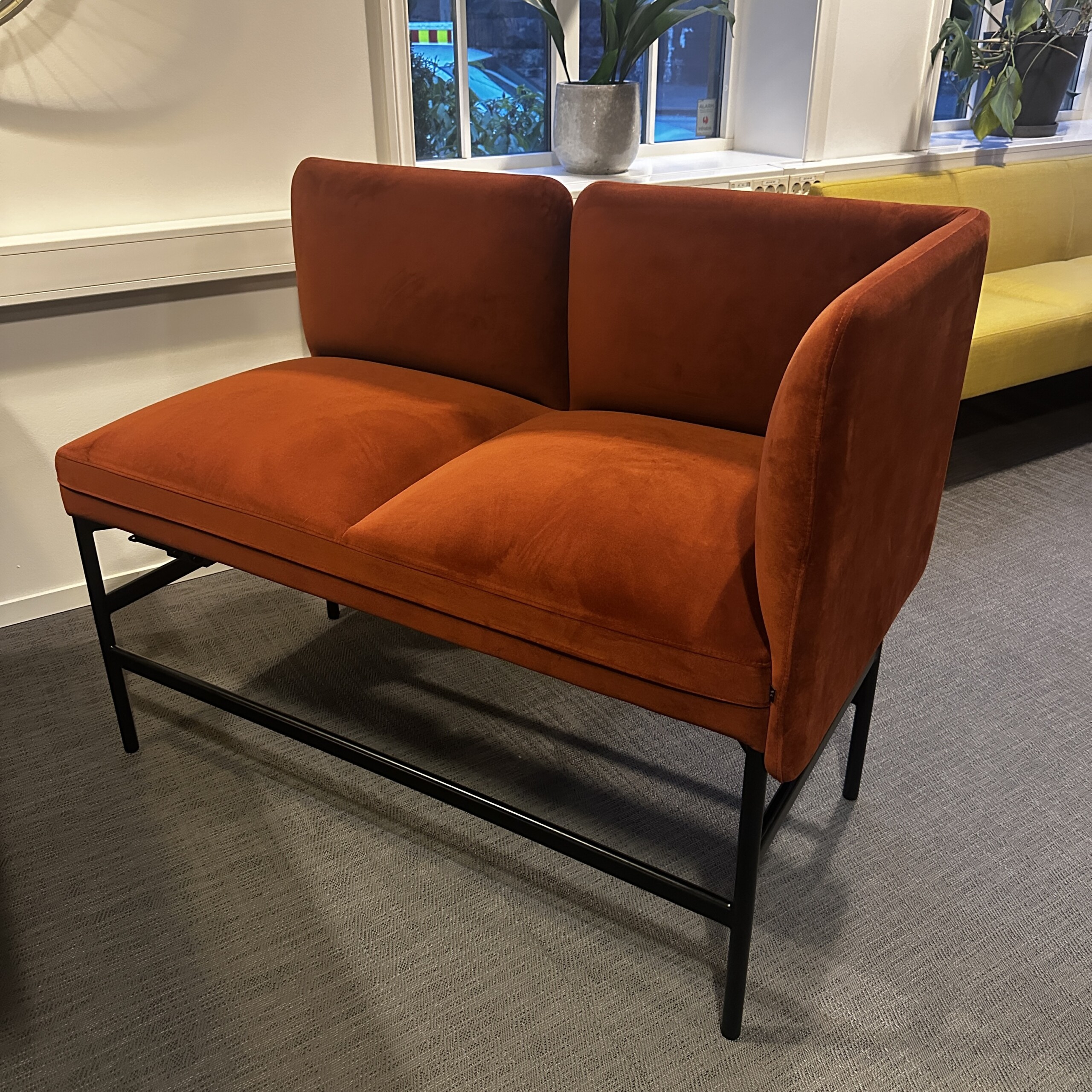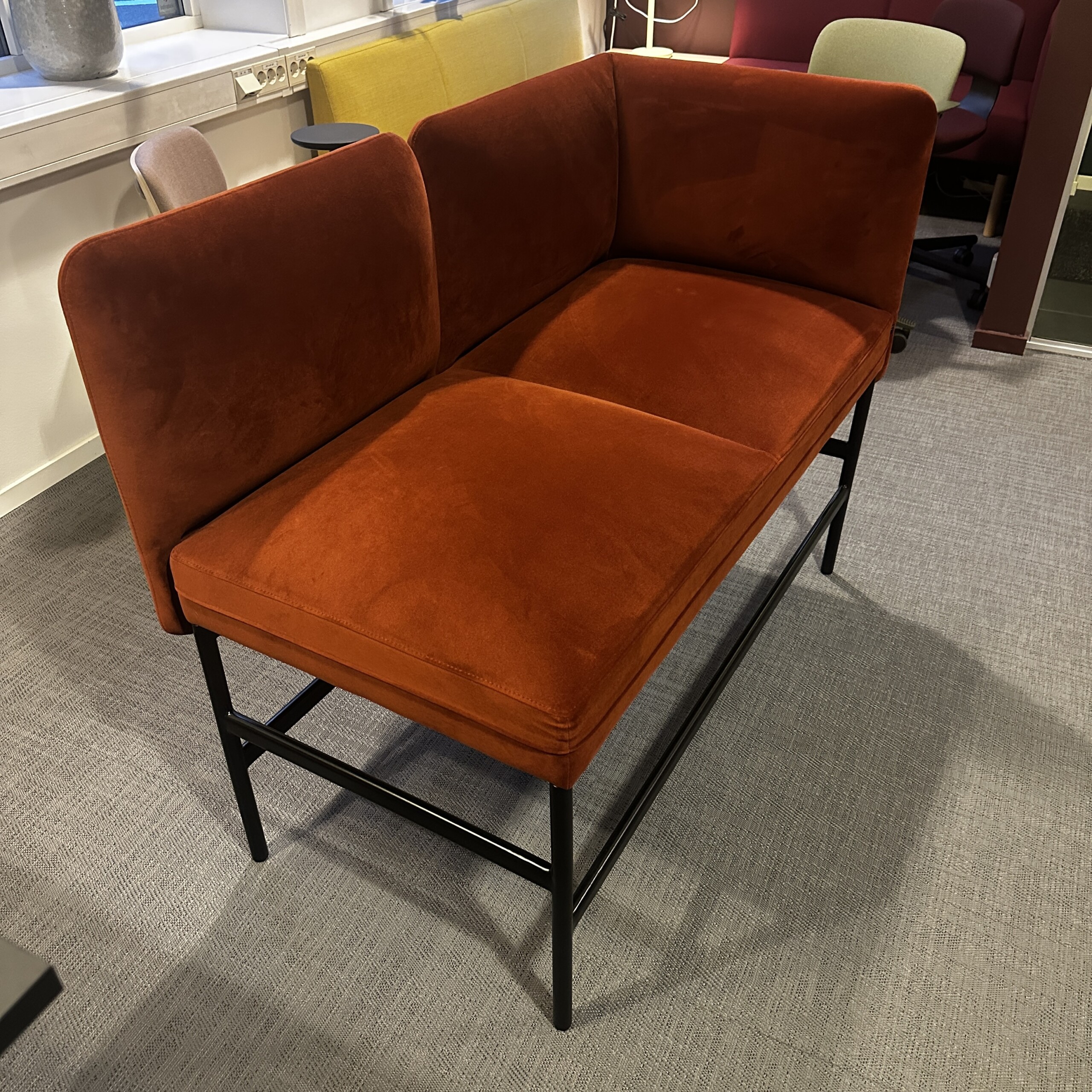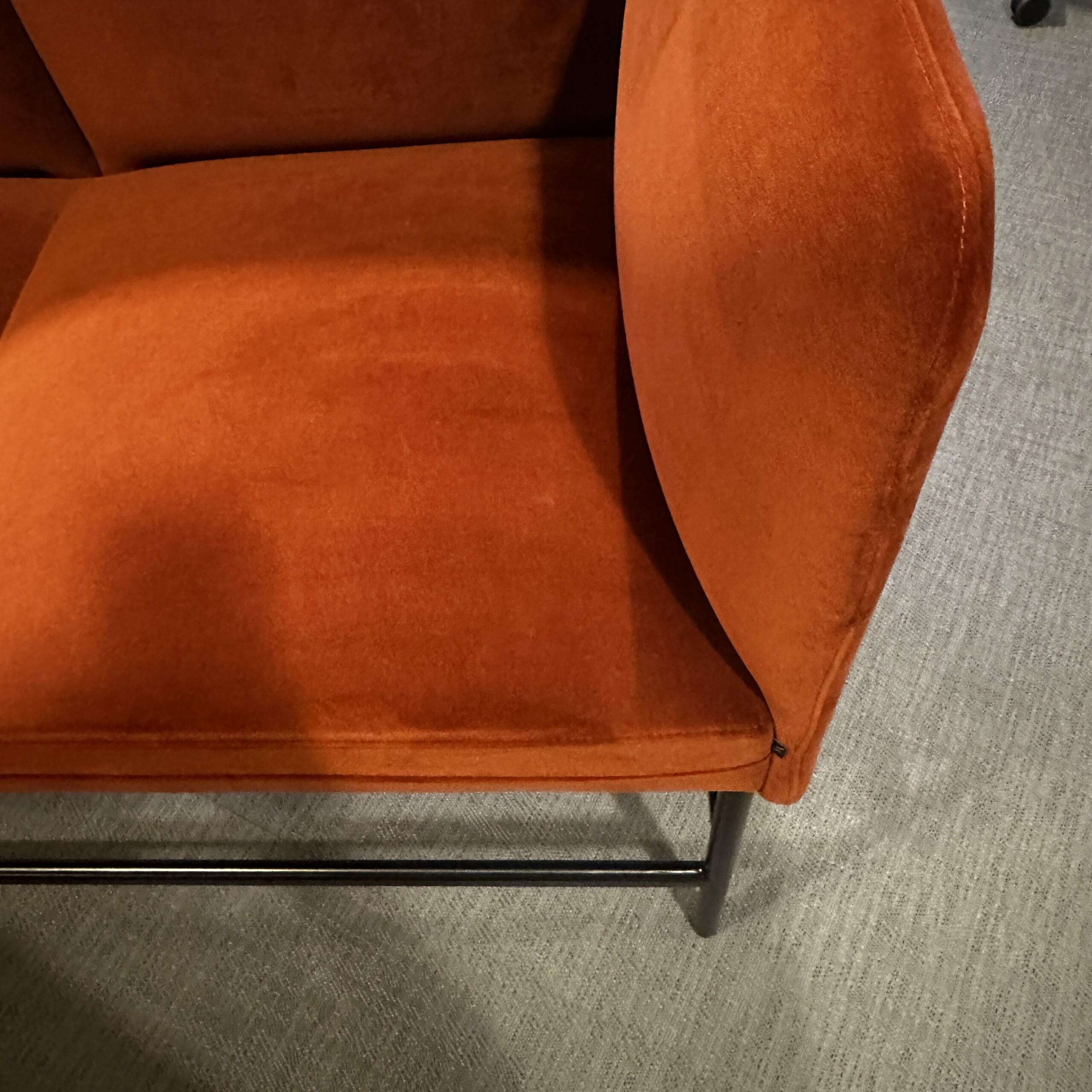 Sits och rygg i tyg (orange). Ben i metall (svart).